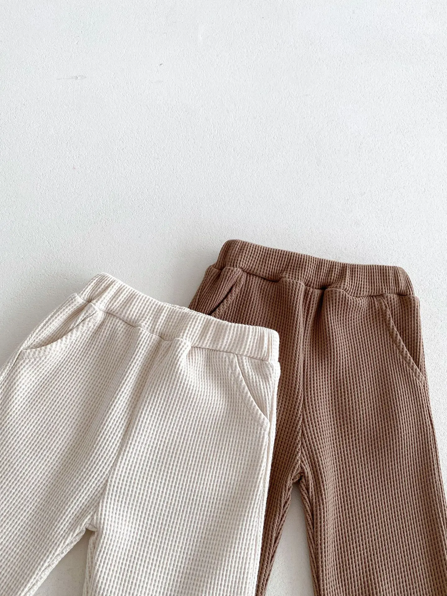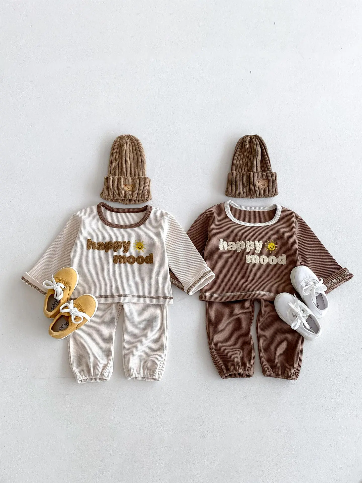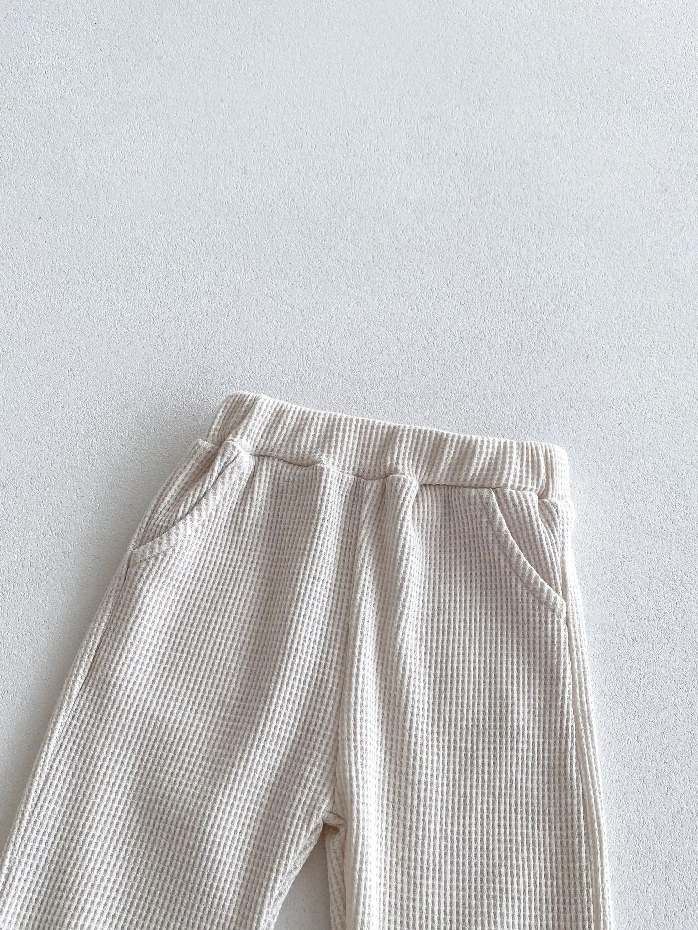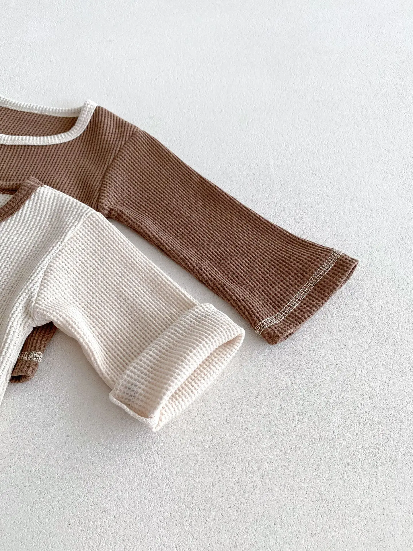 ベビーキッズセットアップ 2点セット ワッフル 長袖Tシャツ+ロングパンツ レターロゴワッペン 2カラー【mh0006367】