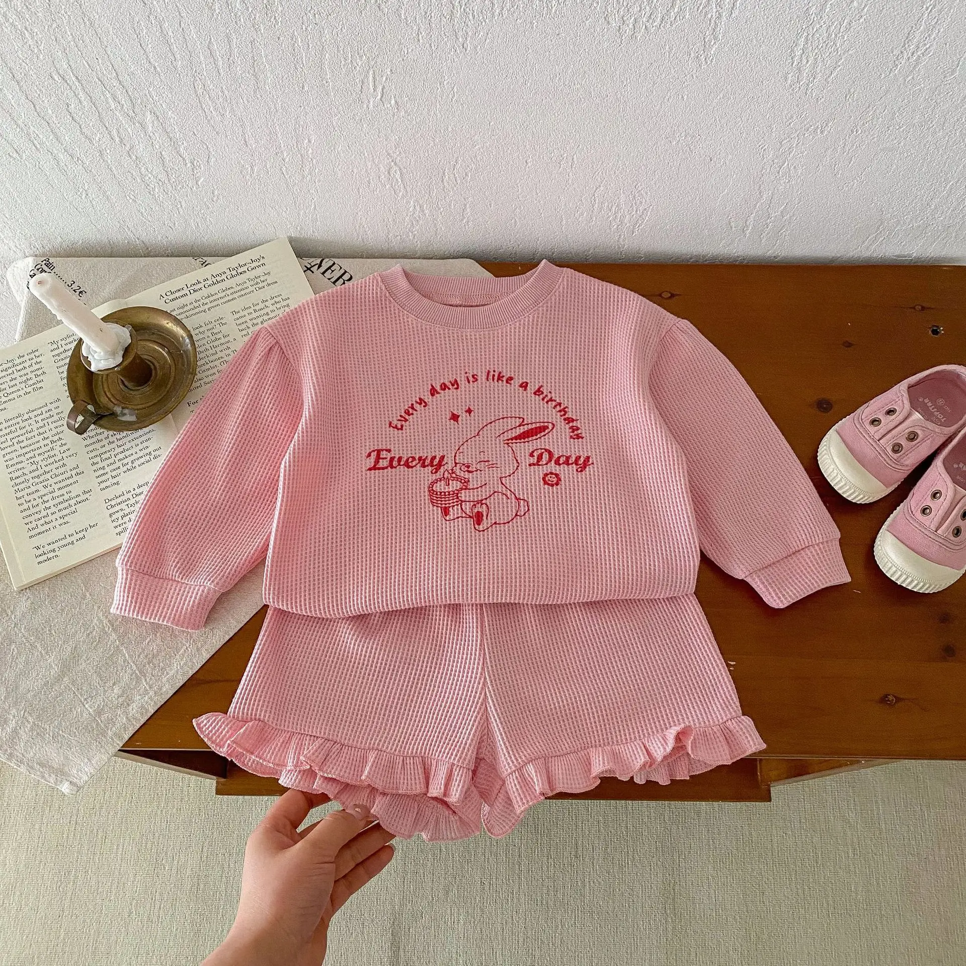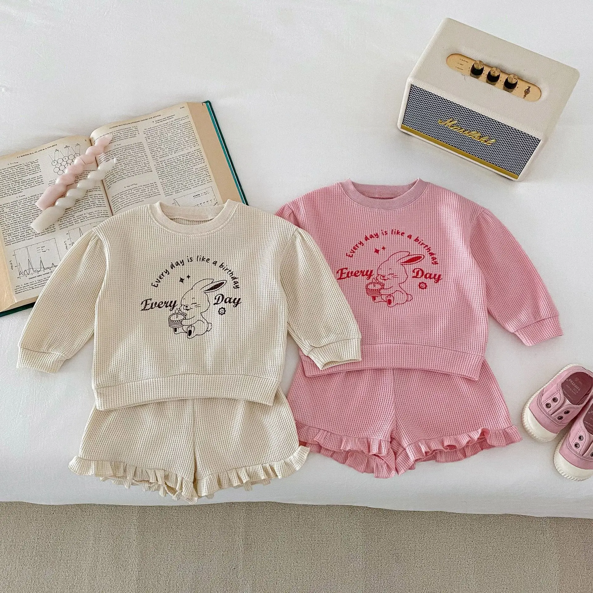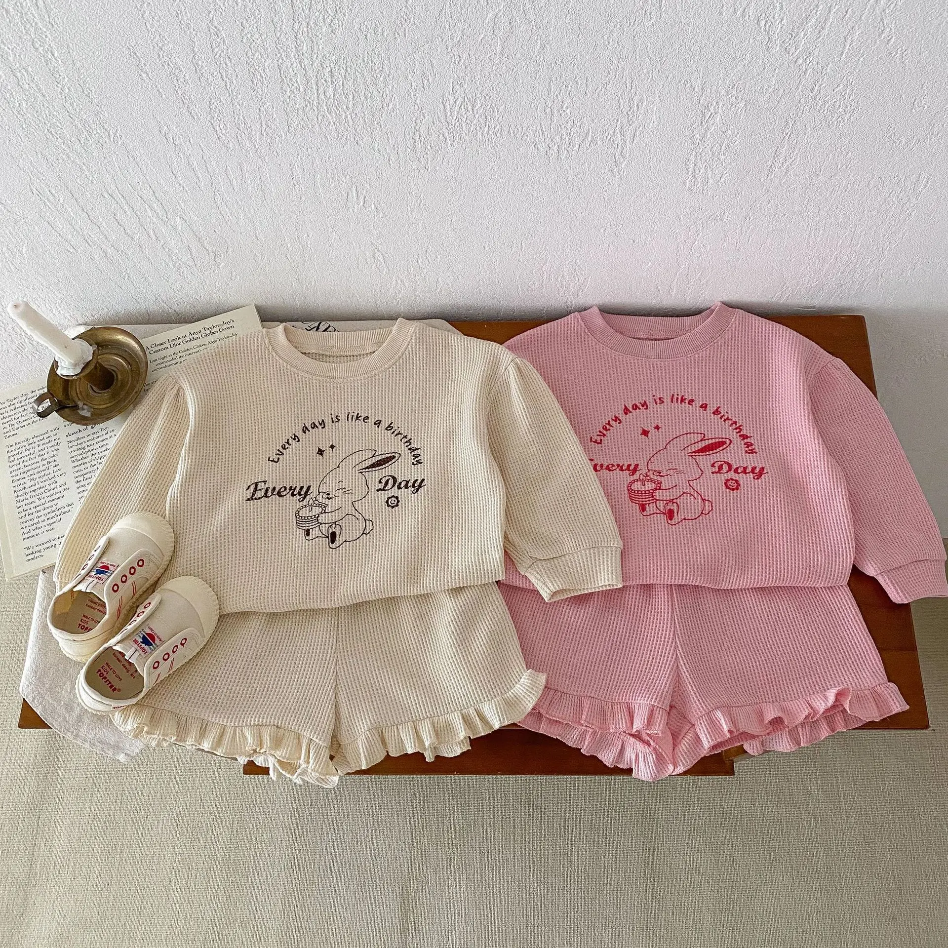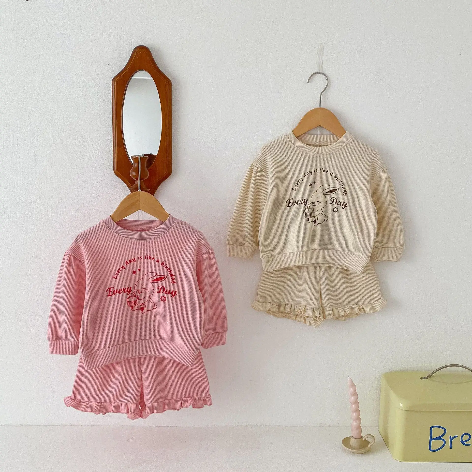 キッズセットアップ 2点セット ワッフル 長袖Tシャツ+フリルショートパンツ うさぎプリント 2カラー【mh0006377】