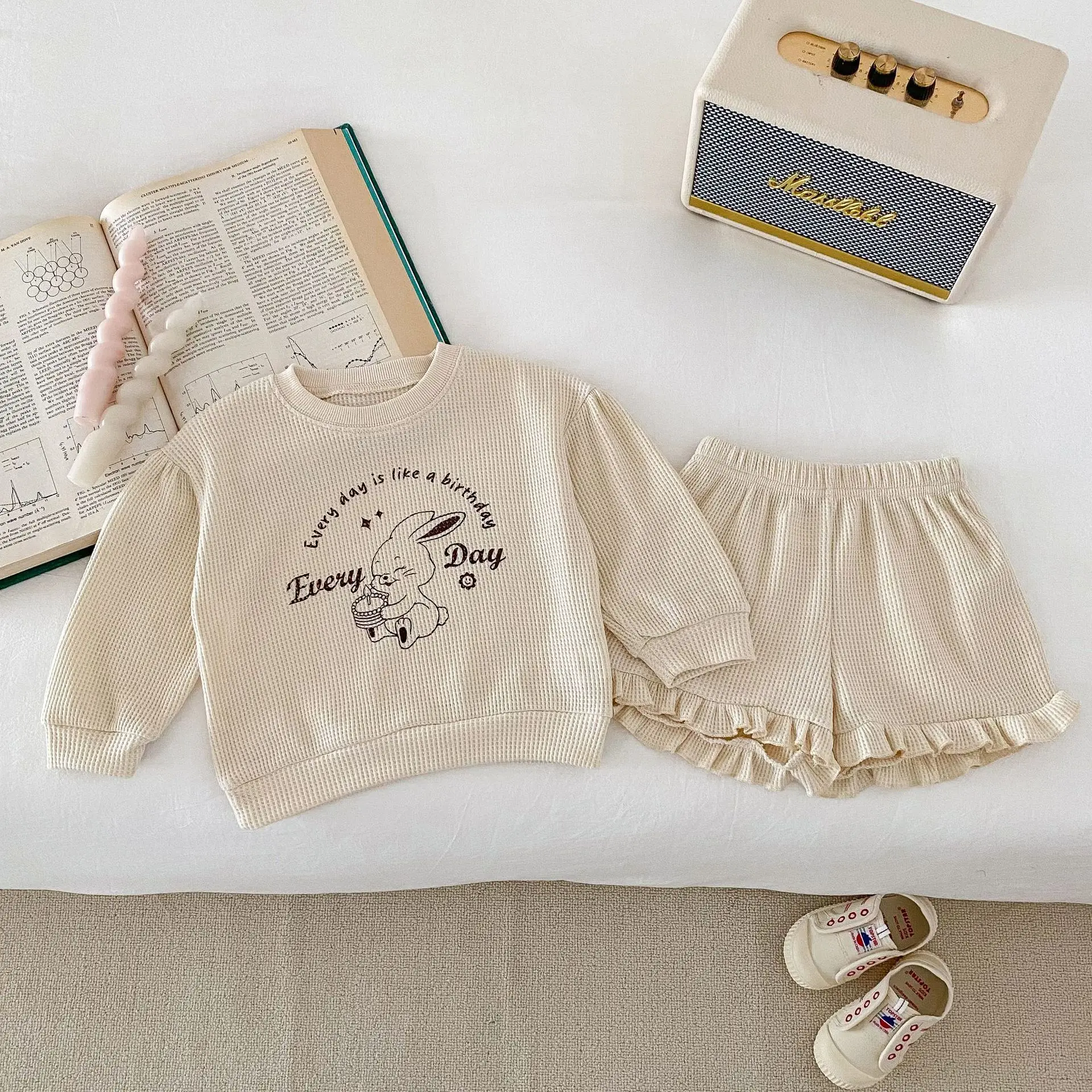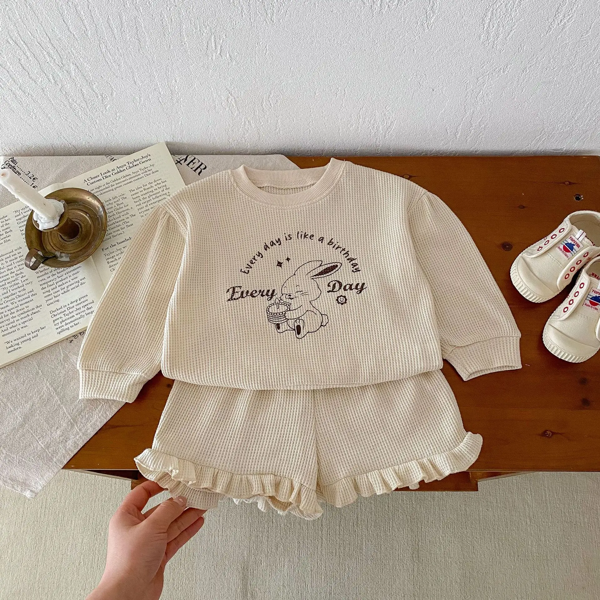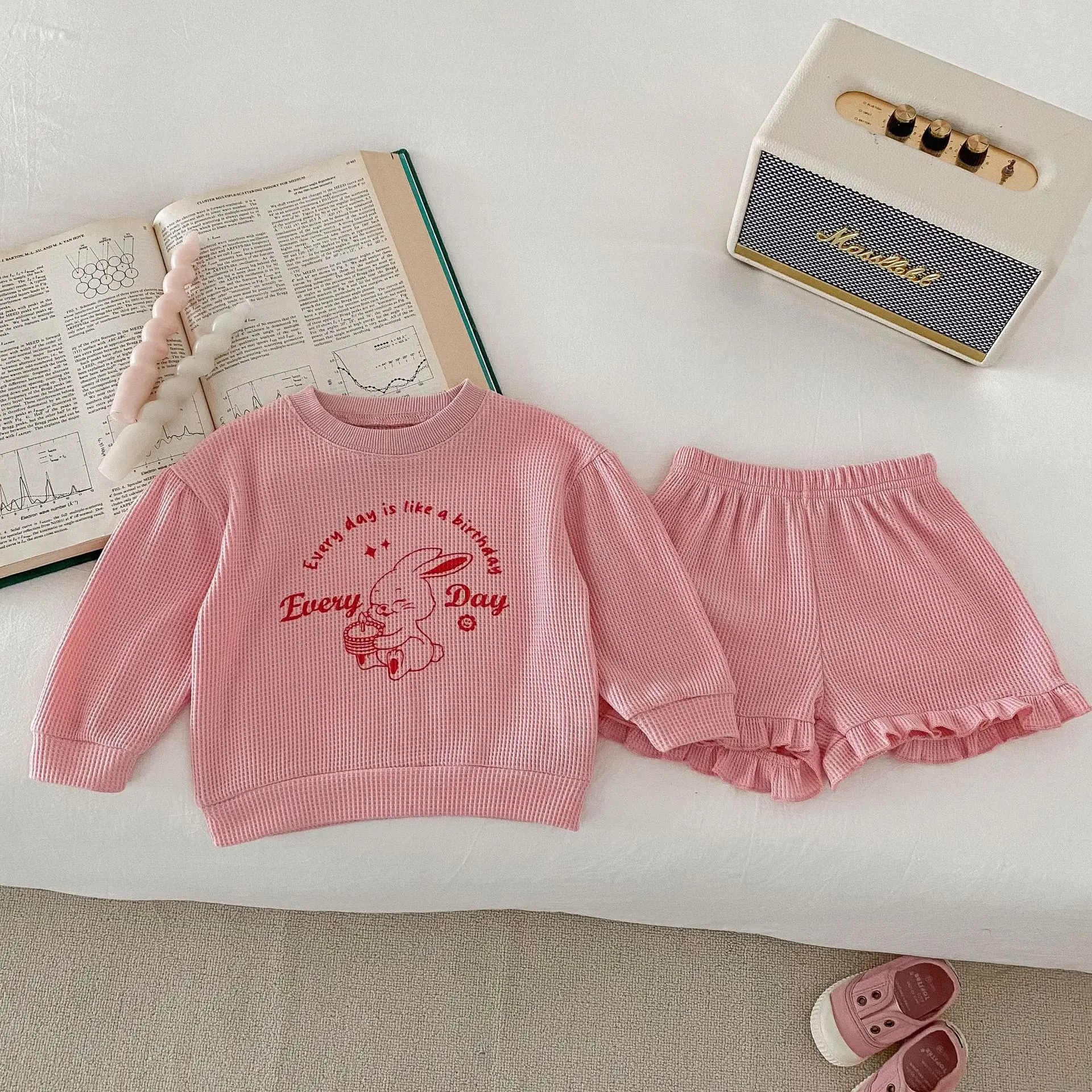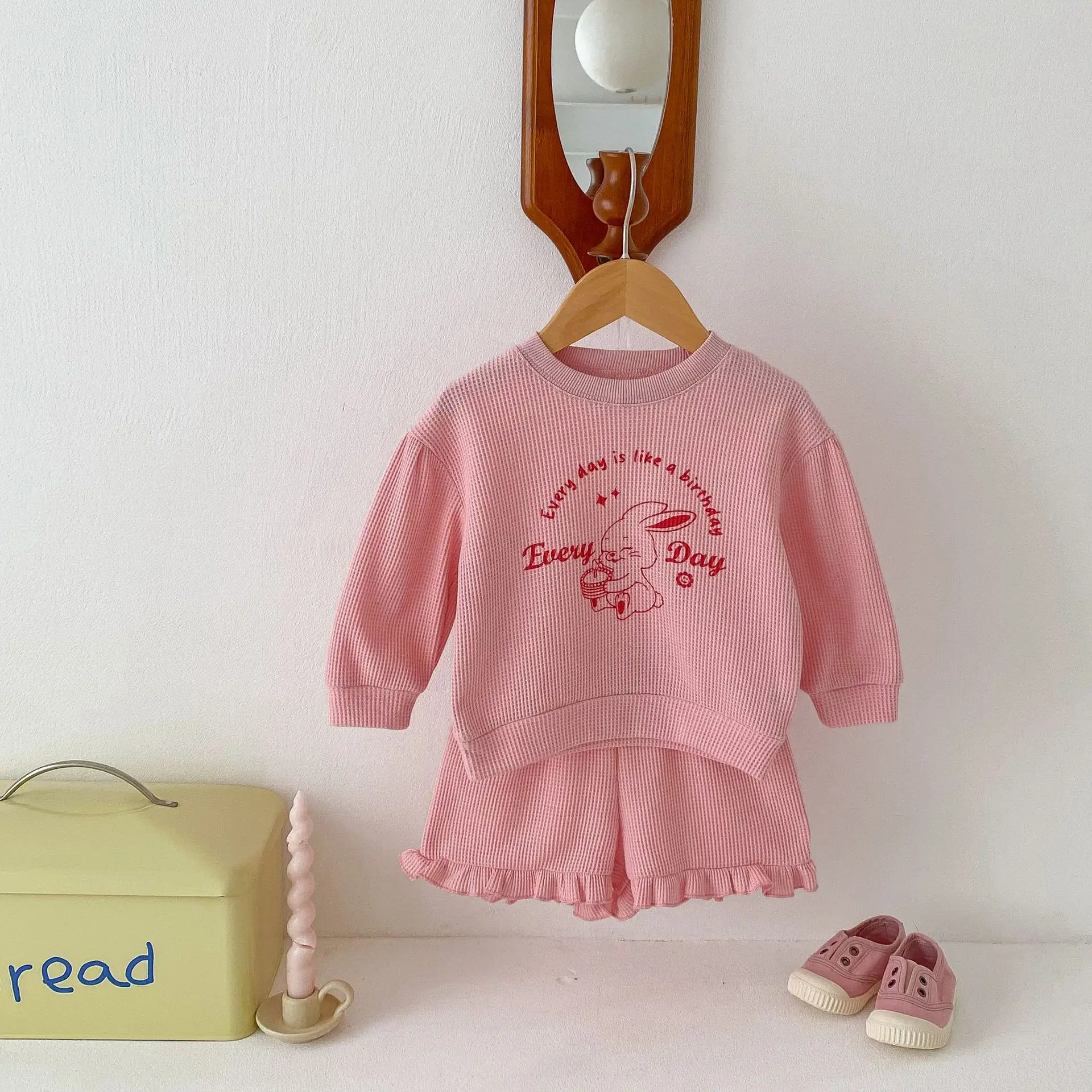 キッズセットアップ 2点セット ワッフル 長袖Tシャツ+フリルショートパンツ うさぎプリント 2カラー【mh0006377】