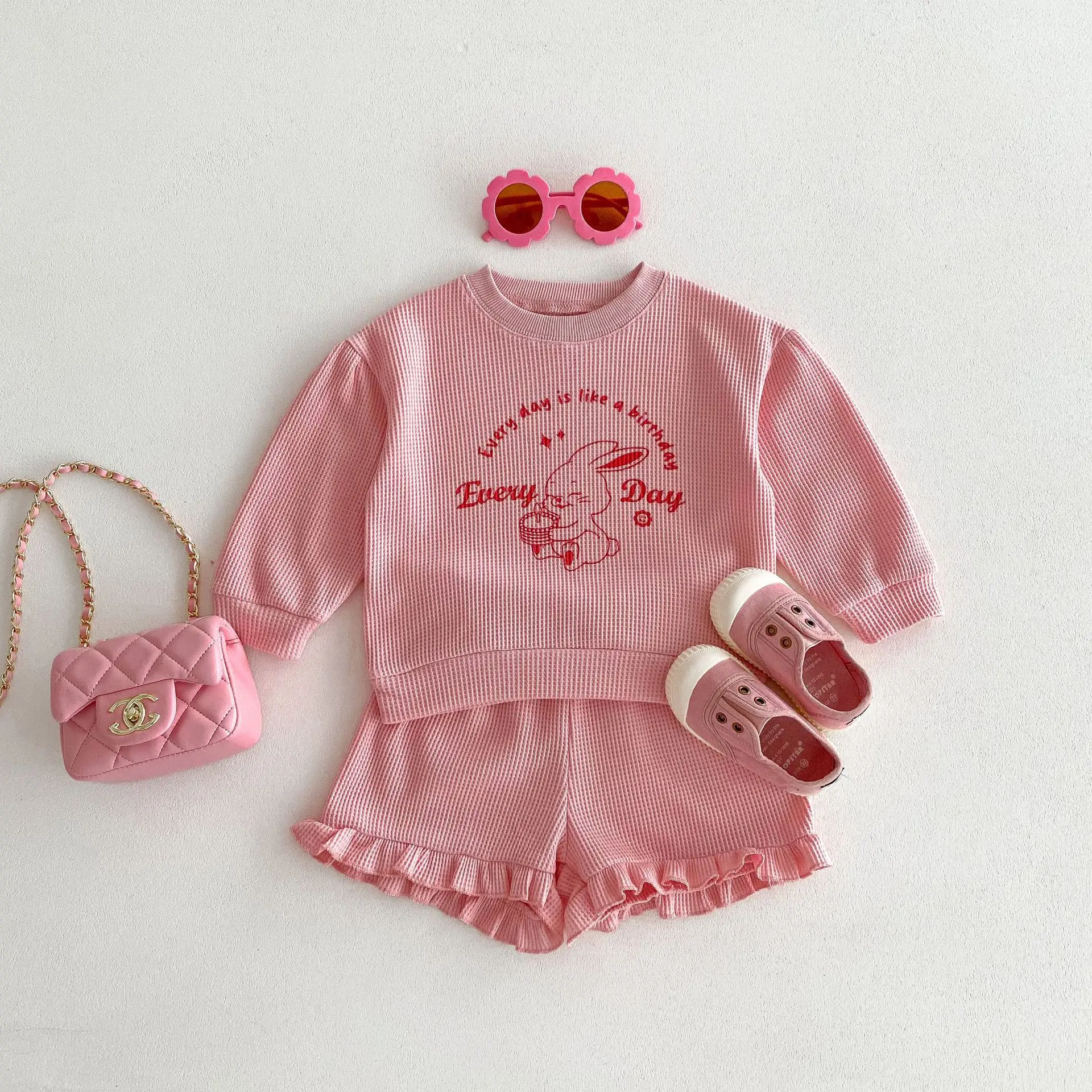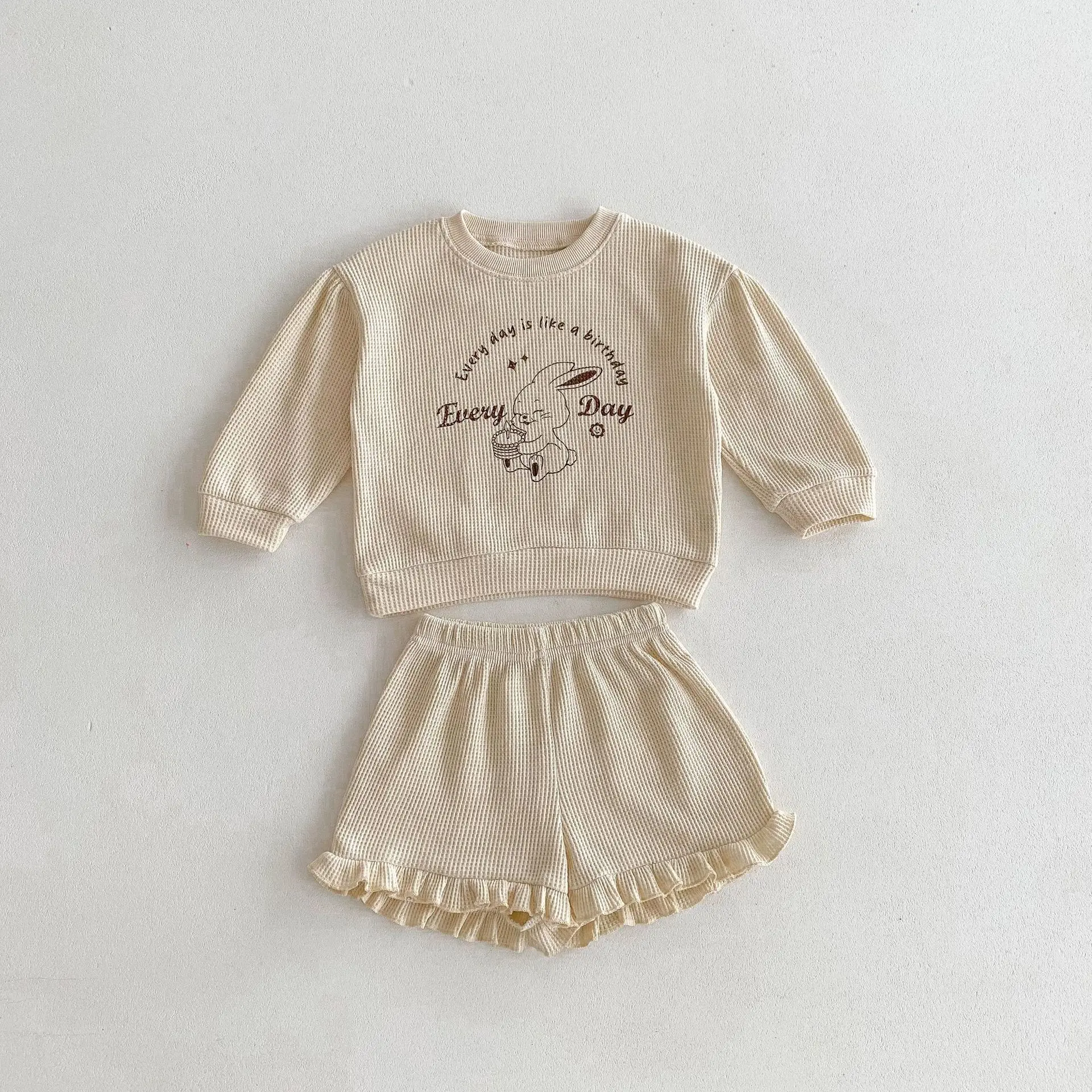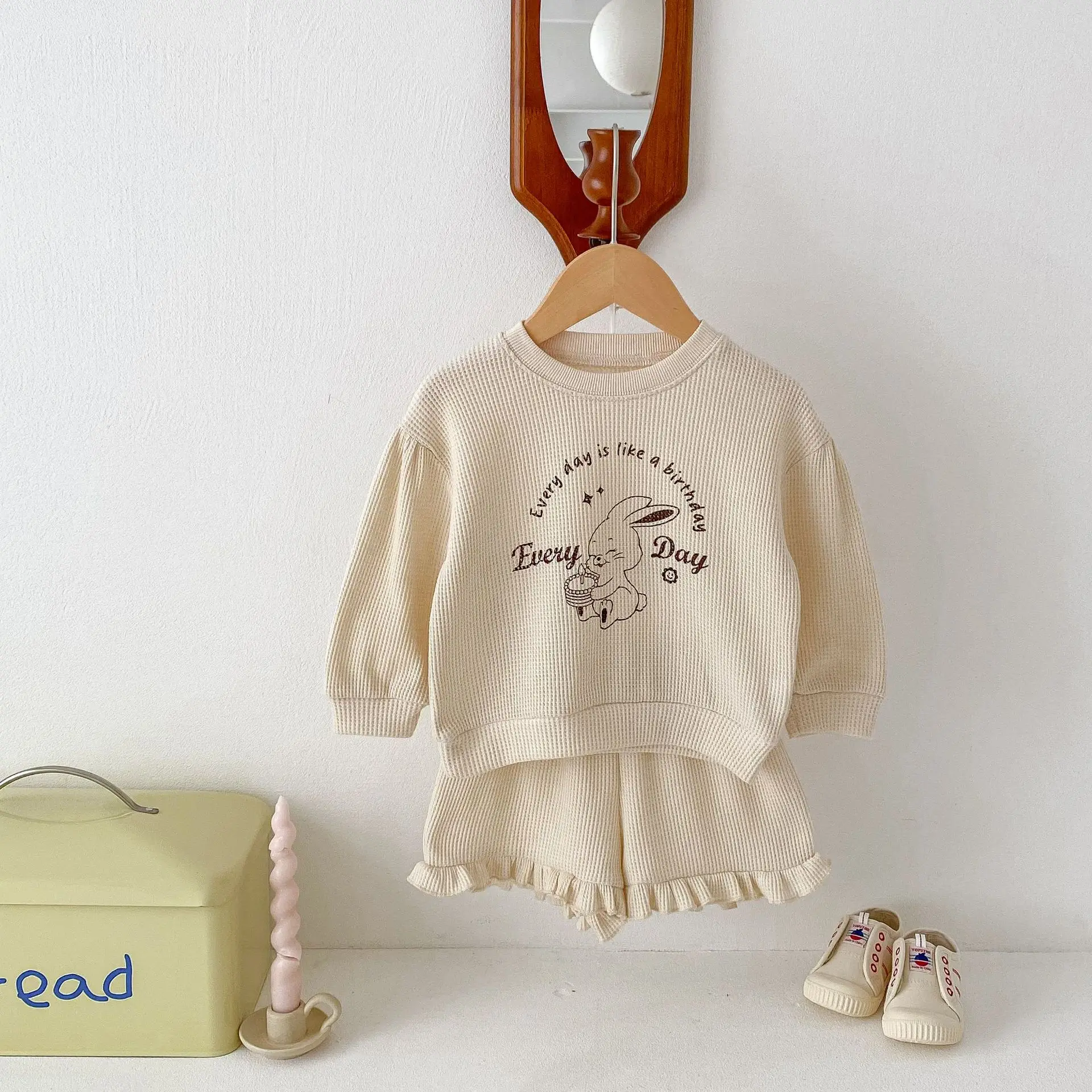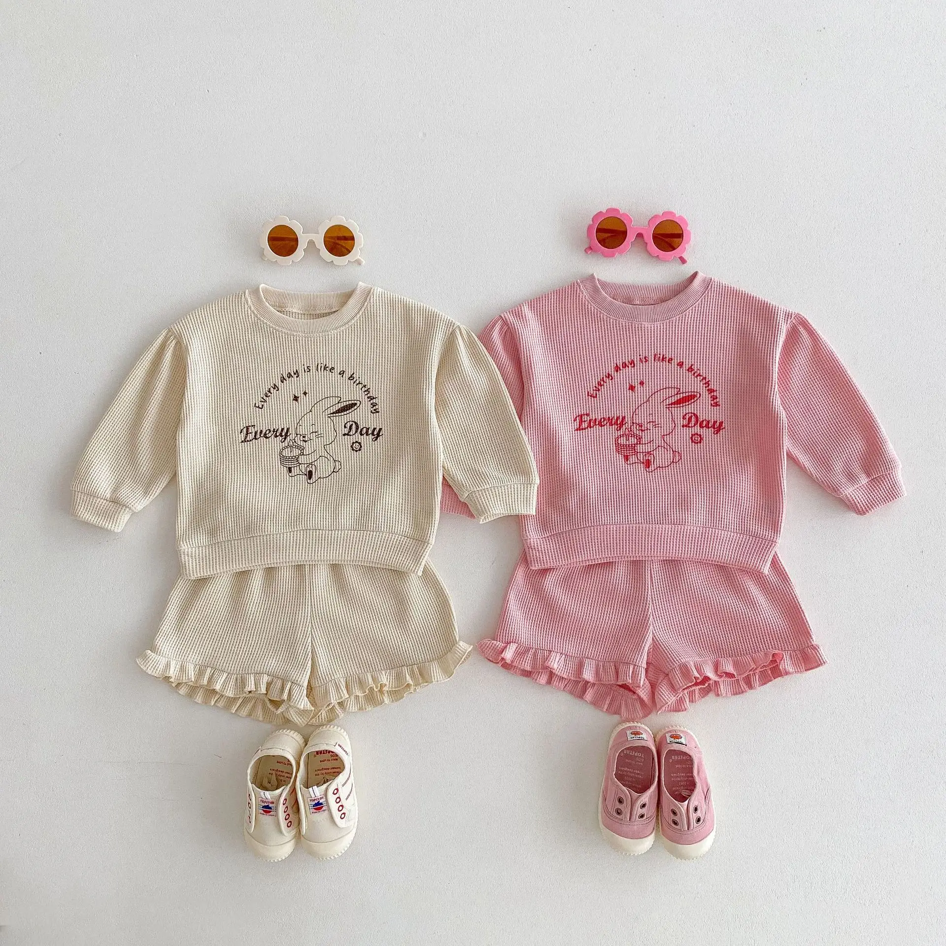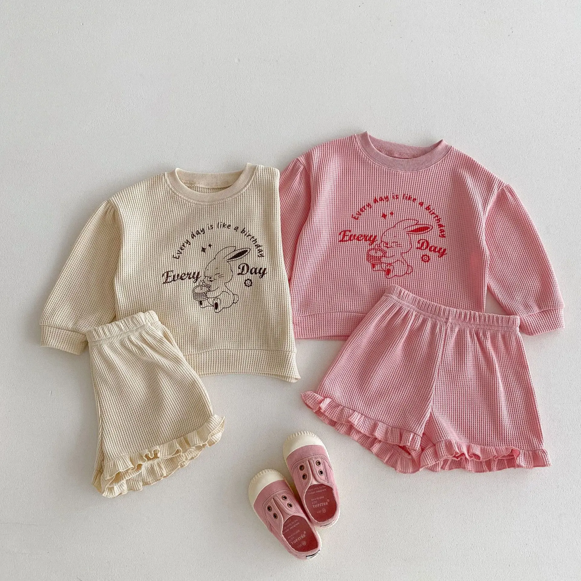 キッズセットアップ 2点セット ワッフル 長袖Tシャツ+フリルショートパンツ うさぎプリント 2カラー【mh0006377】
