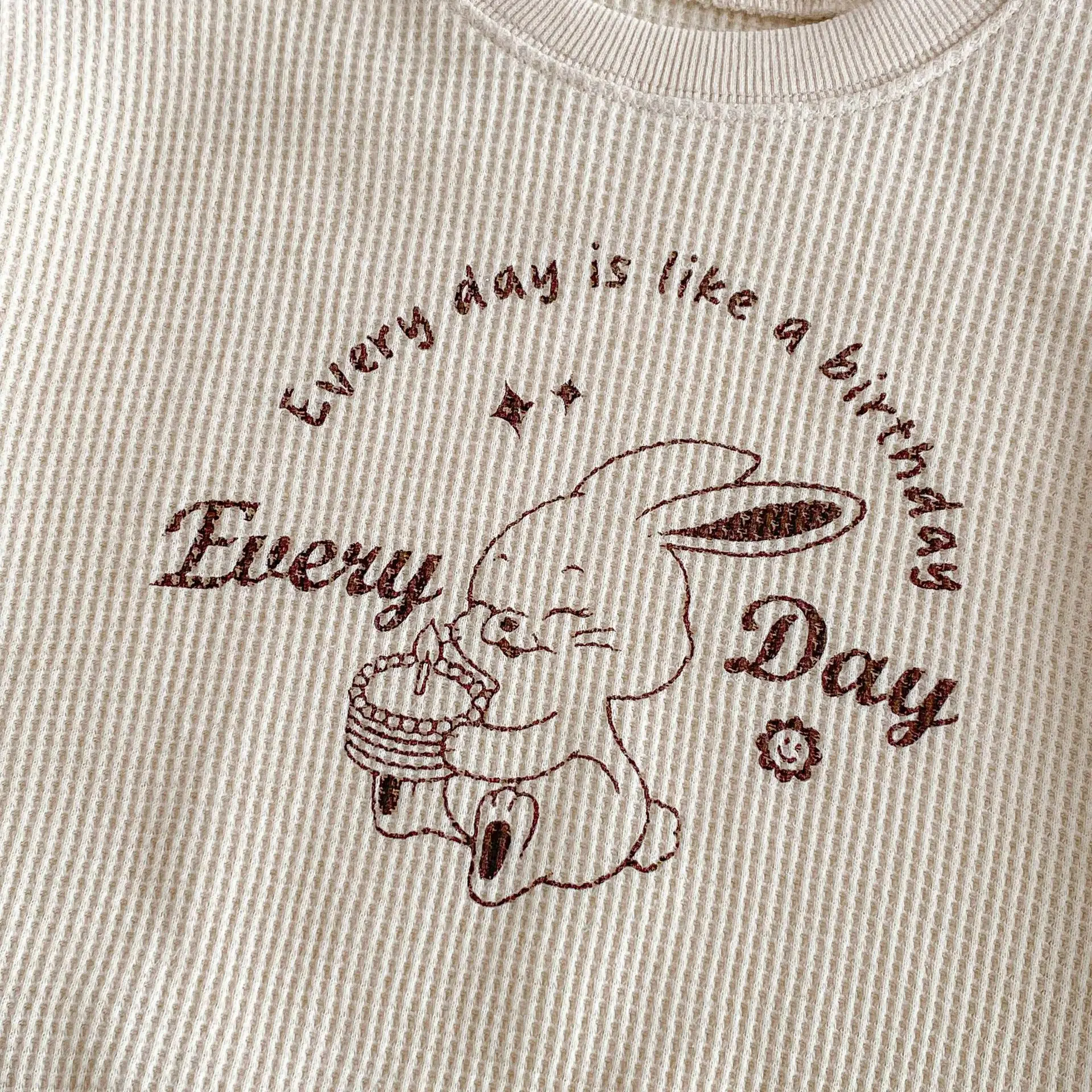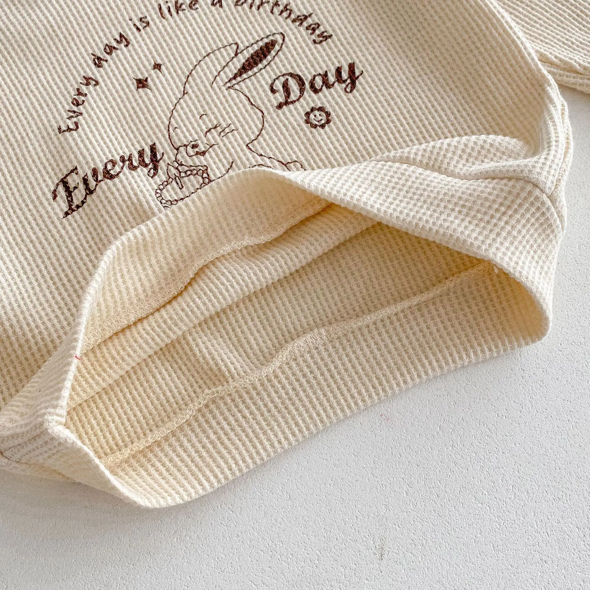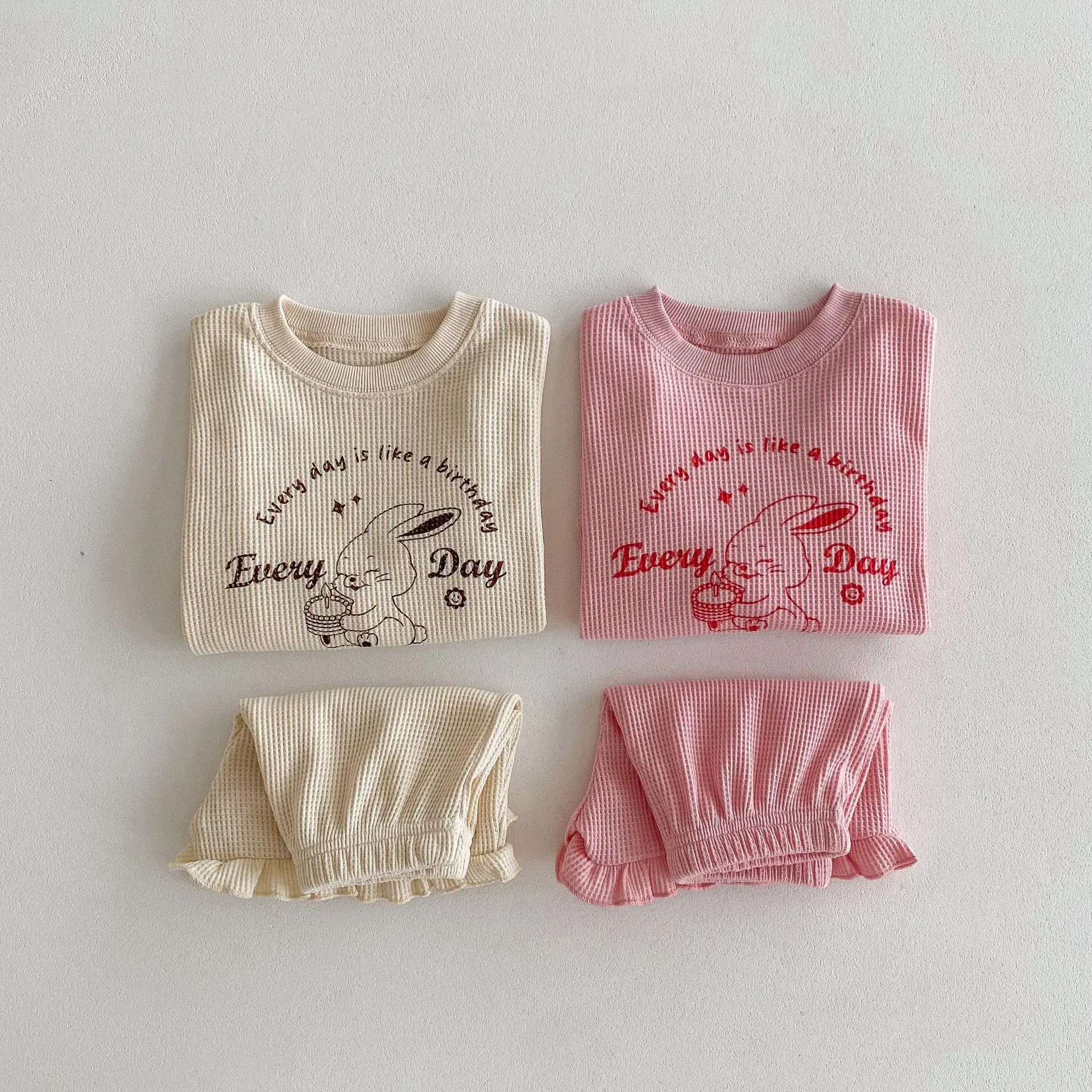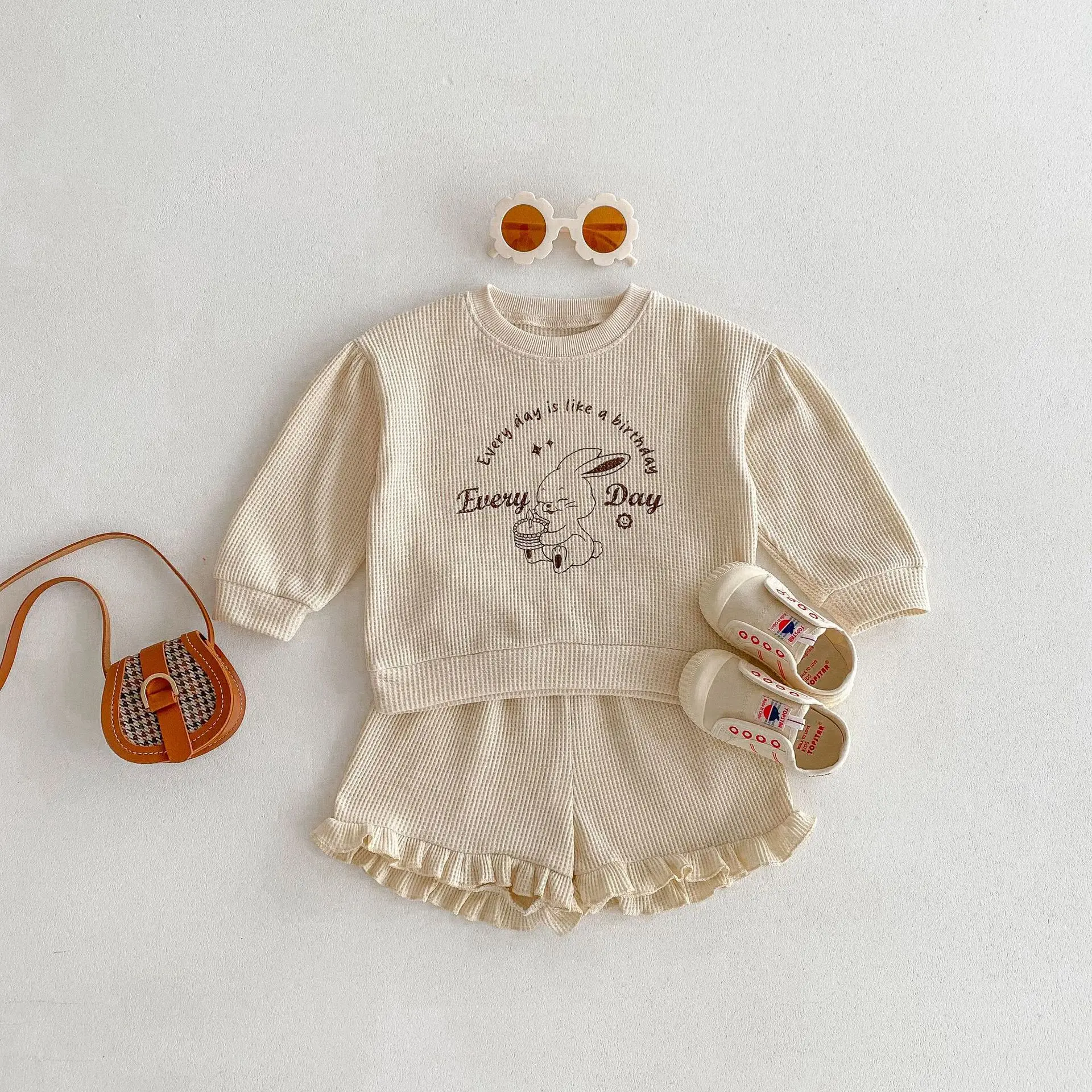 キッズセットアップ 2点セット ワッフル 長袖Tシャツ+フリルショートパンツ うさぎプリント 2カラー【mh0006377】