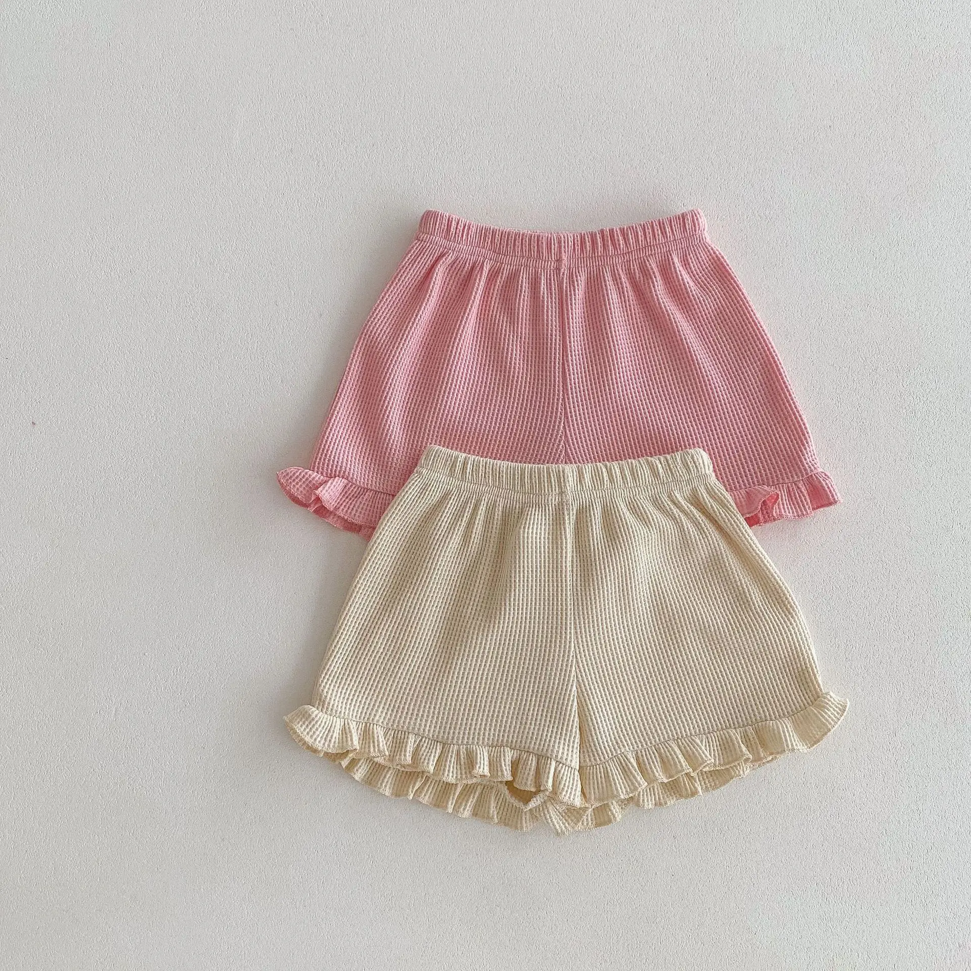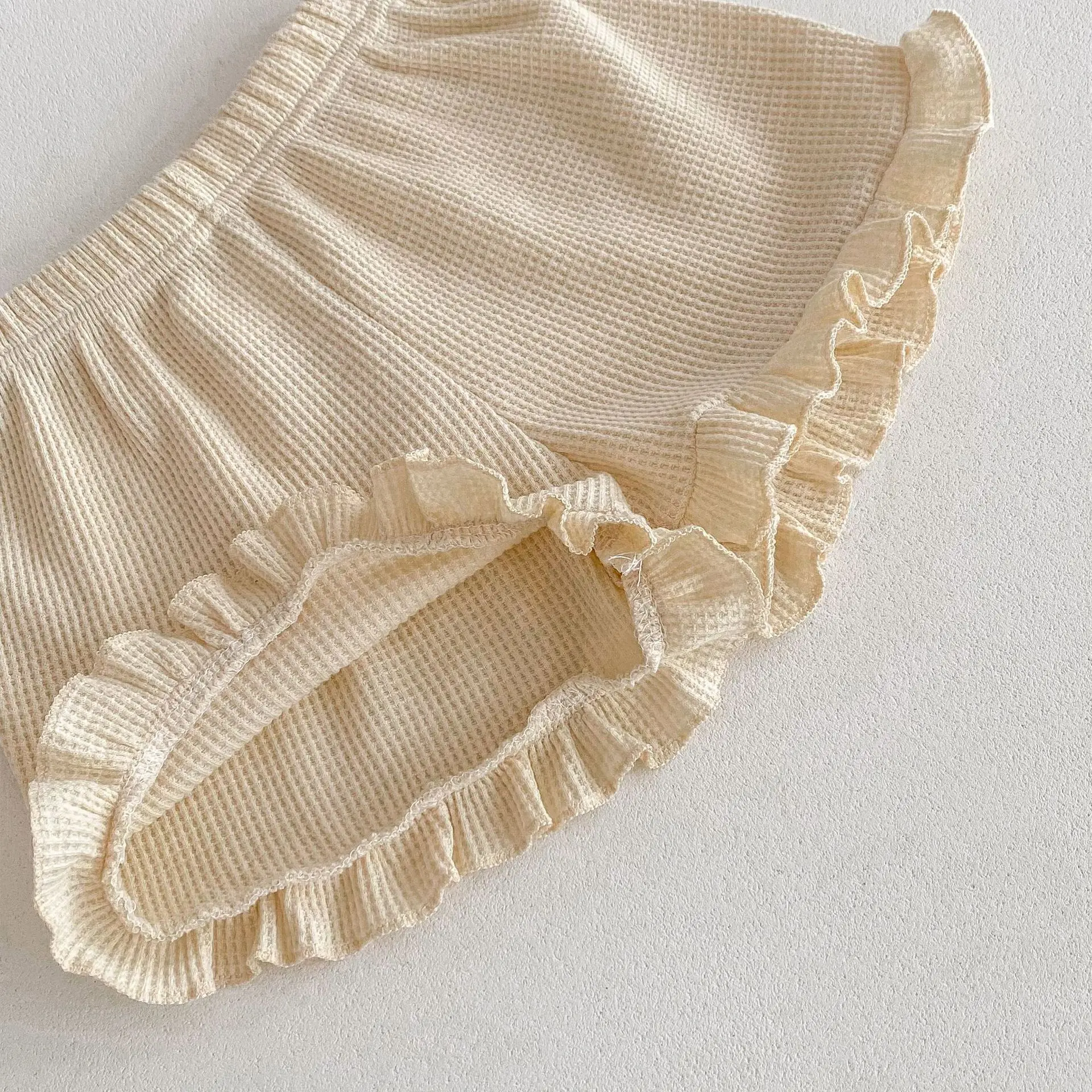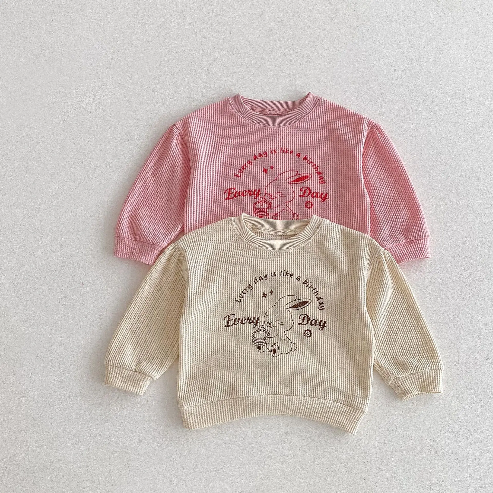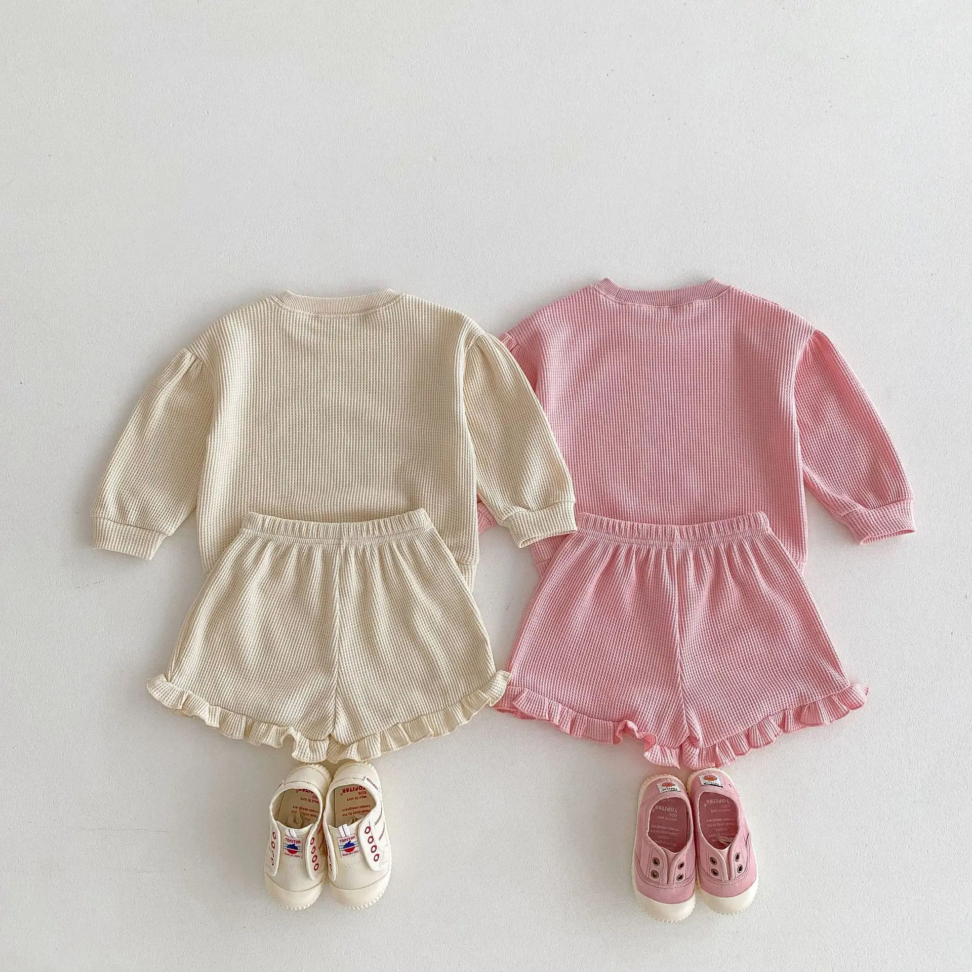 キッズセットアップ 2点セット ワッフル 長袖Tシャツ+フリルショートパンツ うさぎプリント 2カラー【mh0006377】