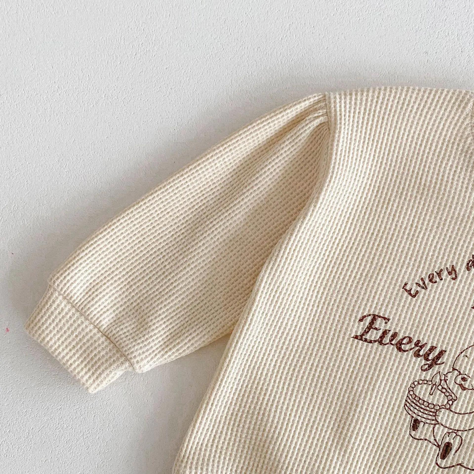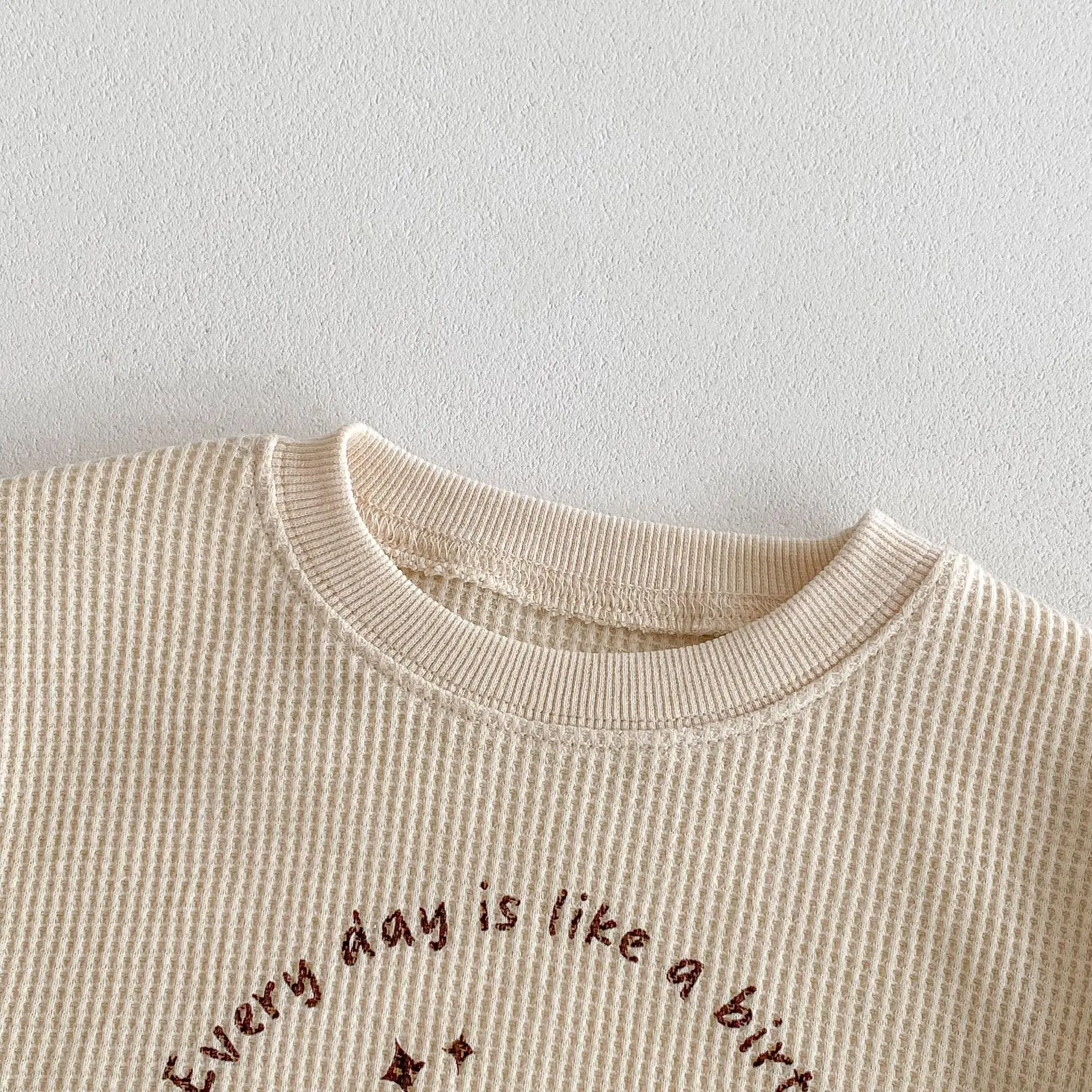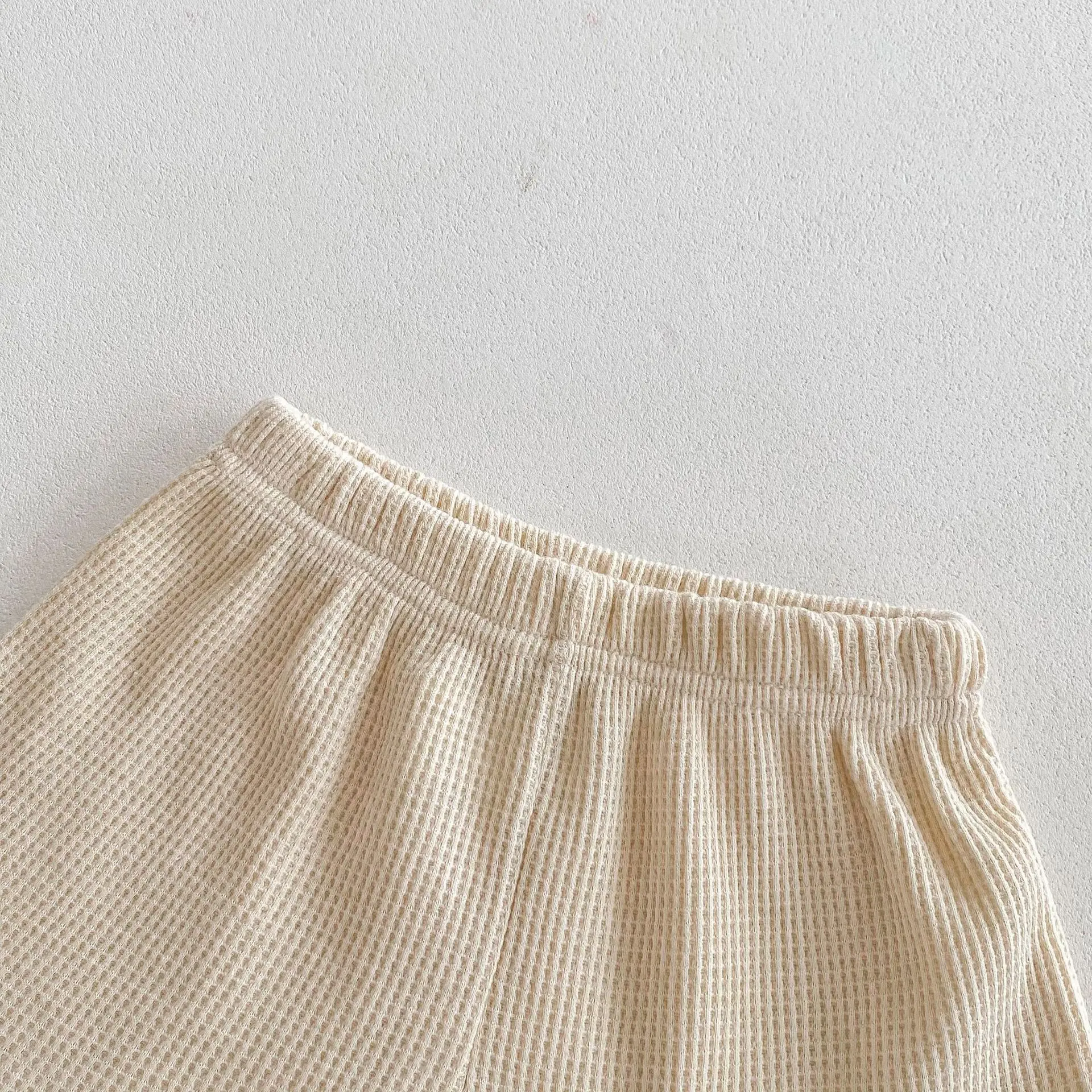 可愛らしいうさぎプリントが施された、子供用の秋の新作セットです。長袖のTシャツとフリル付きのショートパンツの2点セットになっており、ワッフル素材でおしゃれで快適な着心地です。動きやすく、様々なシーンでお使いいただける、お子様のカジュアルなコーディネートにぴったりです。
