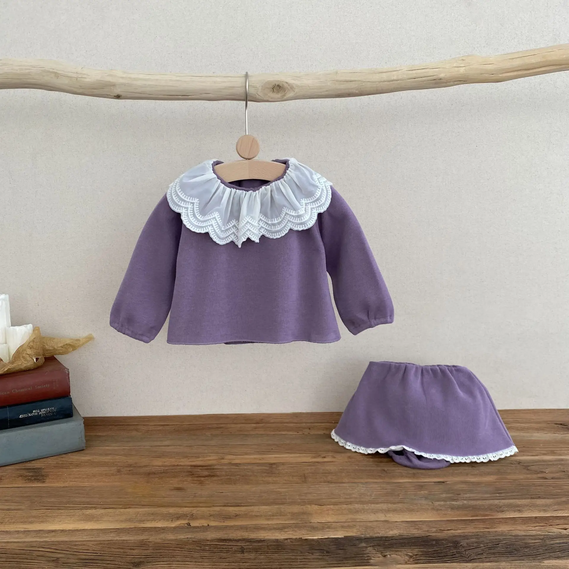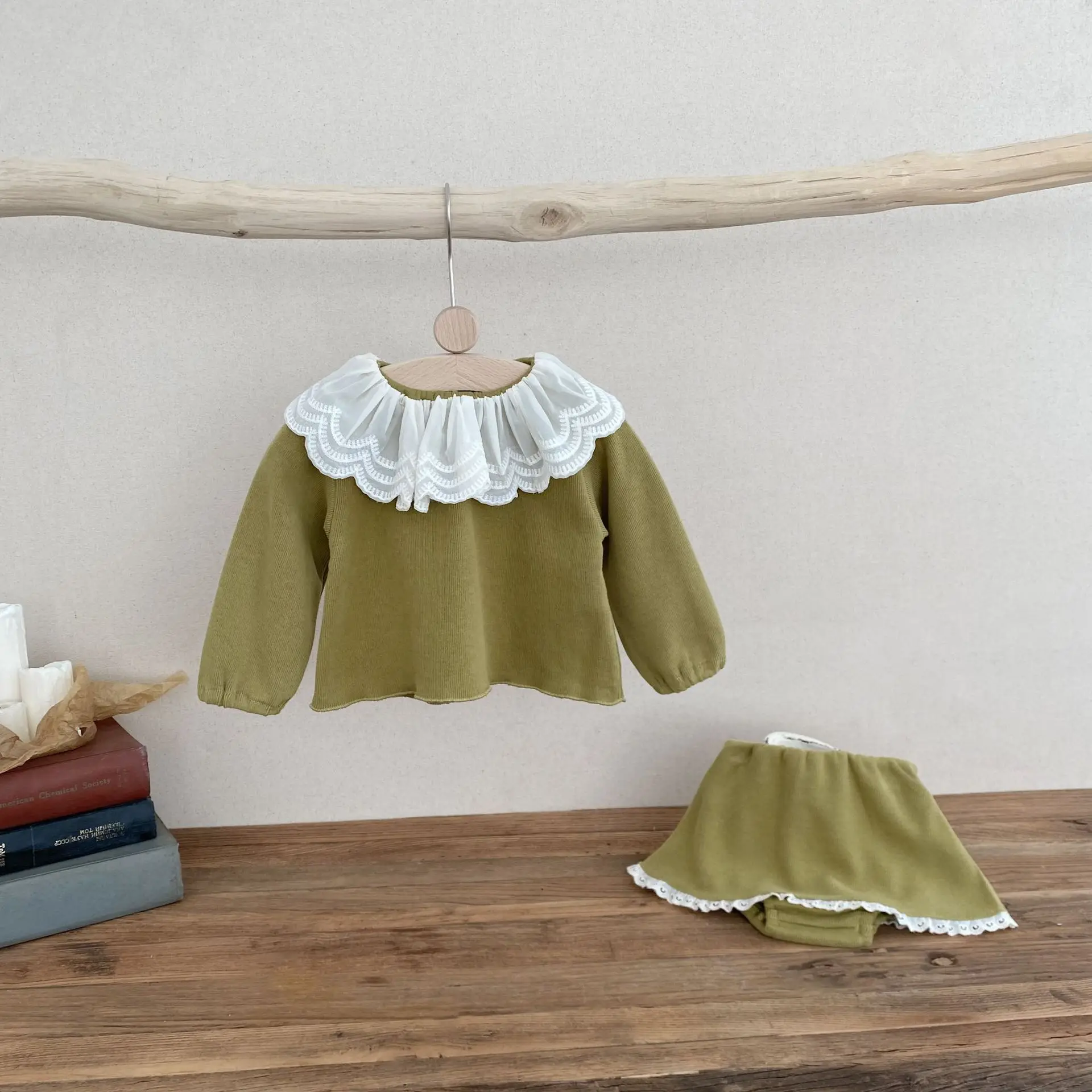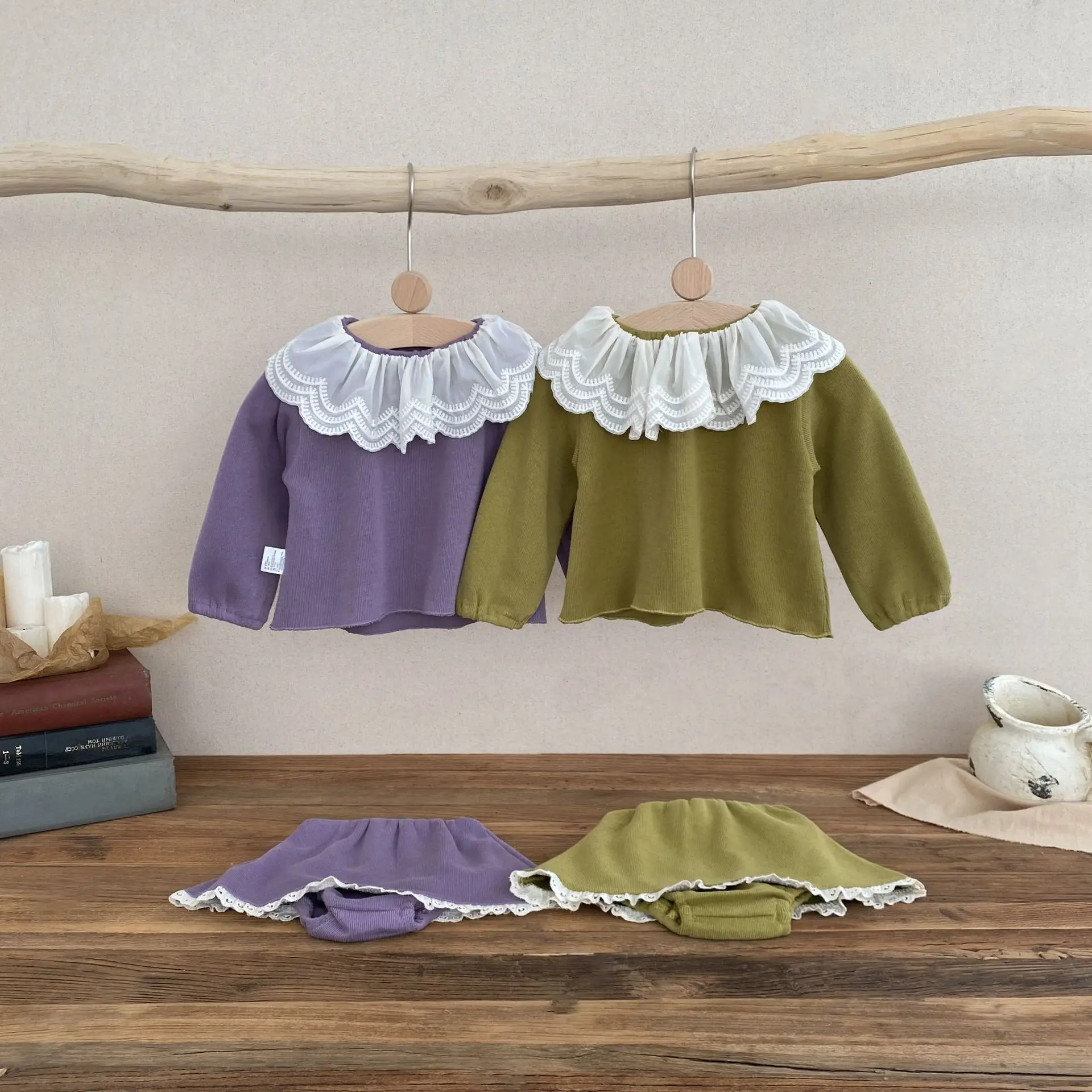 ベビーセットアップ 2点セット ロータス襟長袖Tシャツブラウス+ブルマパンツインスカート 2カラー【mh0006715】