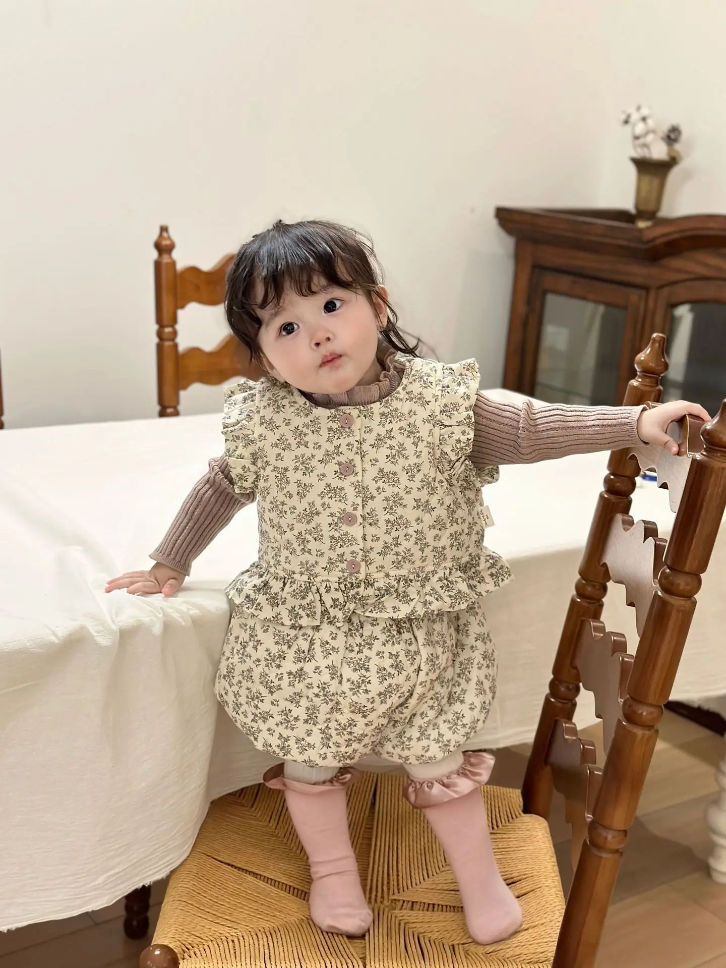 ベビーキッズセットアップ 2点セット フラワープリントパデッドペプラムベスト+バルーンショートパンツ【mh0007895】