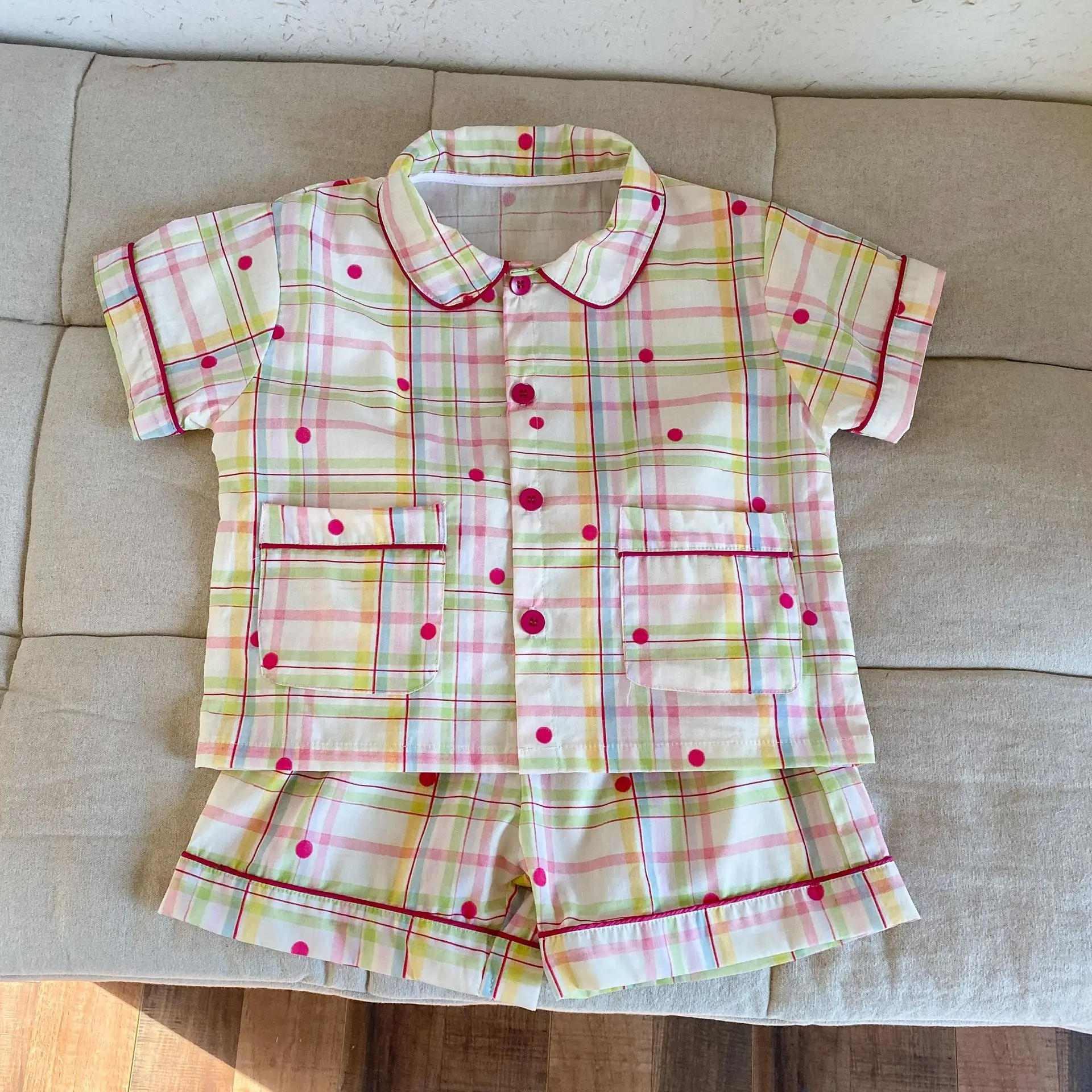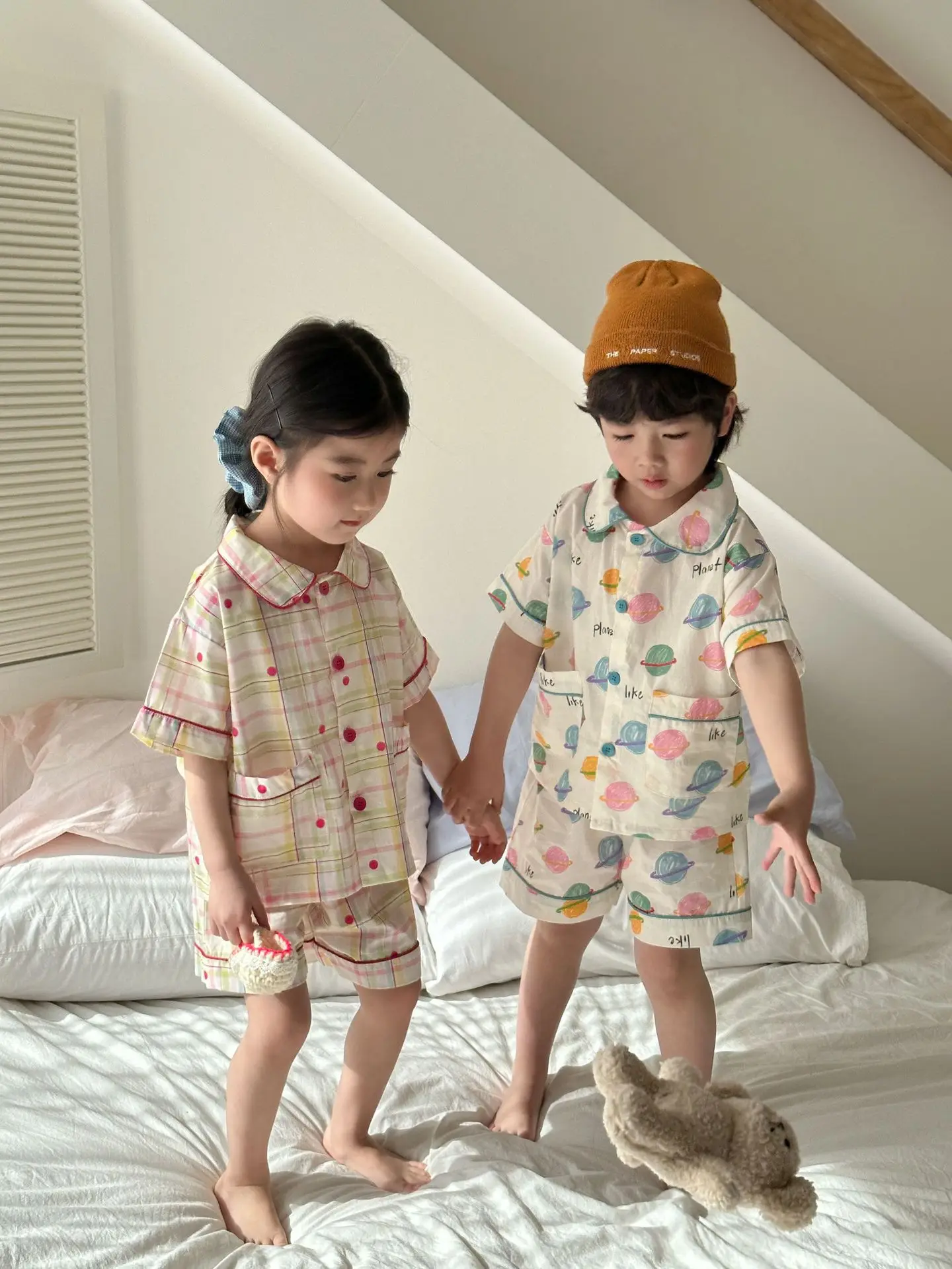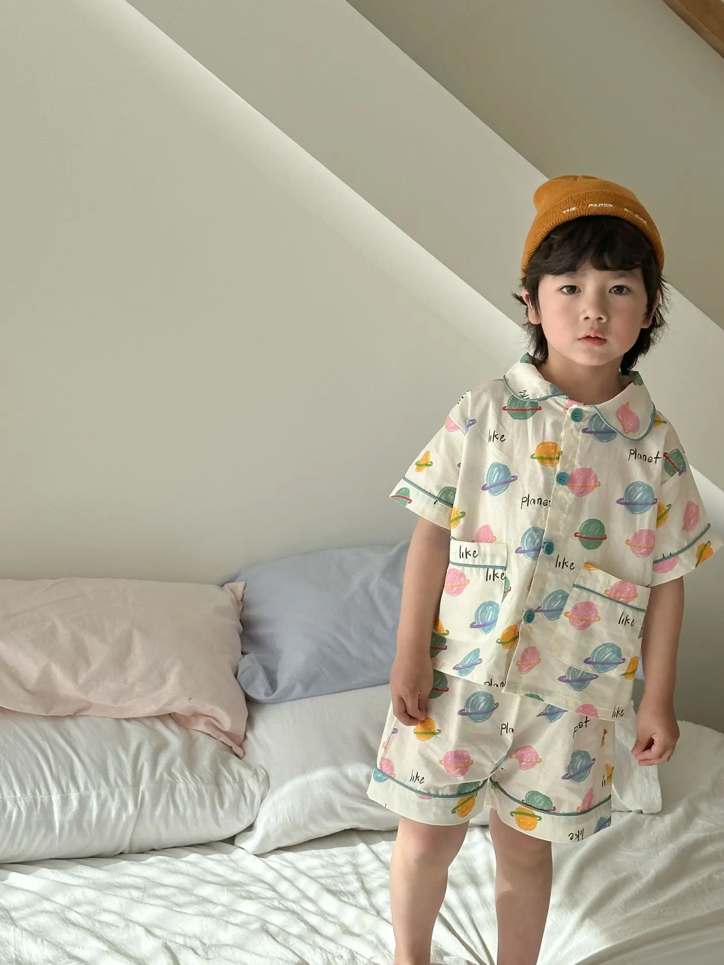 チェック柄と宇宙プリントのデザインが楽しめる、半袖シャツとショートパンツのキッズパジャマセットです。軽やかなコットン素材を使用し、さらりとした肌触りで快適な着心地。ゆったりとしたシルエットで動きやすく、寝返りもしやすいデザインです。半袖&ショートパンツの組み合わせで暑い季節も涼しく過ごせる仕様。シンプルながらも個性的なプリントがポイントで、おうち時間を楽しく彩る一着です。
