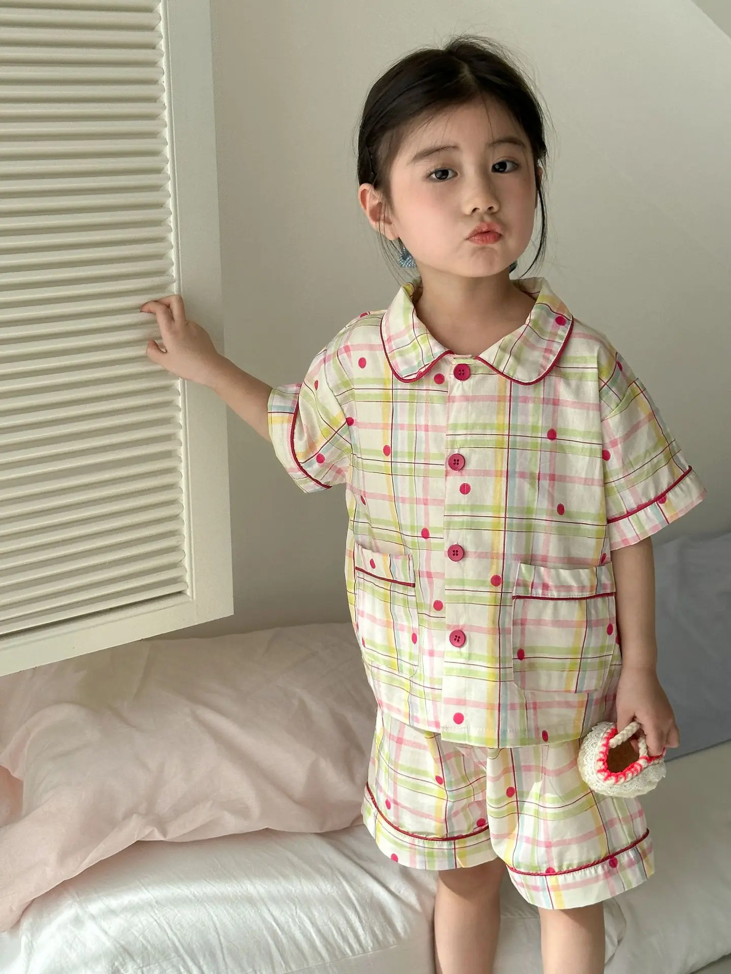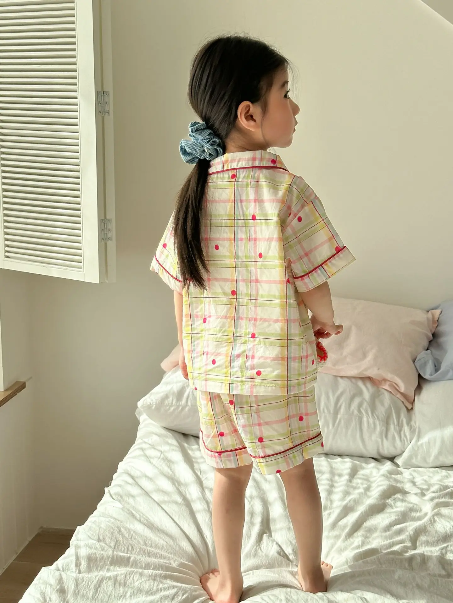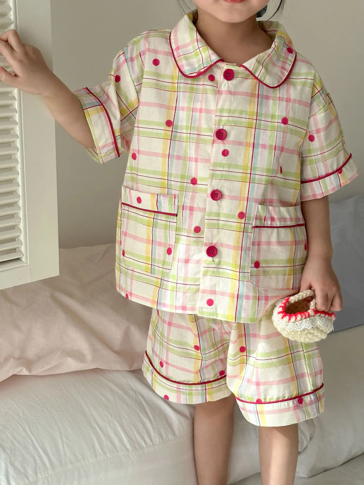 チェック柄と宇宙プリントのデザインが楽しめる、半袖シャツとショートパンツのキッズパジャマセットです。軽やかなコットン素材を使用し、さらりとした肌触りで快適な着心地。ゆったりとしたシルエットで動きやすく、寝返りもしやすいデザインです。半袖&ショートパンツの組み合わせで暑い季節も涼しく過ごせる仕様。シンプルながらも個性的なプリントがポイントで、おうち時間を楽しく彩る一着です。