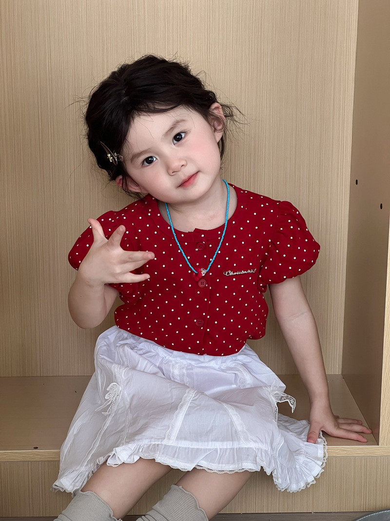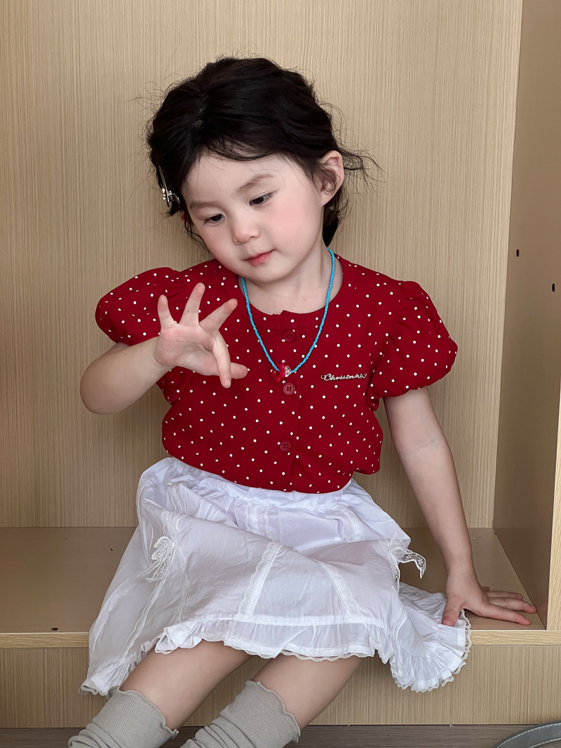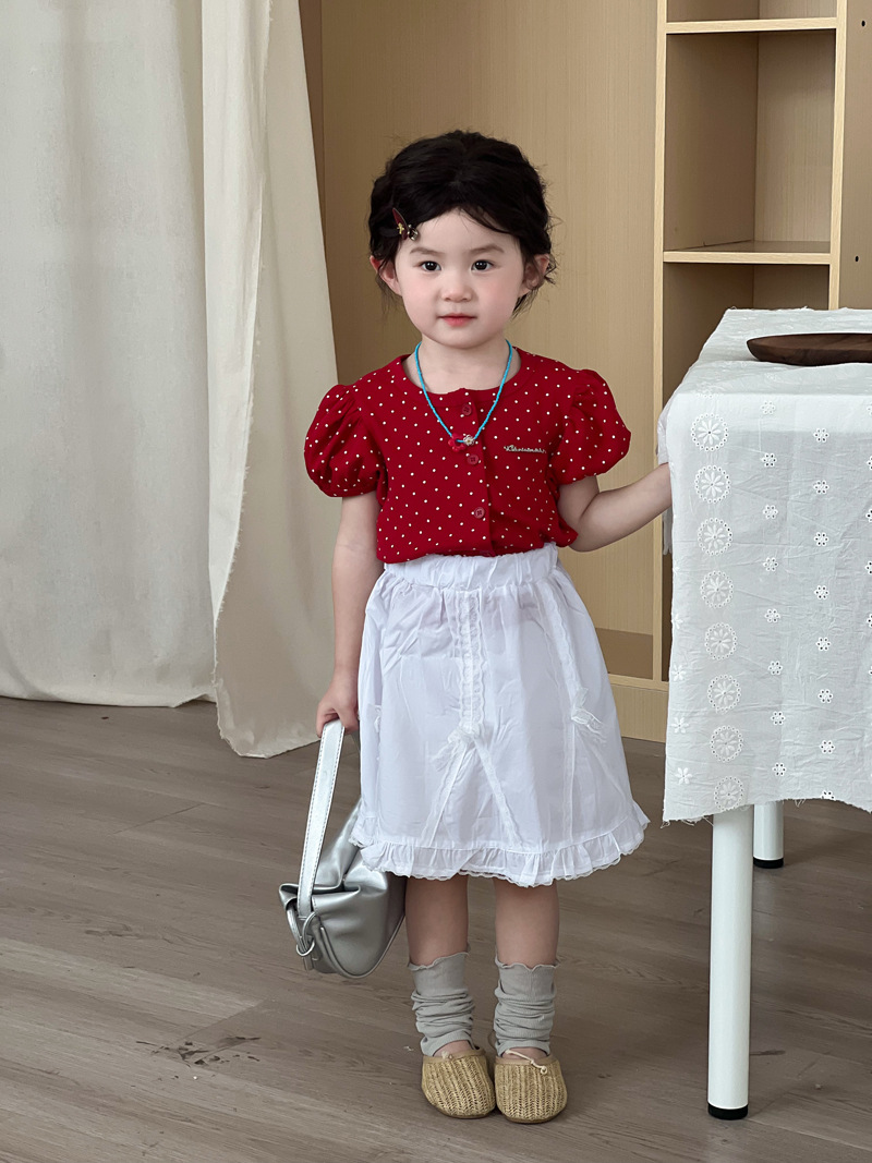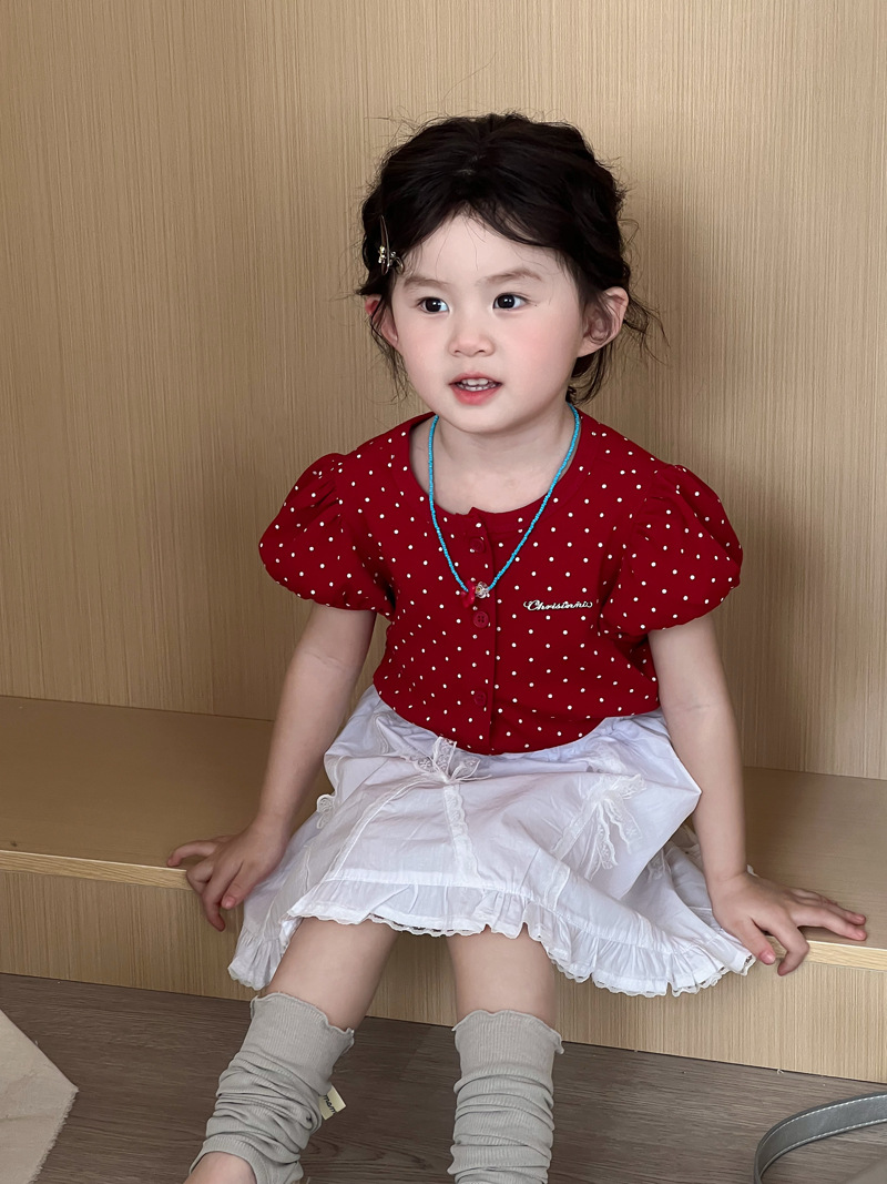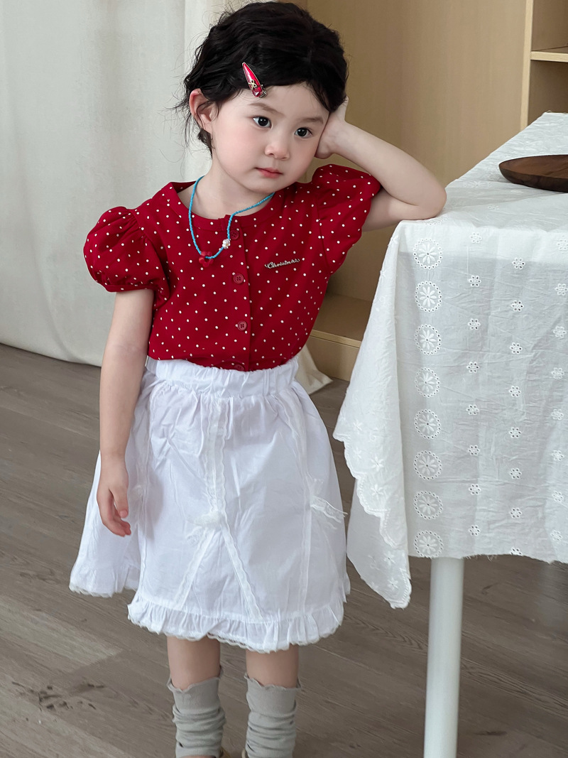 #キッズセットアップ #子供服 #女の子 #半袖ブラウス #パフスリーブ #水玉プリント #レーススカート #フリルスカート #夏物子供服 #おしゃれキッズ