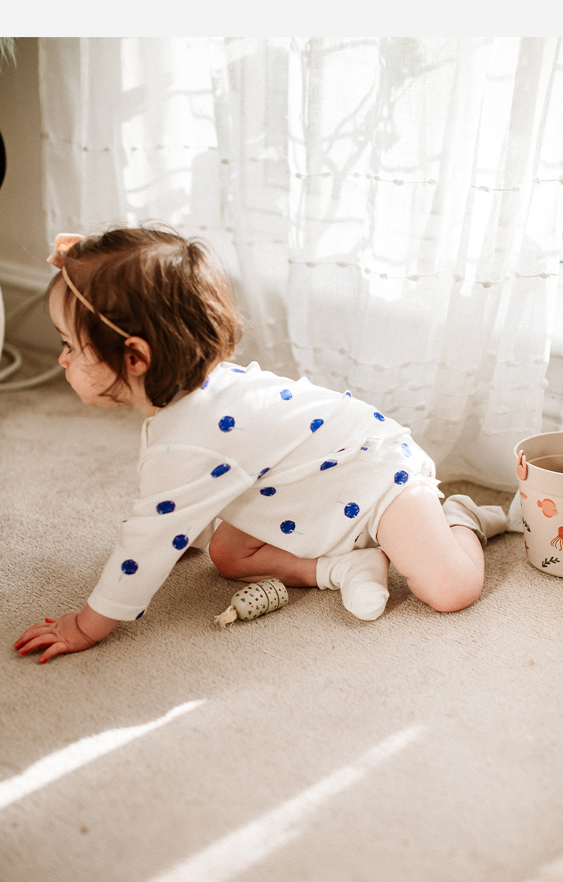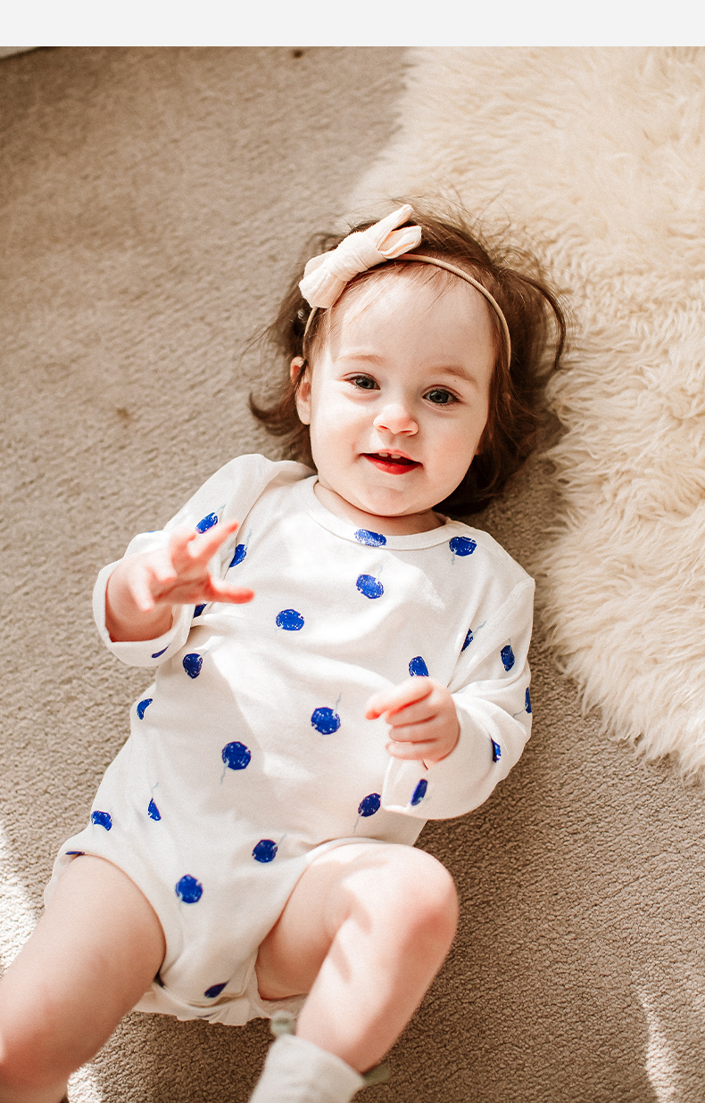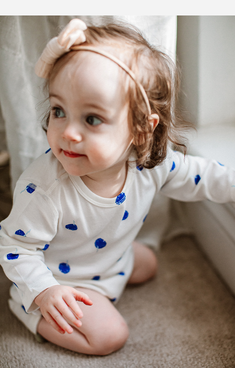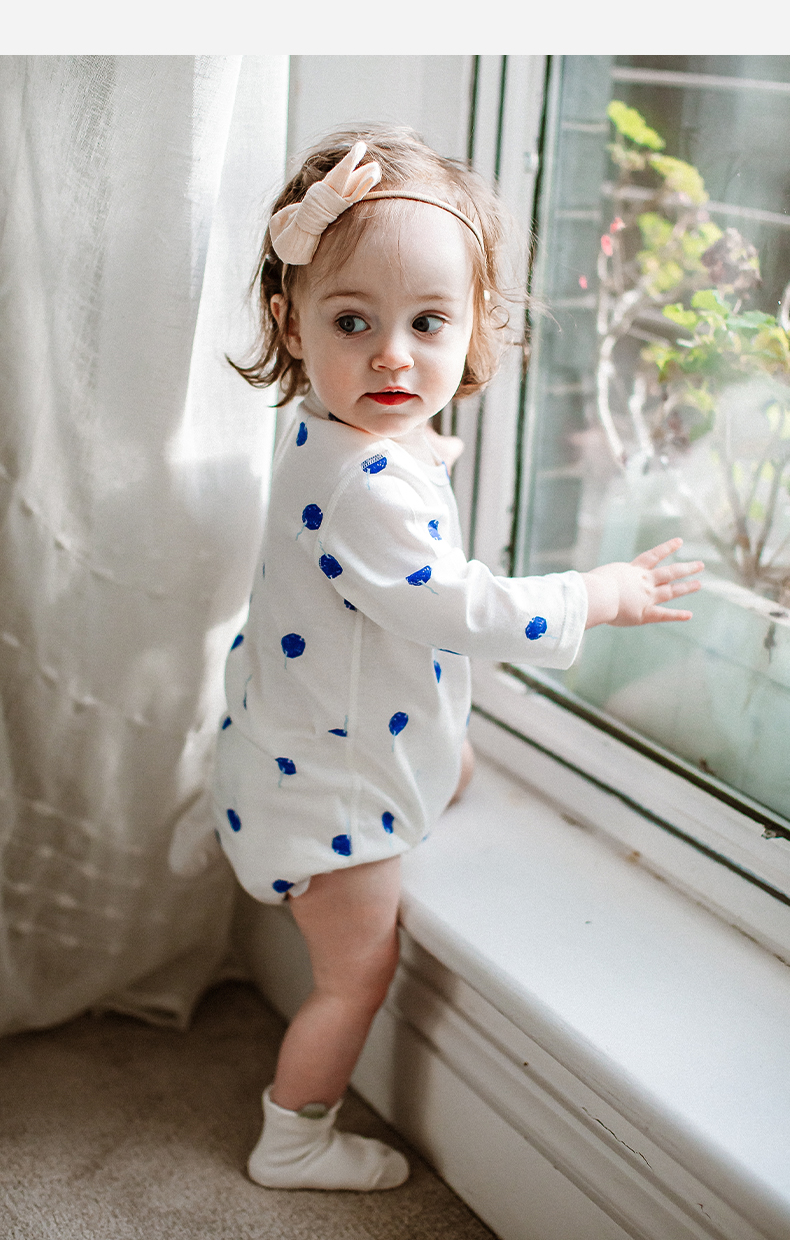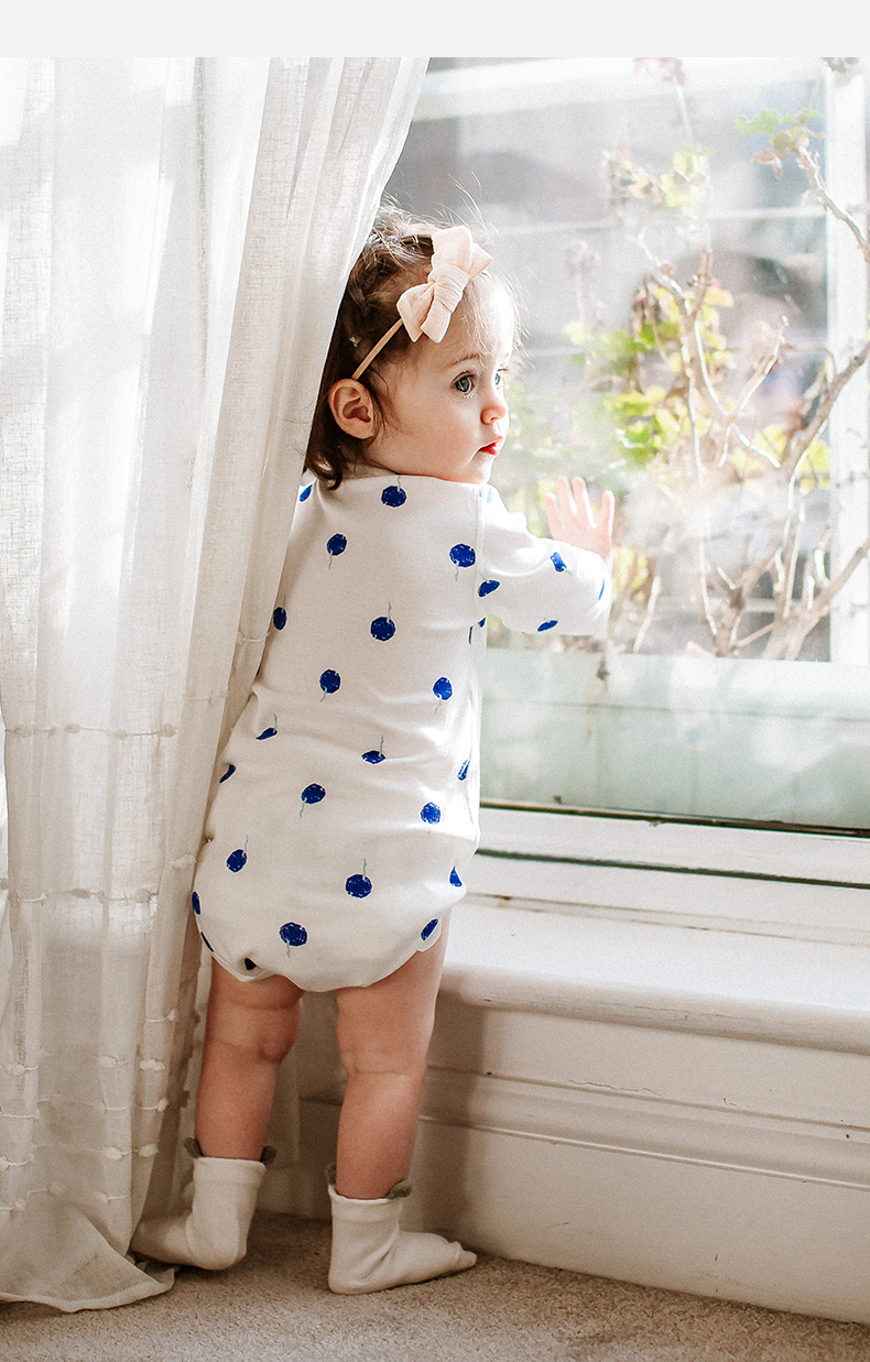 愛らしいブルーのバルーンプリントが散りばめられたブルーバルーンプリント長袖ロンパースです。北欧スタイルを取り入れたおしゃれなデザインで、赤ちゃんをより一層可愛らしく見せます。前開き(プラケット)タイプなので、着脱やおむつ替えもスムーズに行えます。