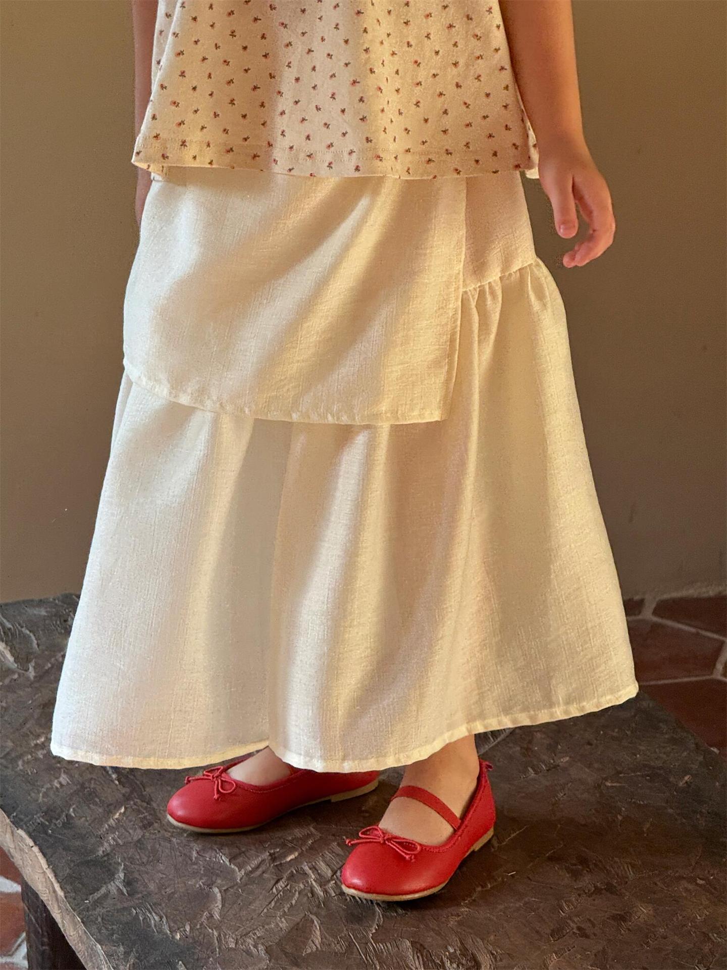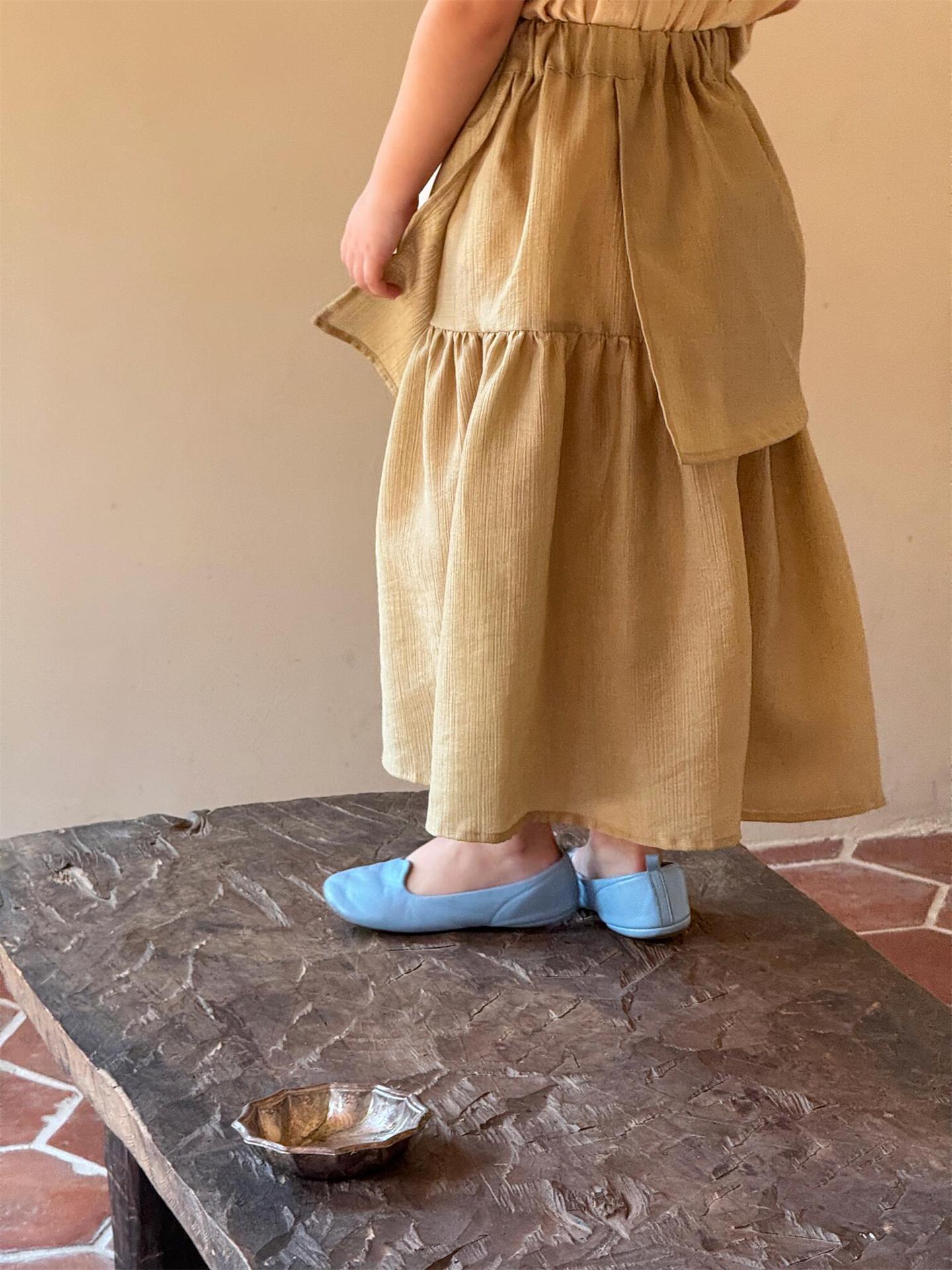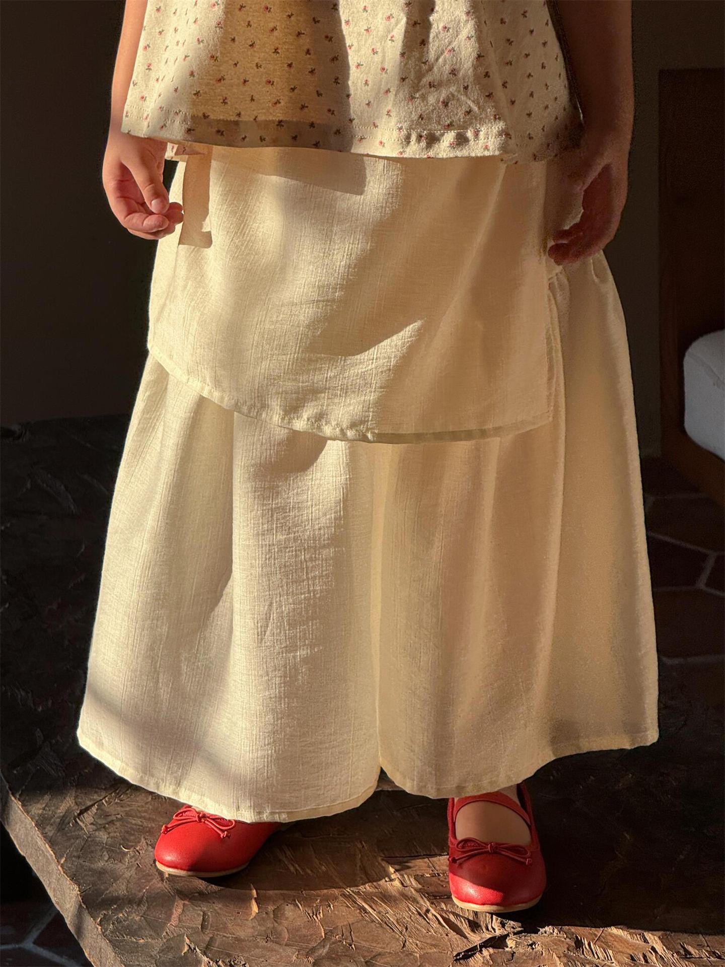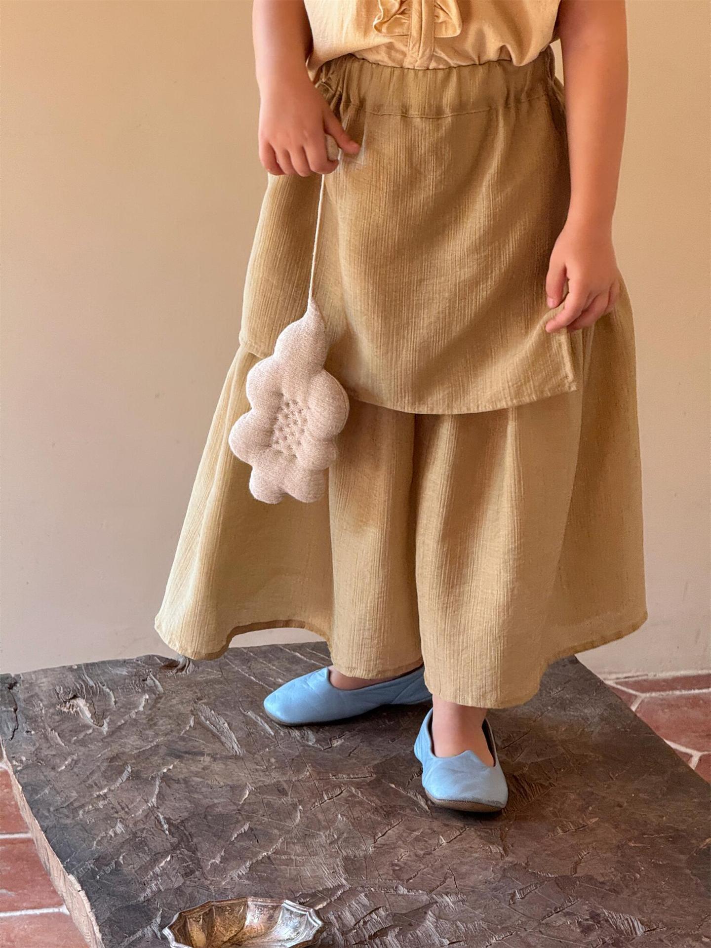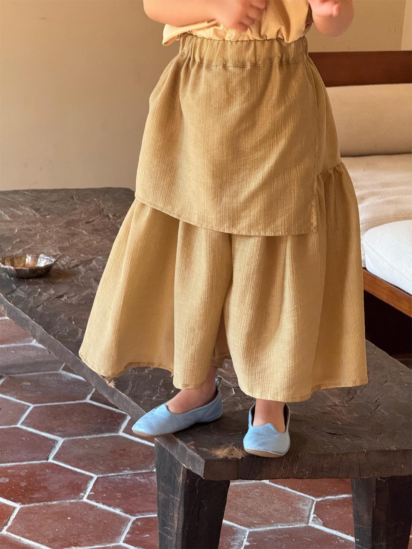 一見するとシンプルなワイドフレアパンツですが、ウエスト部分にまるでエプロンを重ねたようなデザインが施されており、個性的なアクセントになっています。無地なのでどんなトップスにも合わせやすく、着回し力も抜群。ゆったりとしたシルエットで動きやすく、暑い夏でもお子さんは快適に過ごせます。普段使いはもちろん、ちょっとしたお出かけにも活躍するでしょう。