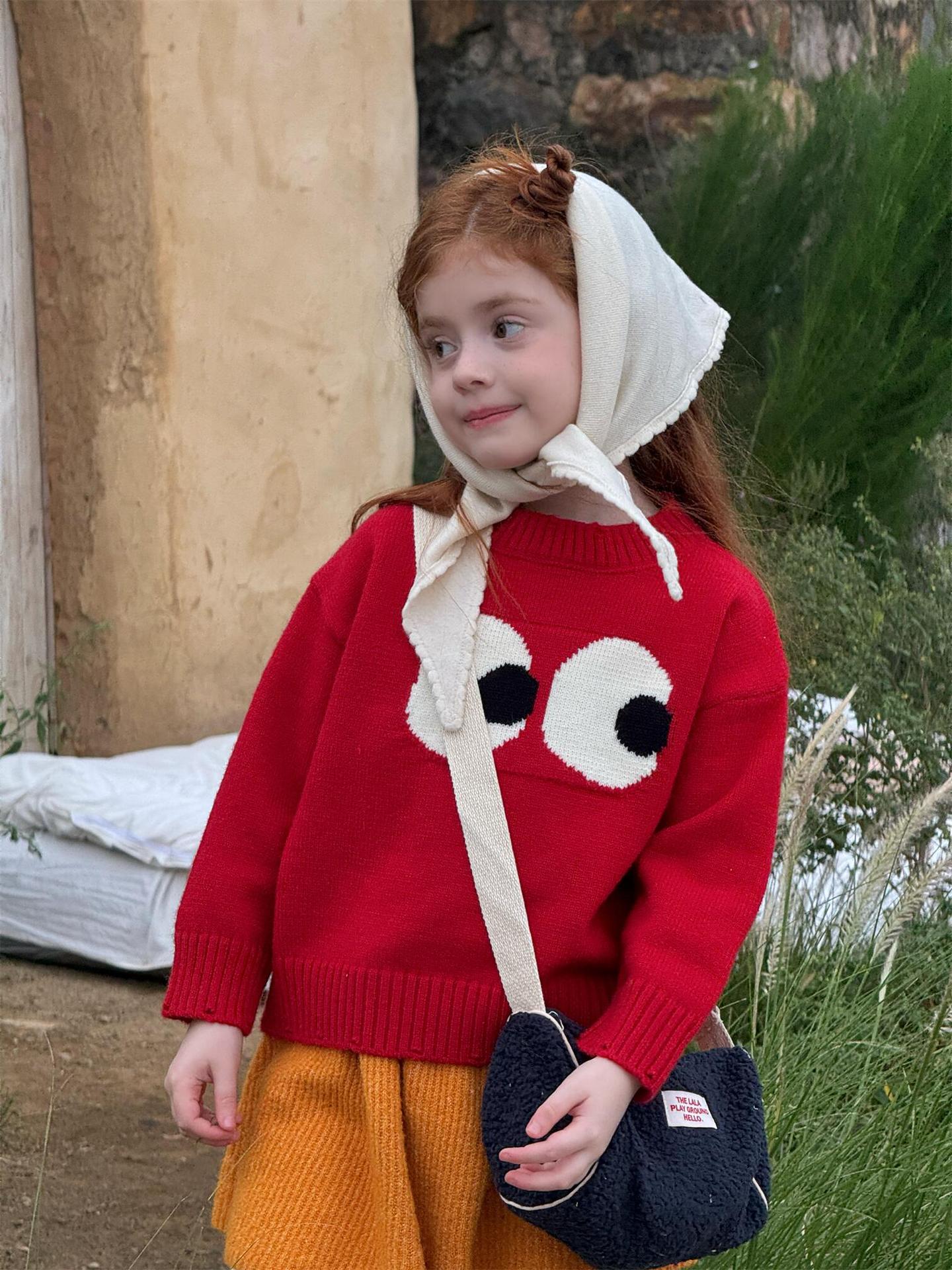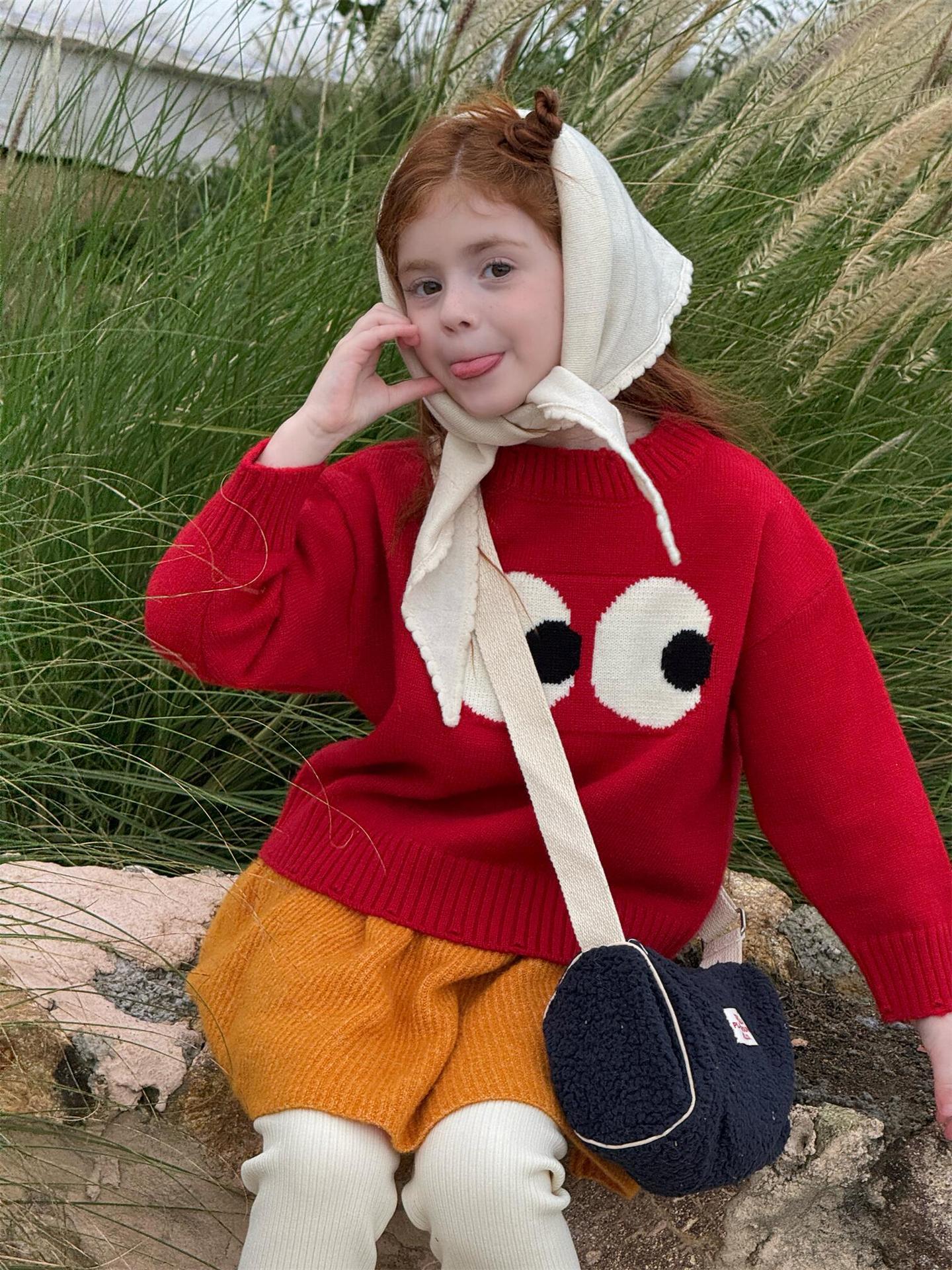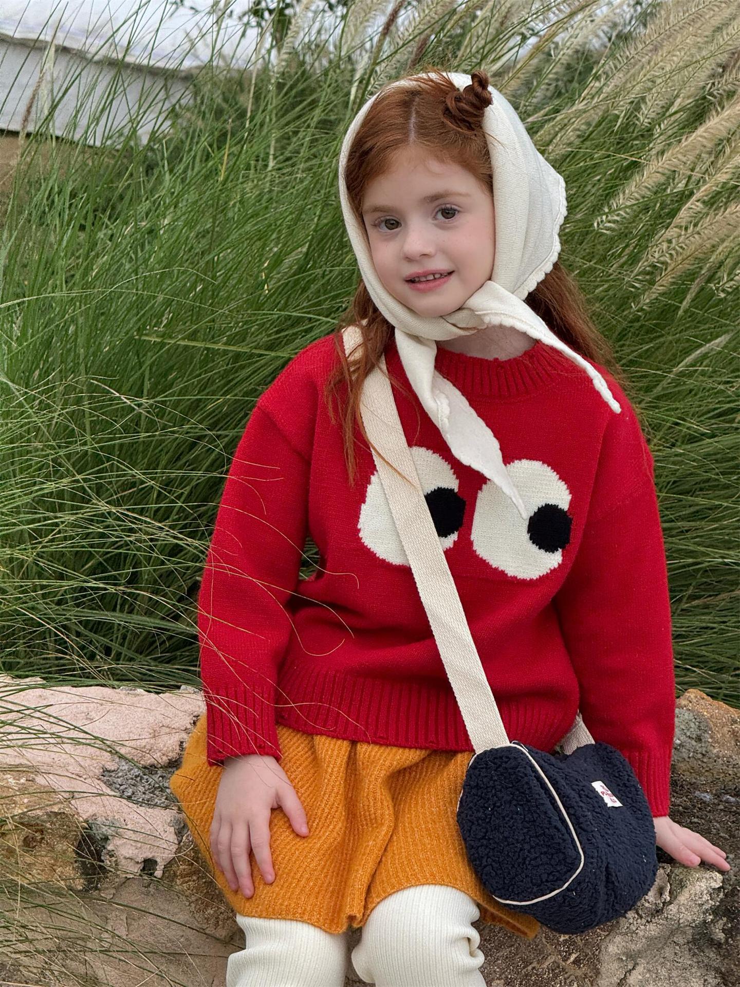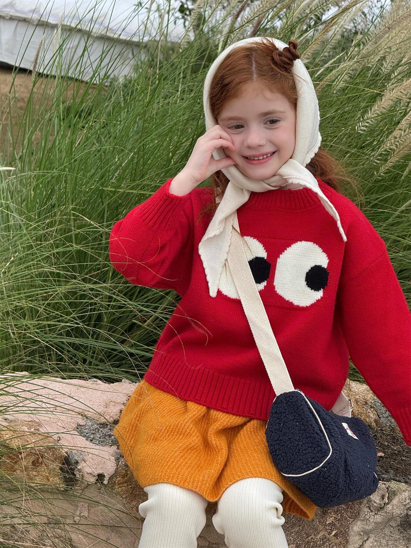 ふっくらと柔らかな肌触りが心地よい長袖ニットセーターは、大きなもこもこ目玉のモチーフが遊び心をくすぐるデザインです。ゆったりとしたシルエットのクルーネックプルオーバーは、着るだけで愛らしいムードを演出し、女の子のデイリーコーディネートをクラスアップします。シンプルながらも存在感のあるビッグアイニットは、お出かけを楽しく彩る子ども服として、感度の高い方々から注目のアイテムです。