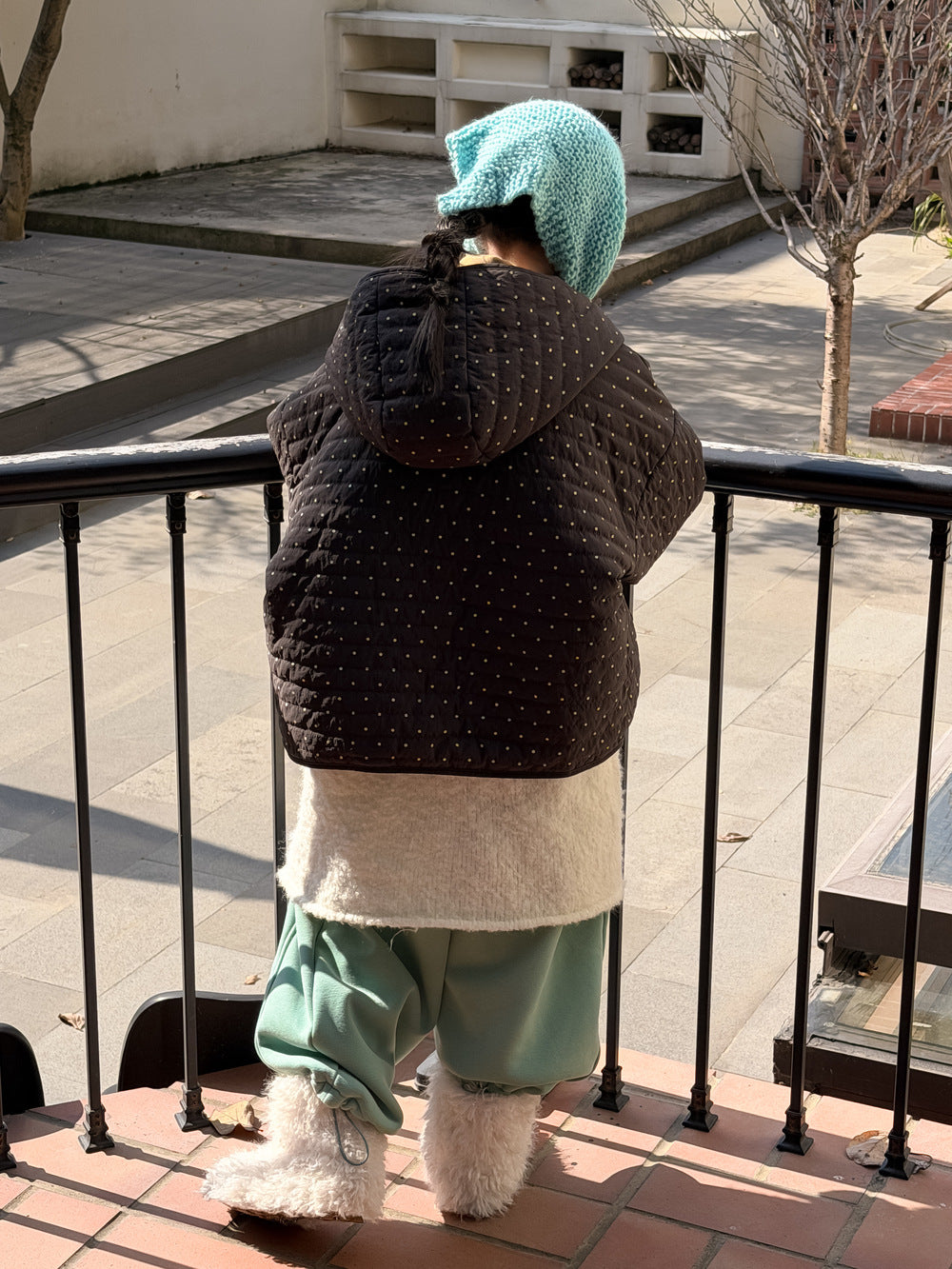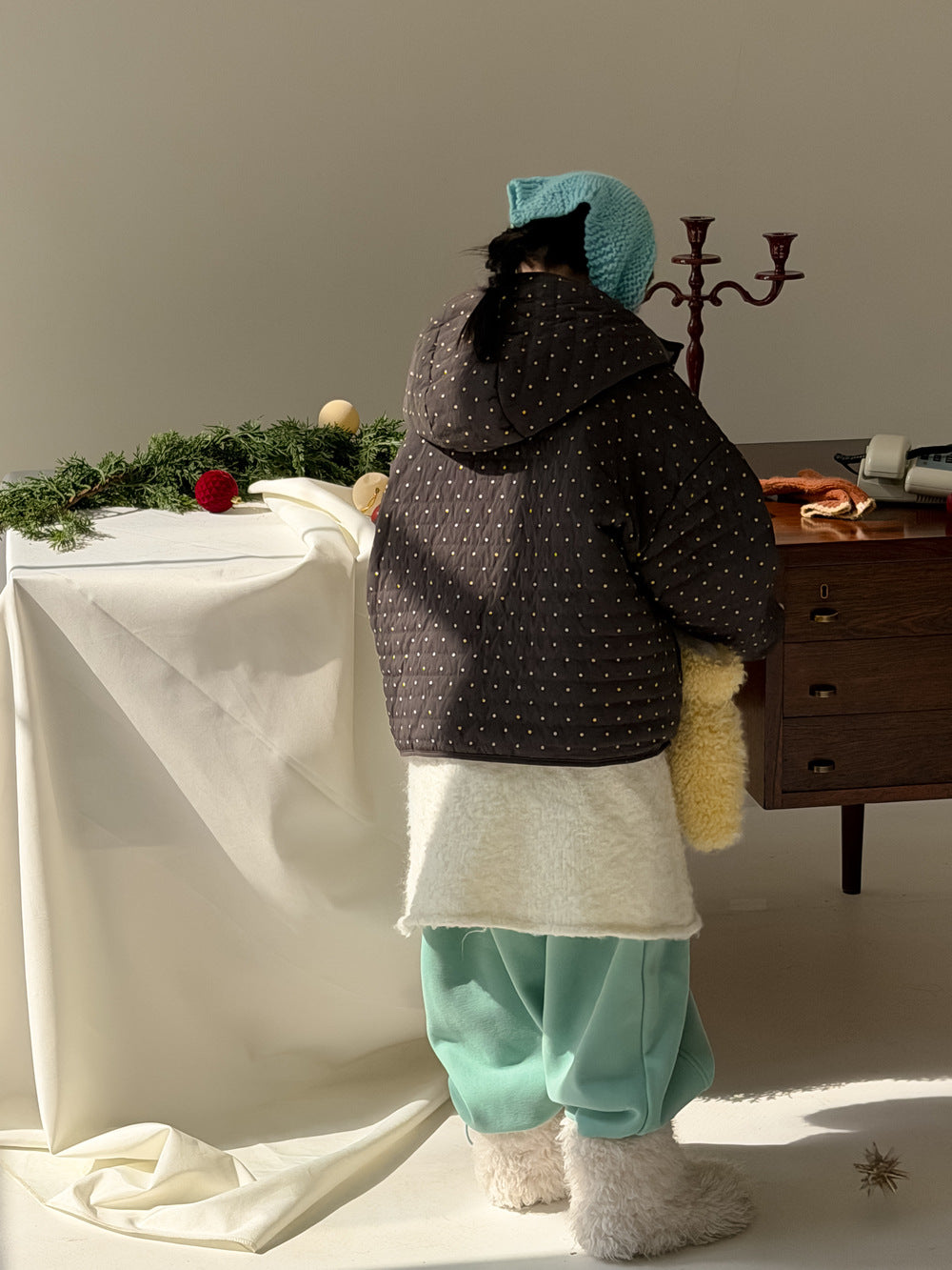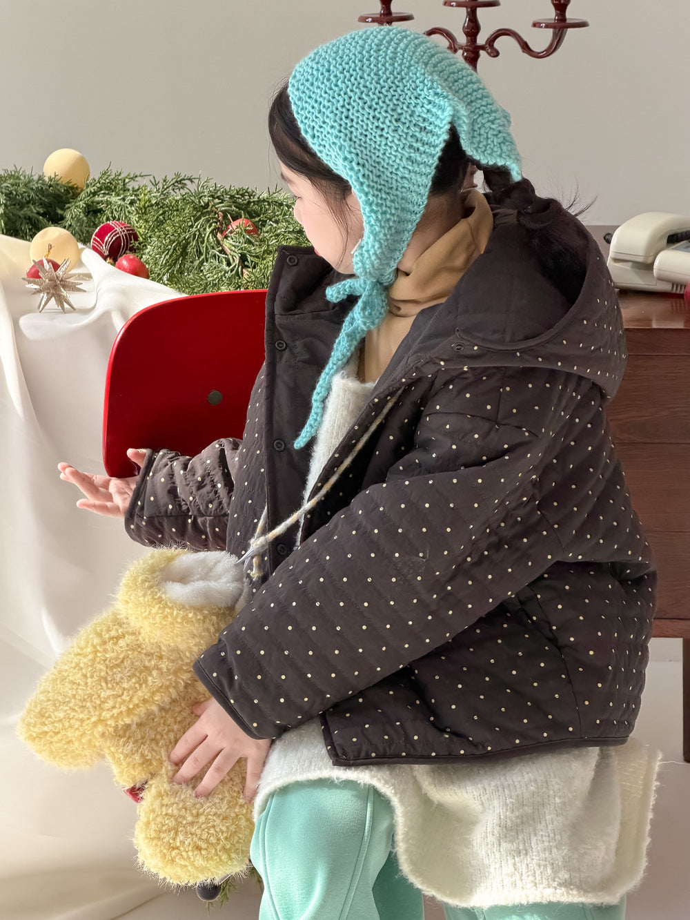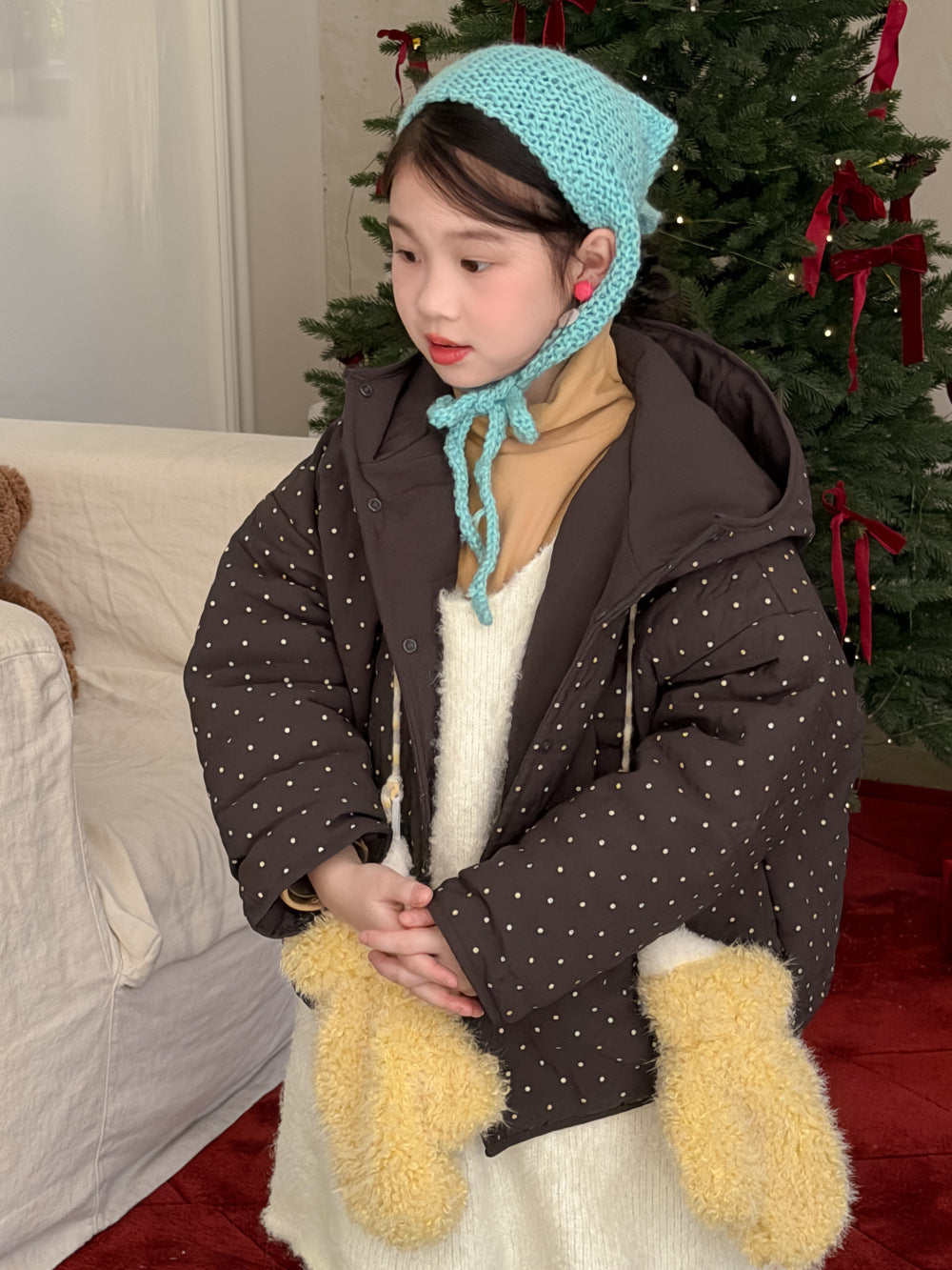 水玉柄のドットプリントが目を引く中綿ブルゾンジャケットは、ボリューム感のあるシルエットが魅力的なアウターです。フーディデザインを採用したショート丈のジャケットは、軽やかな着心地ながらもしっかりとした厚みを持ち、お出かけの際のコーディネートを華やかに彩る子供服です。洗練されたデザインが印象的な子ども服は、お子さまの愛らしさを引き立てつつモダンな雰囲気を演出する一着です。