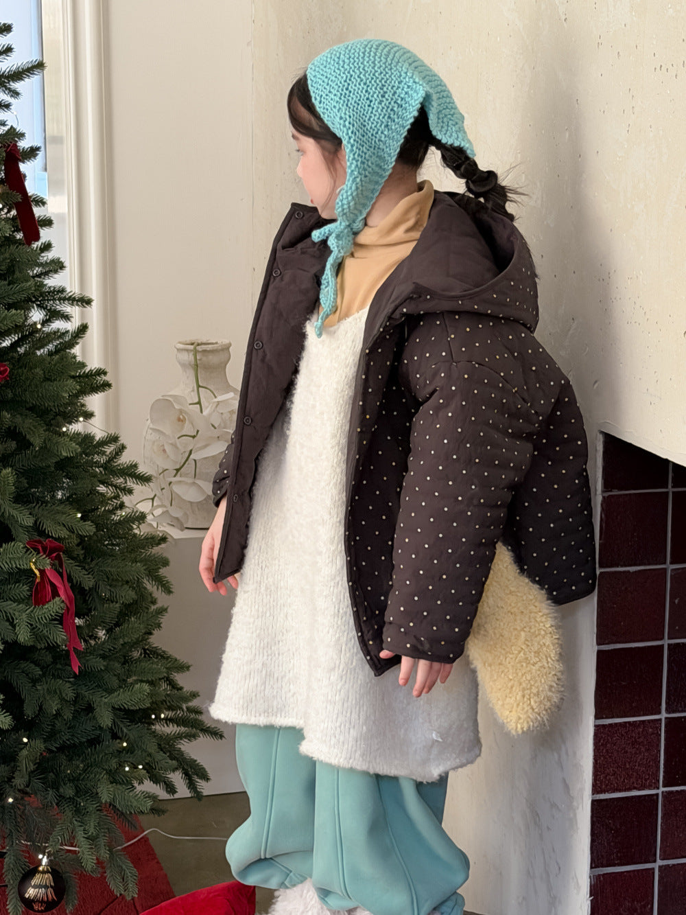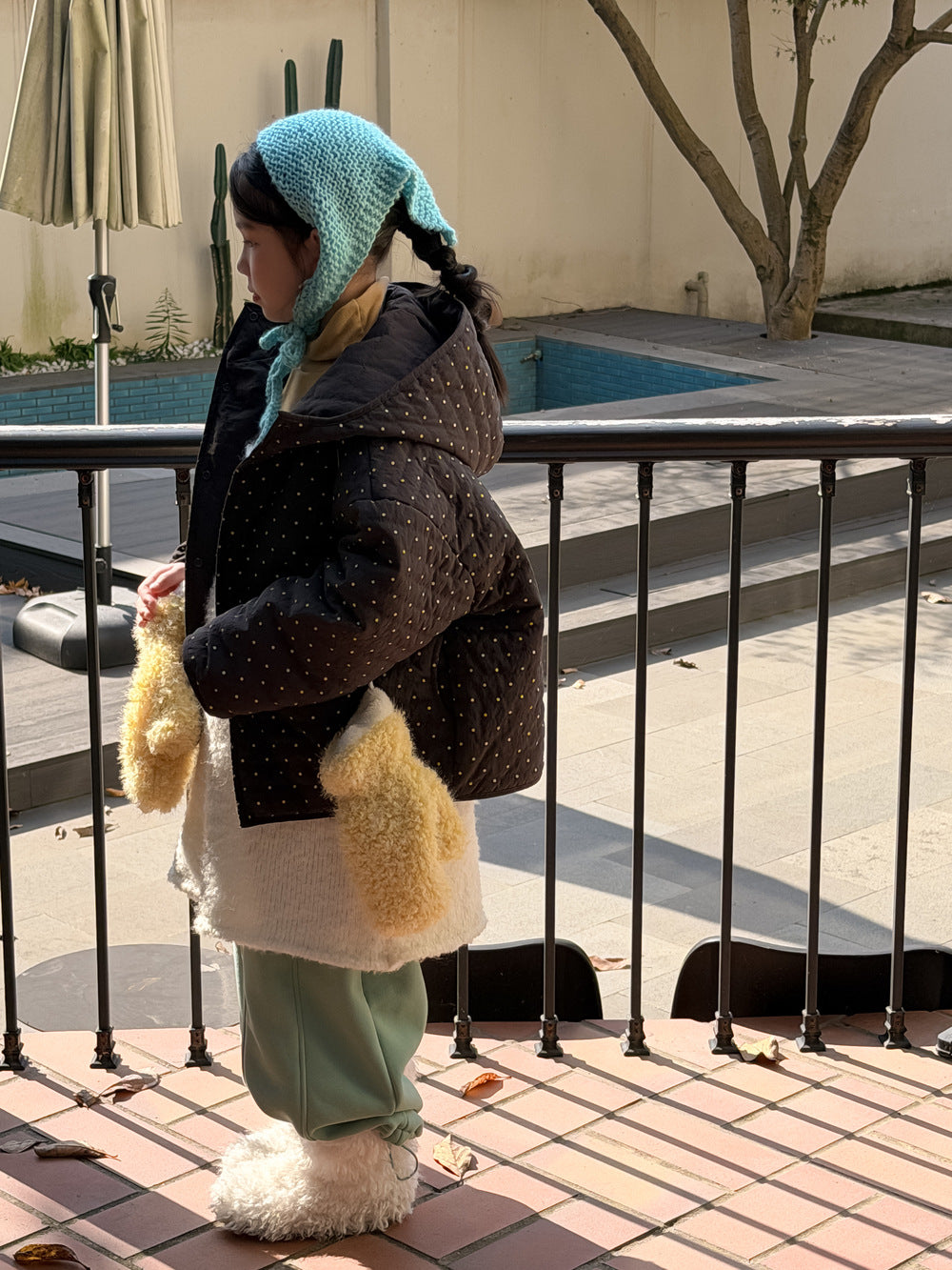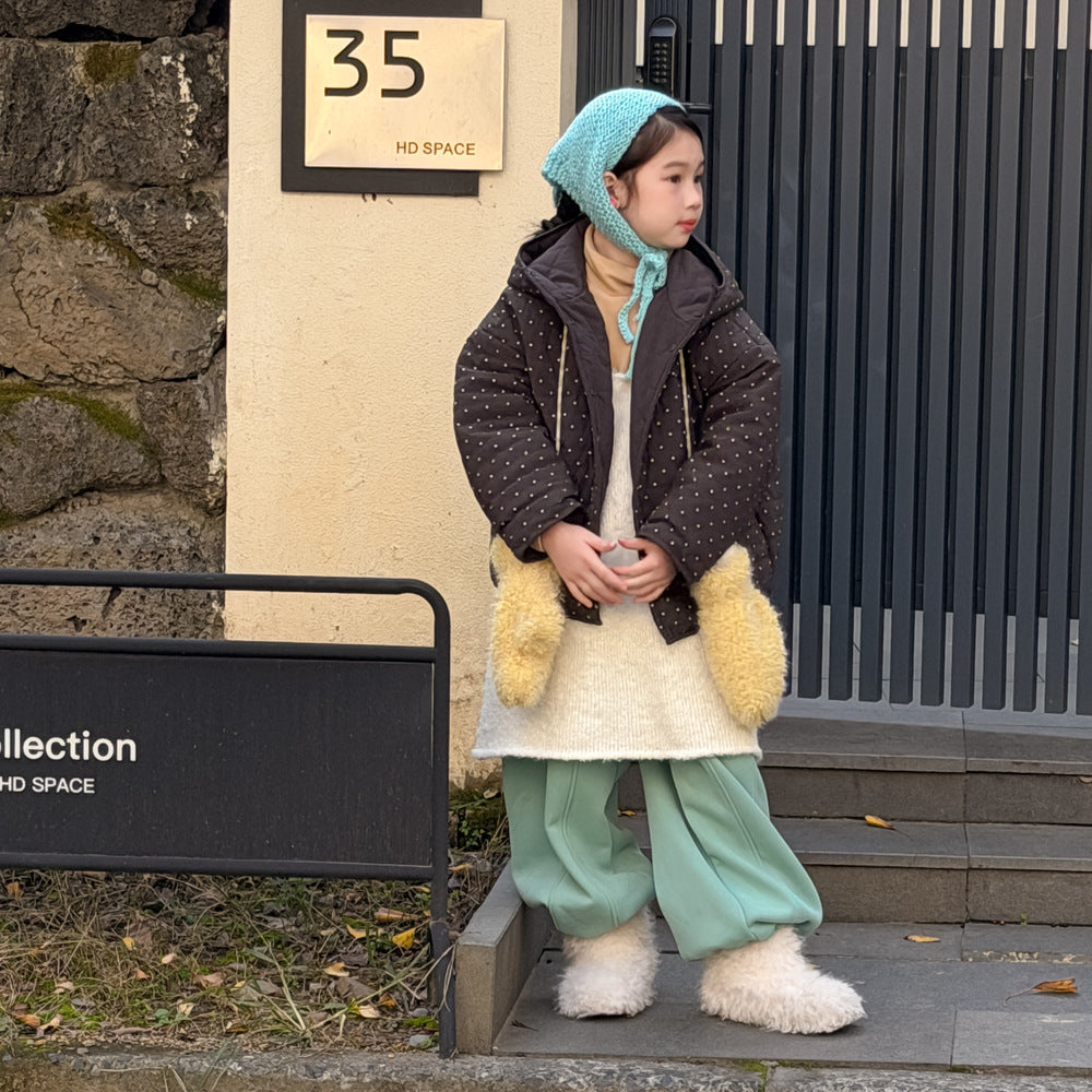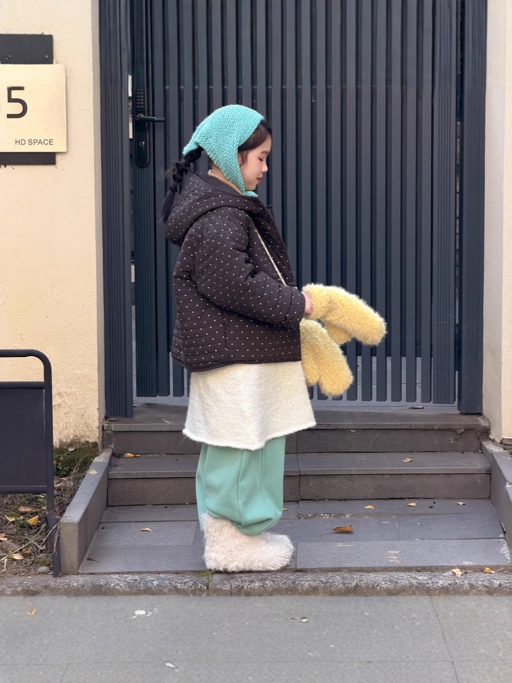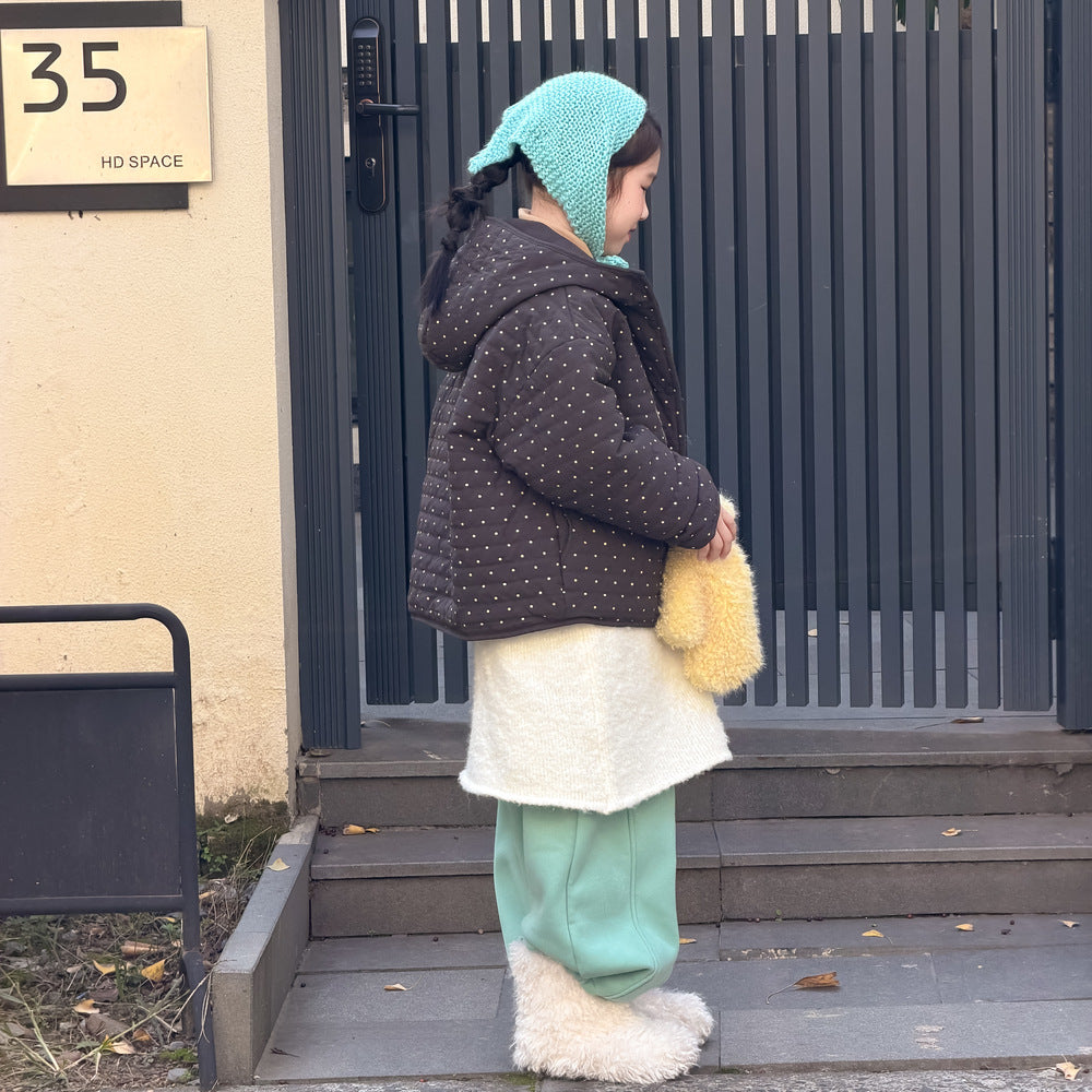 水玉柄のドットプリントが目を引く中綿ブルゾンジャケットは、ボリューム感のあるシルエットが魅力的なアウターです。フーディデザインを採用したショート丈のジャケットは、軽やかな着心地ながらもしっかりとした厚みを持ち、お出かけの際のコーディネートを華やかに彩る子供服です。洗練されたデザインが印象的な子ども服は、お子さまの愛らしさを引き立てつつモダンな雰囲気を演出する一着です。