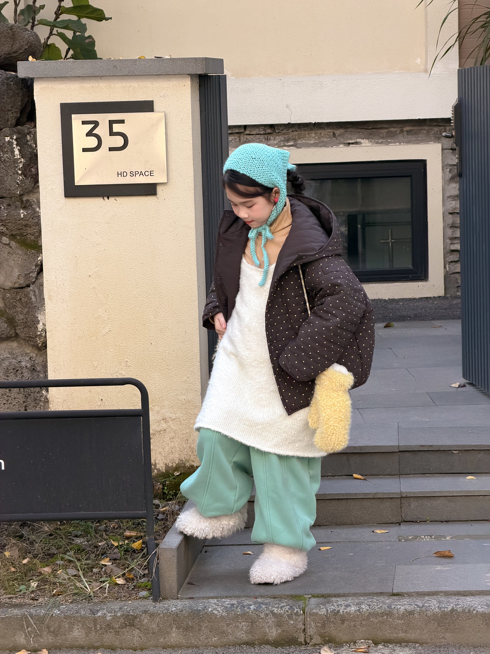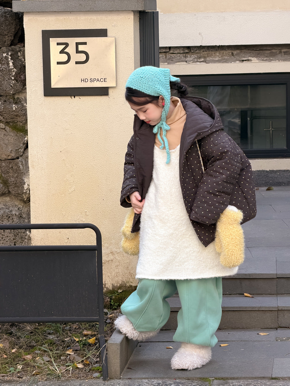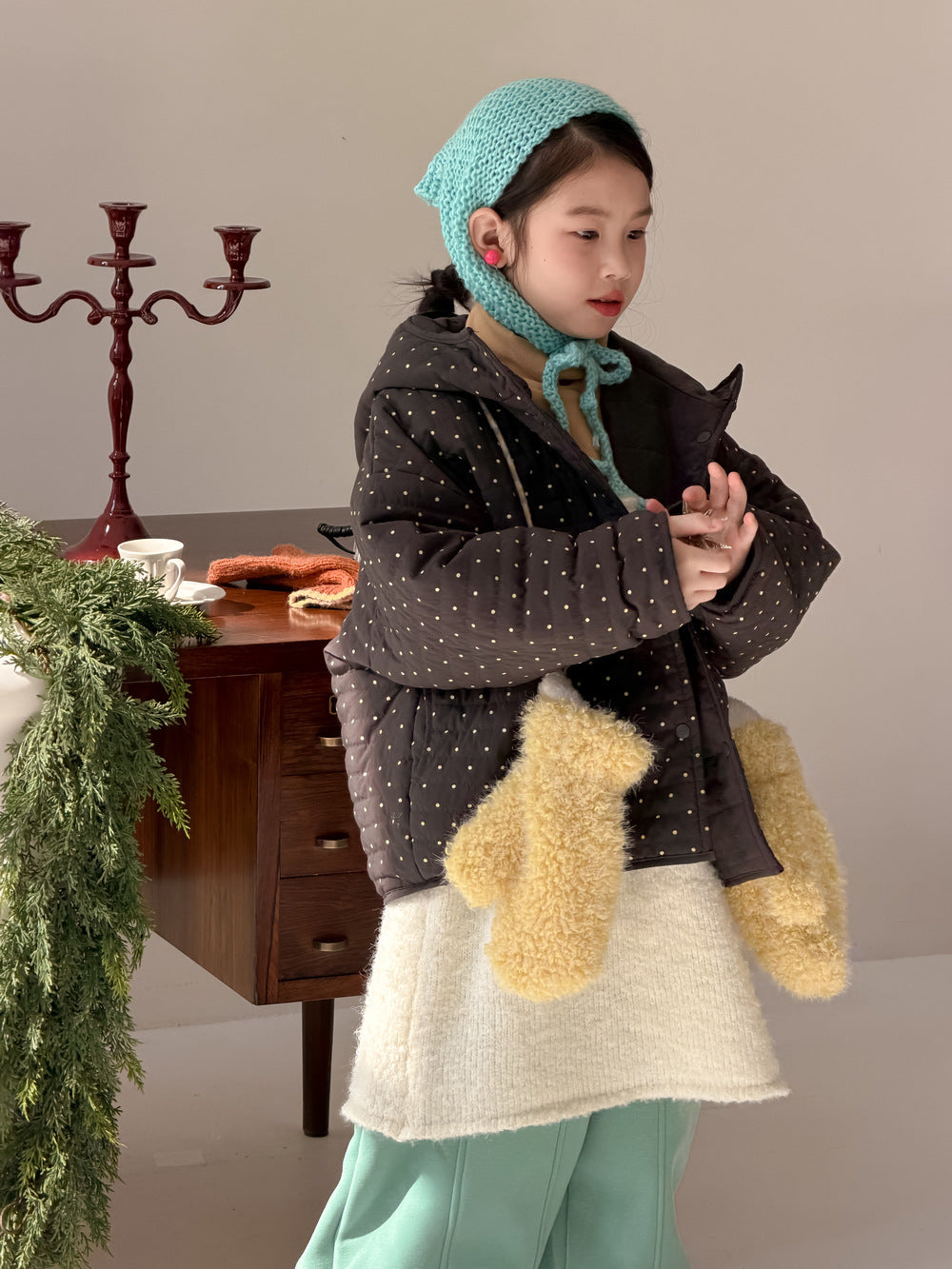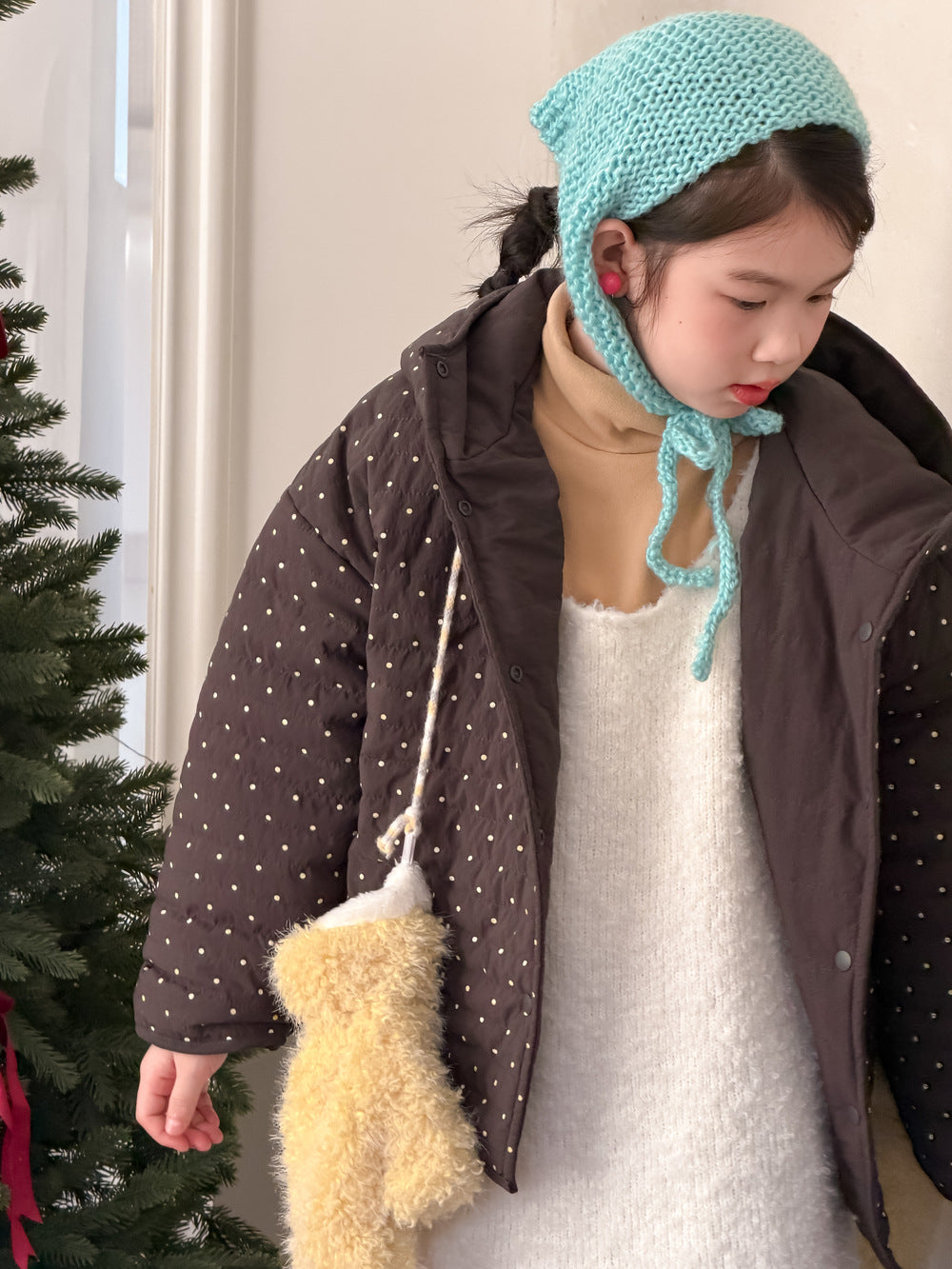 水玉柄のドットプリントが目を引く中綿ブルゾンジャケットは、ボリューム感のあるシルエットが魅力的なアウターです。フーディデザインを採用したショート丈のジャケットは、軽やかな着心地ながらもしっかりとした厚みを持ち、お出かけの際のコーディネートを華やかに彩る子供服です。洗練されたデザインが印象的な子ども服は、お子さまの愛らしさを引き立てつつモダンな雰囲気を演出する一着です。