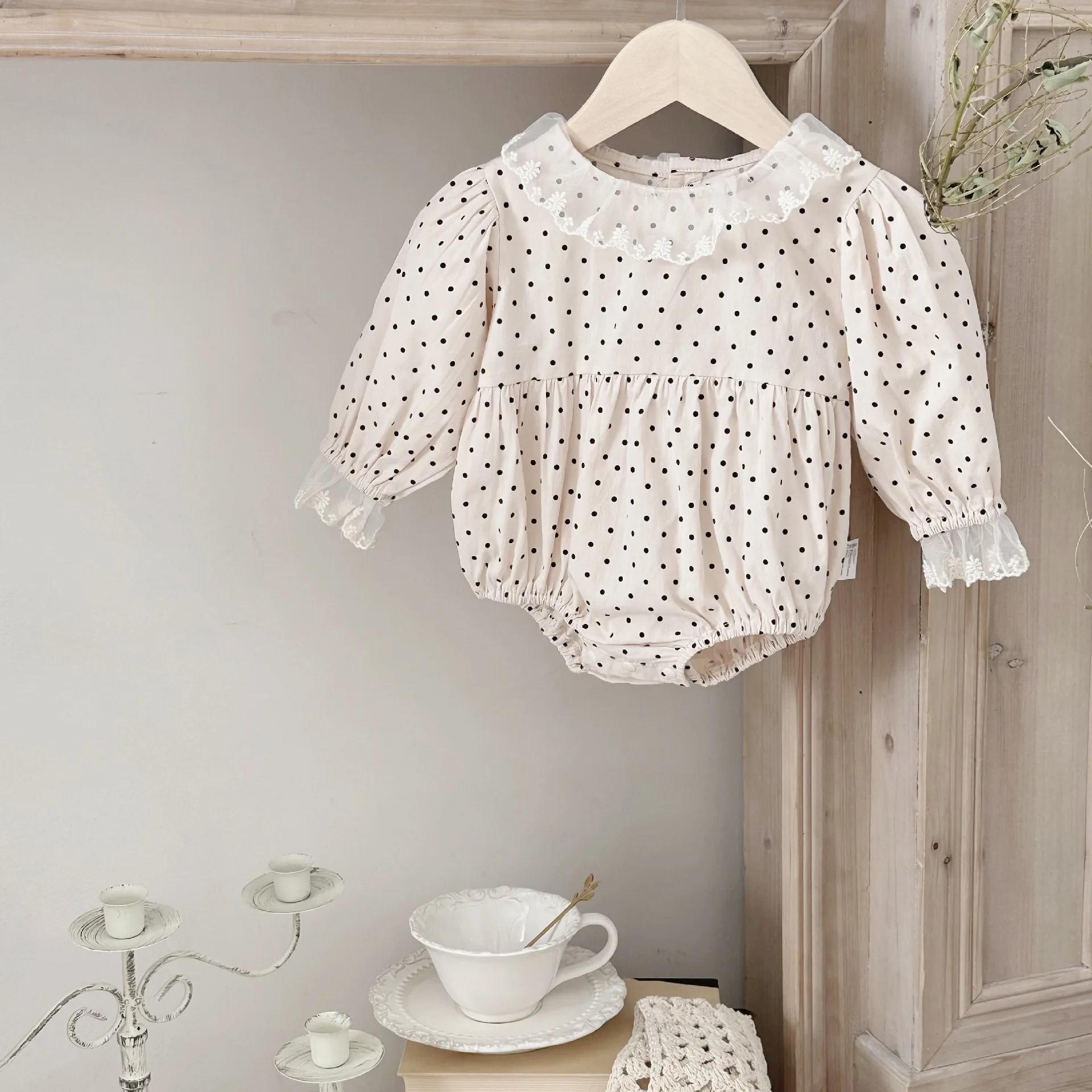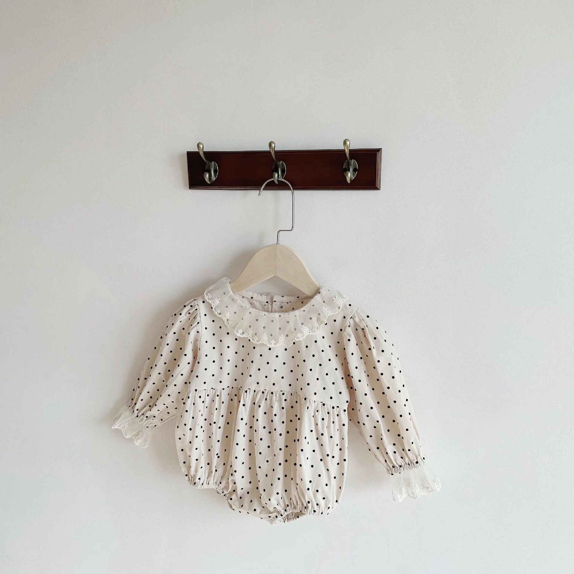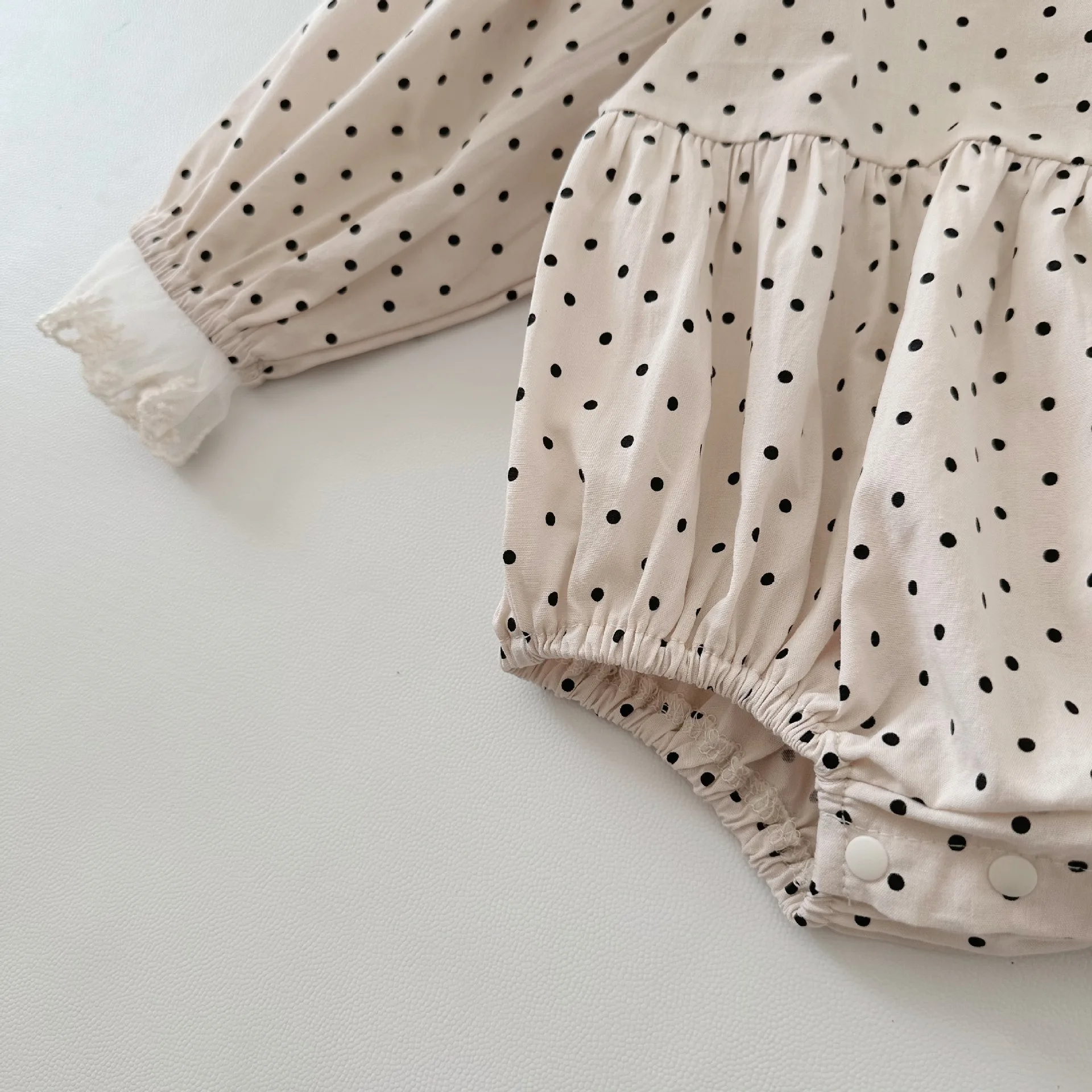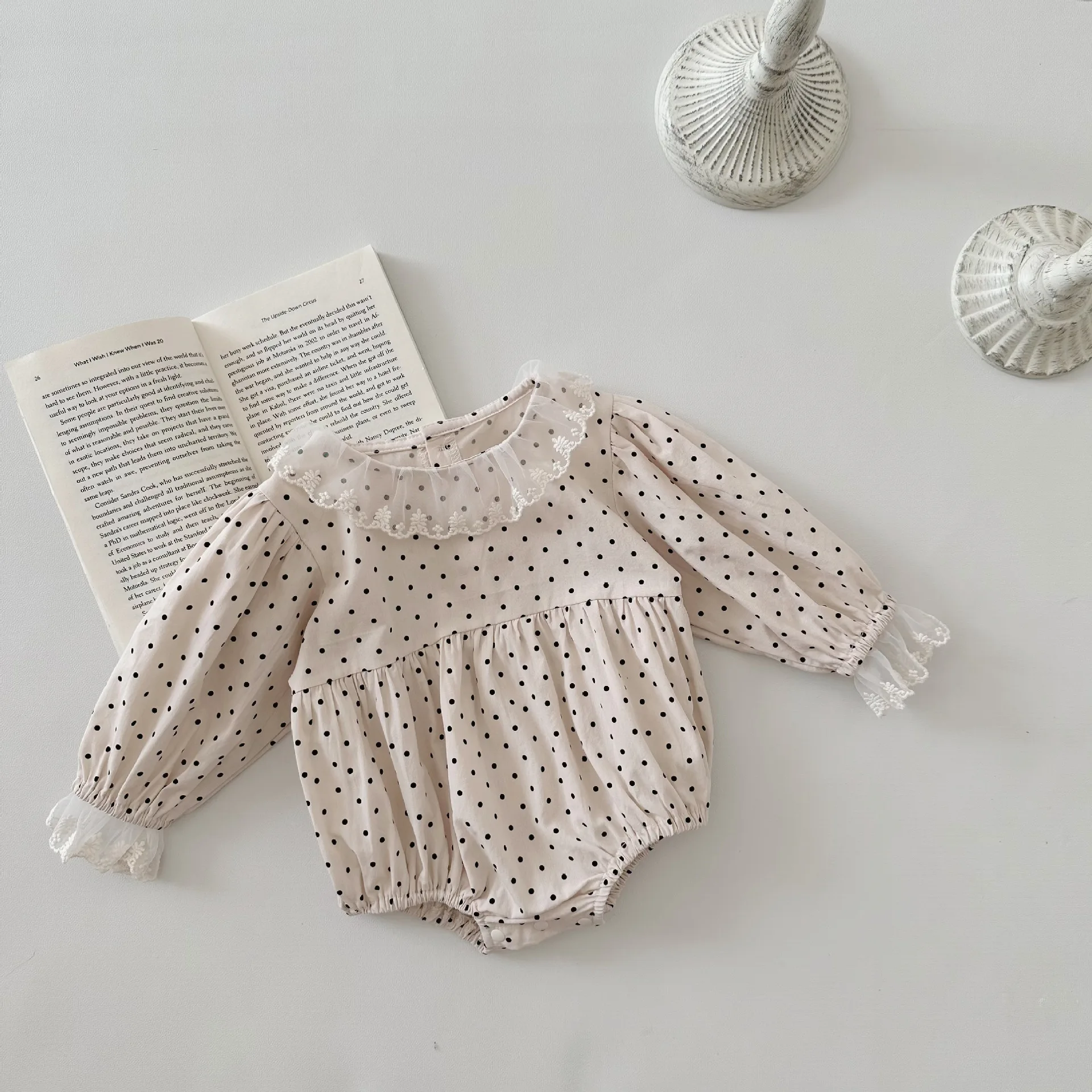 ベビーロンパース 長袖パフスリーブボディスーツ レース 水玉ドットプリント【mh0004666】