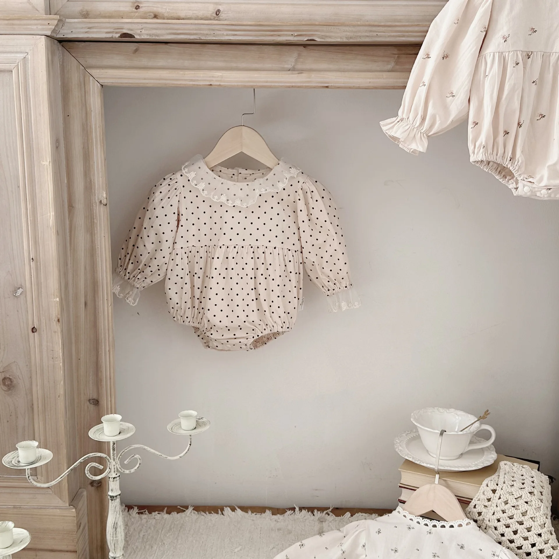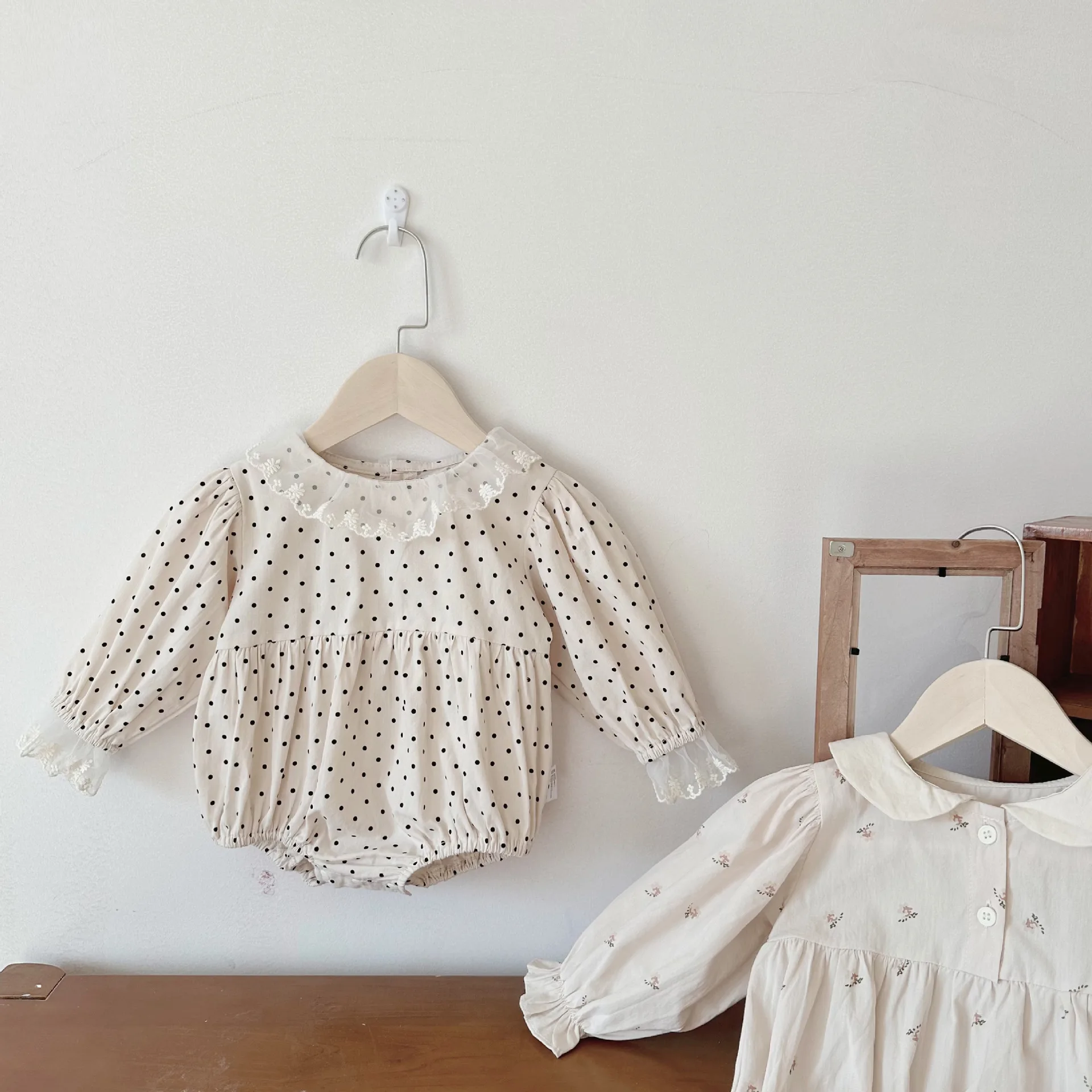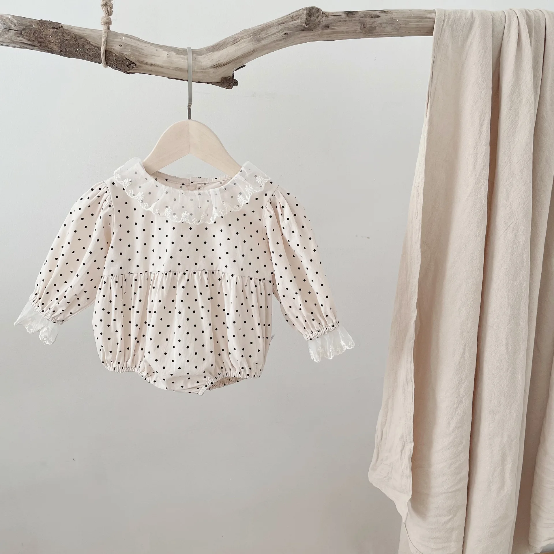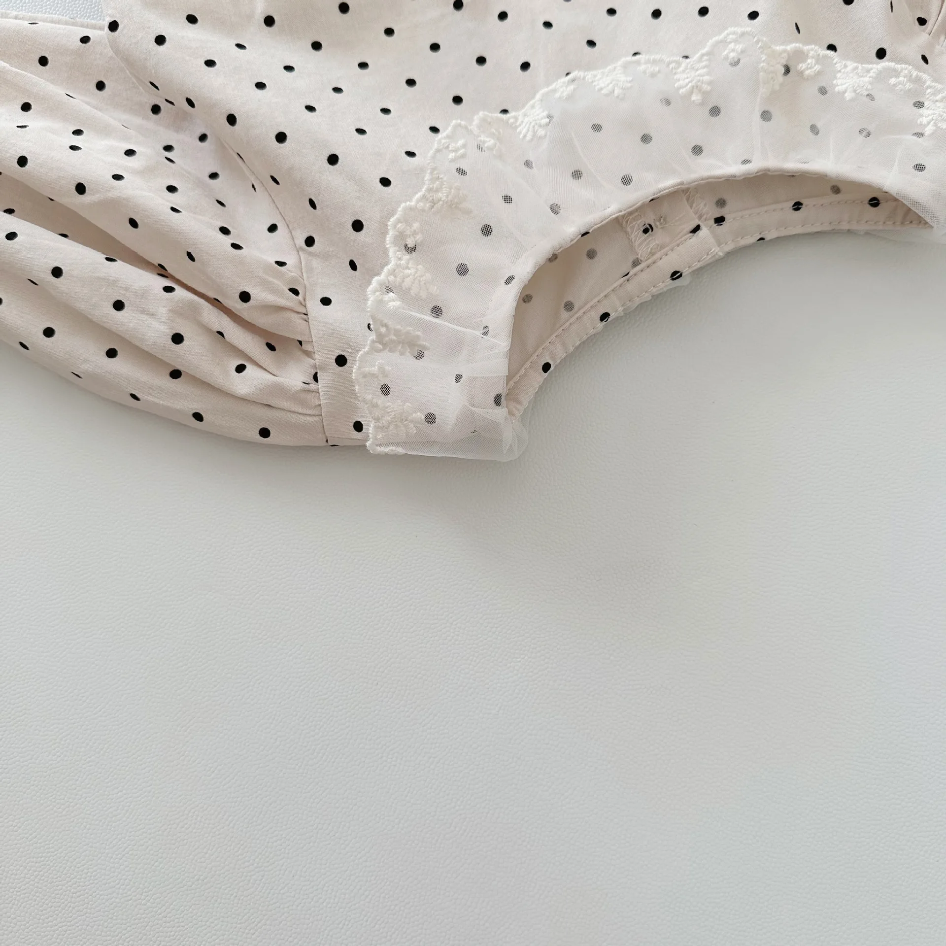 ベビーロンパース 長袖パフスリーブボディスーツ レース 水玉ドットプリント【mh0004666】