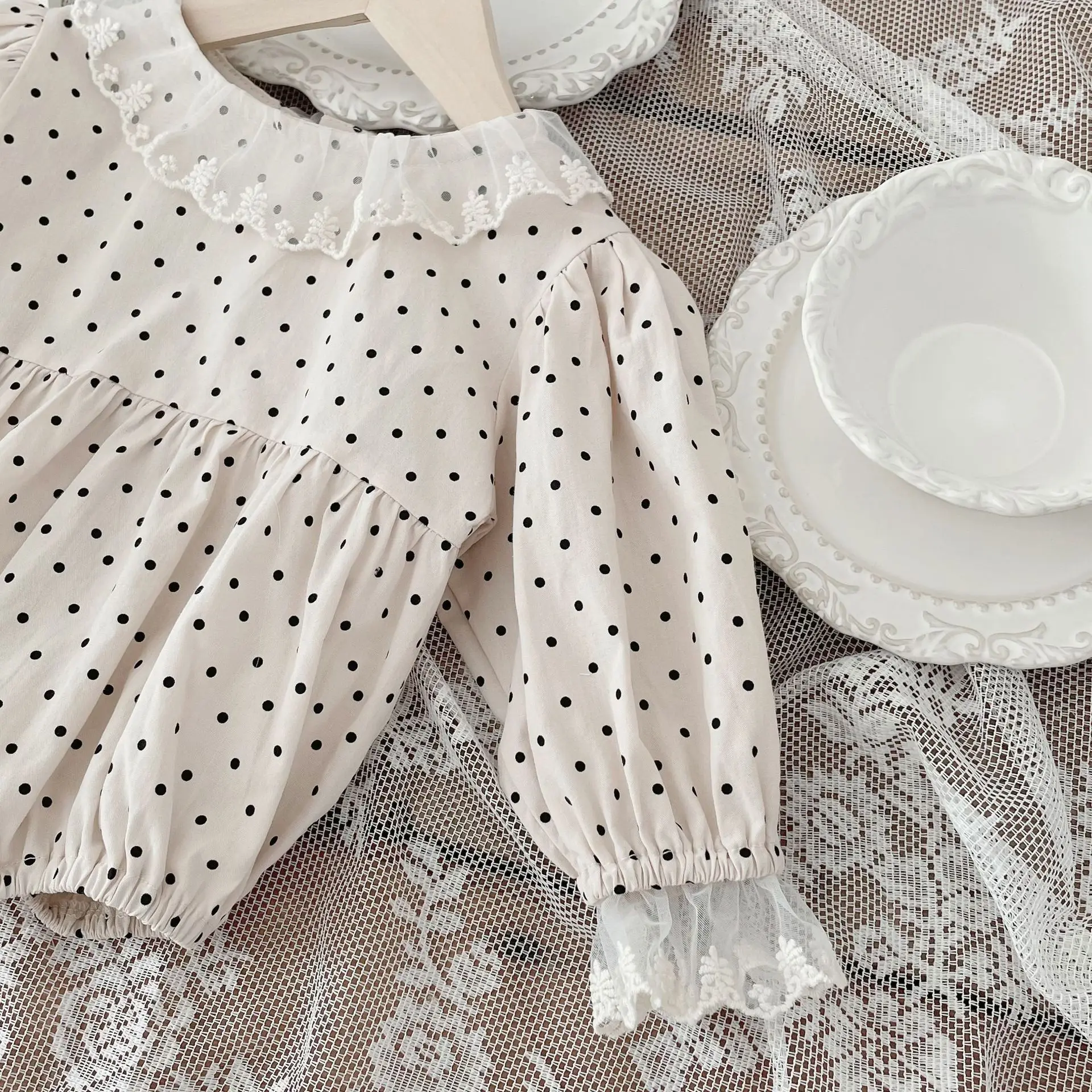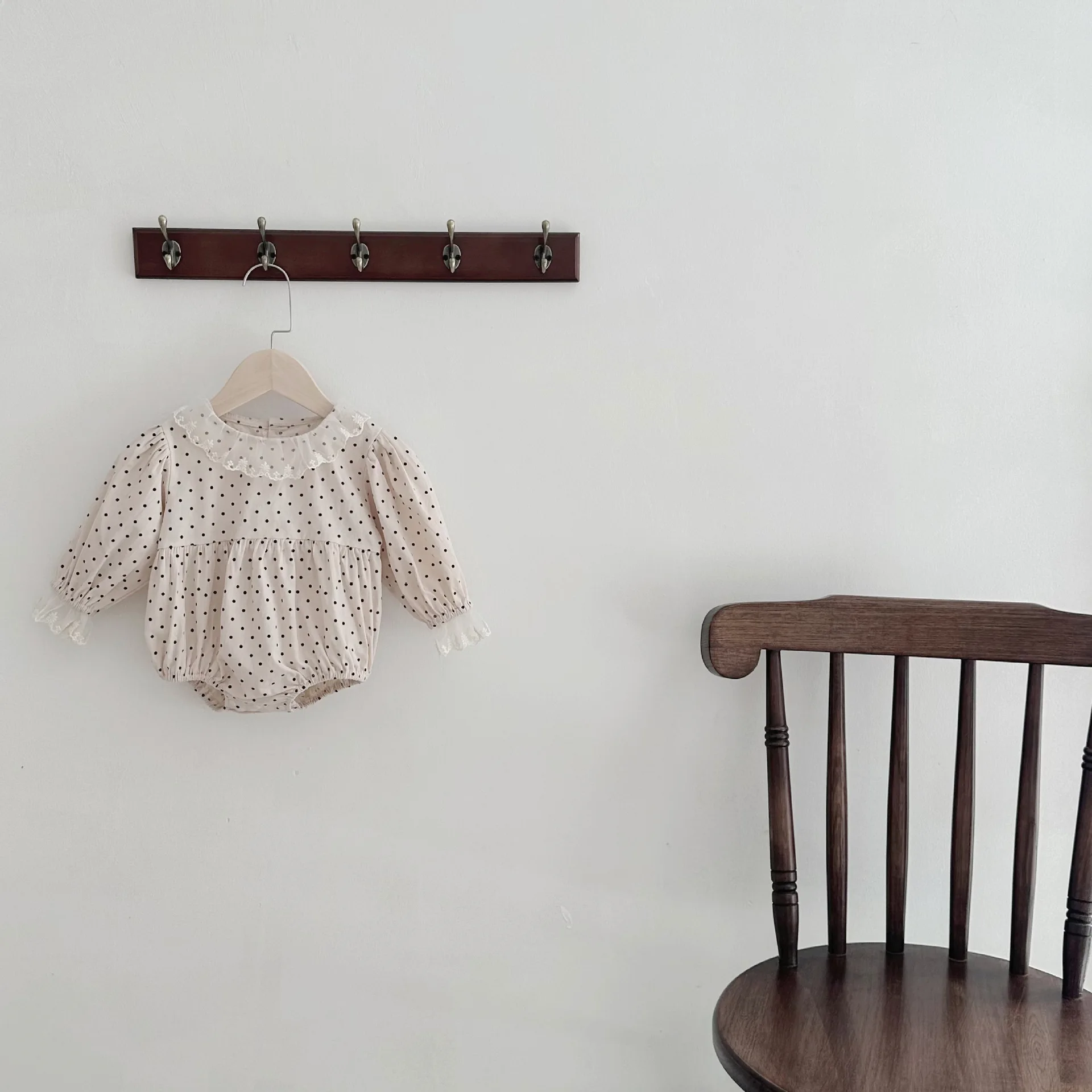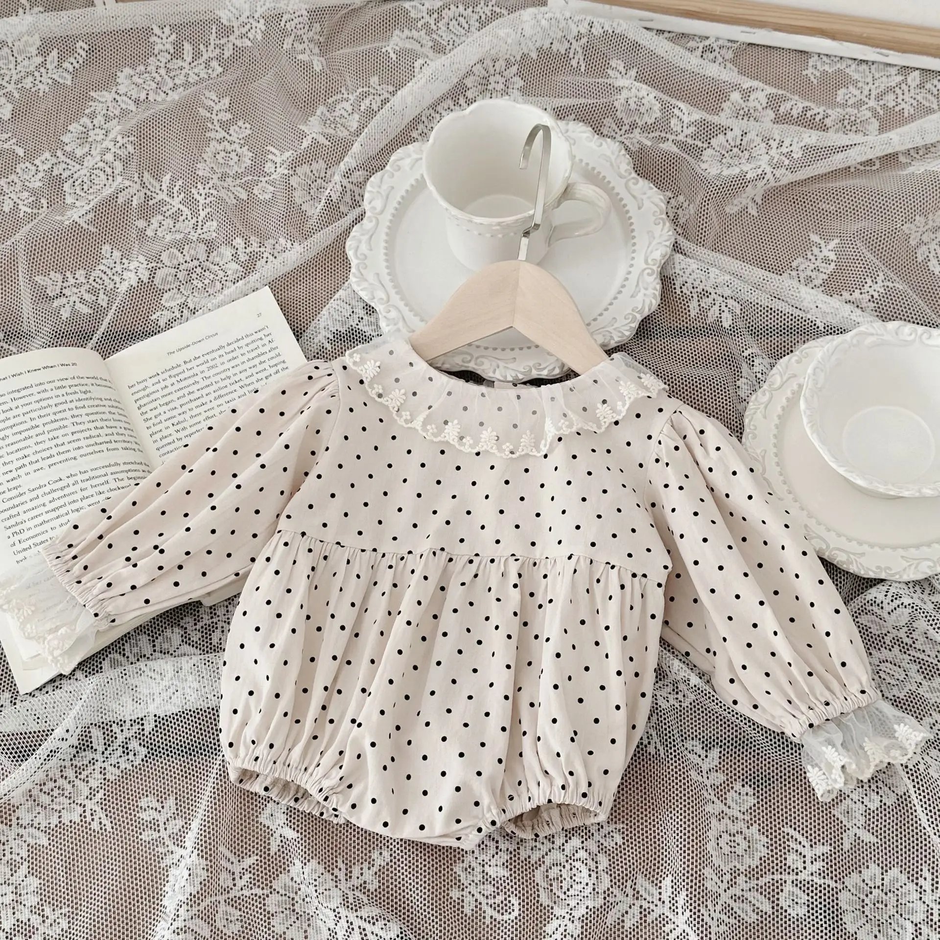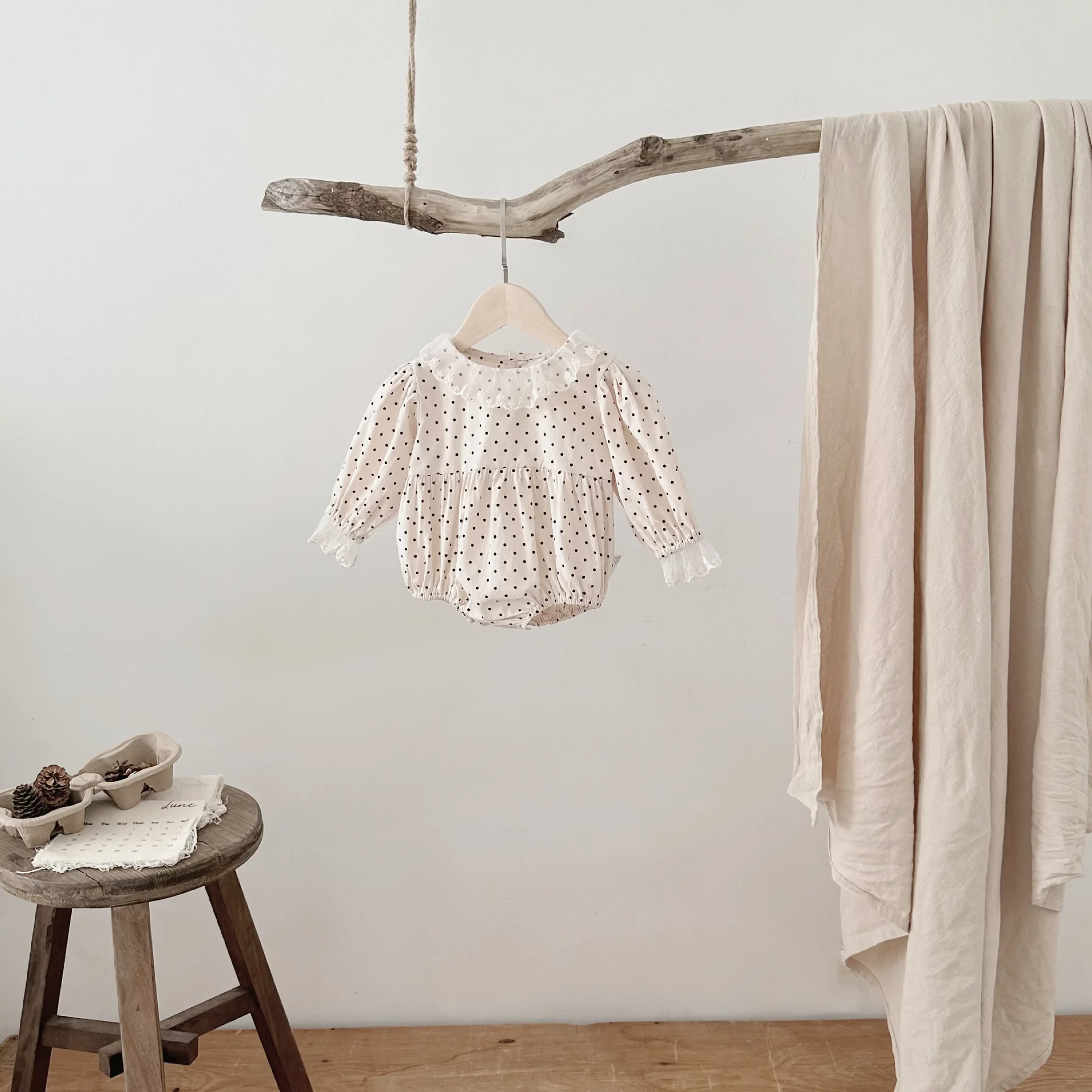 ベビーロンパース 長袖パフスリーブボディスーツ レース 水玉ドットプリント【mh0004666】
