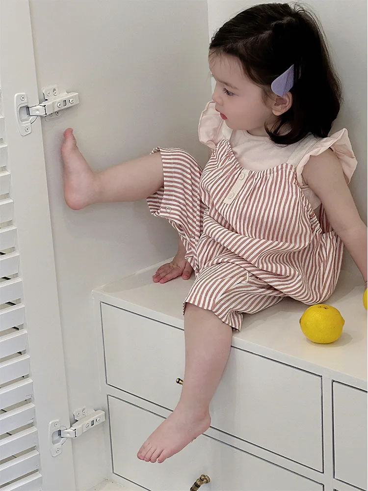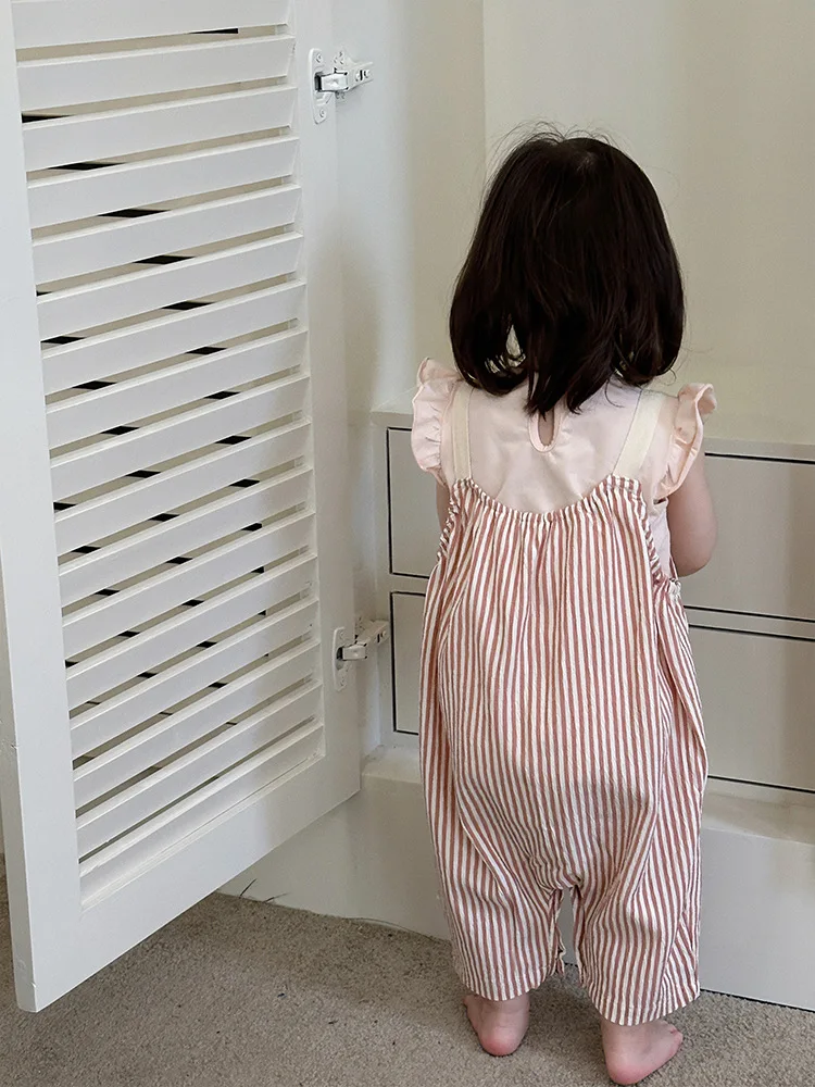 ベビートップス/サロペット フリルスリーブTシャツ/ストライプサスペンダージャンプスーツ ピンク【mh0006306】