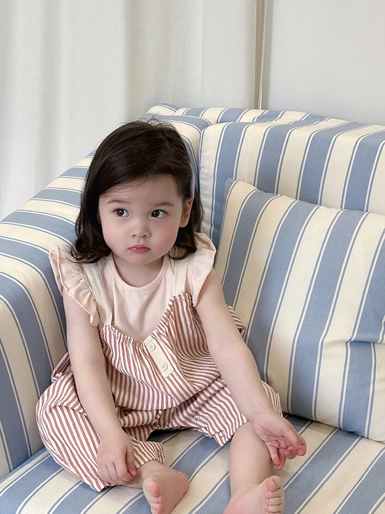 このサロペットは、夏に最適な薄手のジャンプスーツです。「フリルスリーブTシャツ」と「ストライプサスペンダー」のセットアップで、赤ちゃんの肌に優しいコットン素材を使用しています。お子様の動きを妨げず、涼しく快適に過ごせるように設計されています。