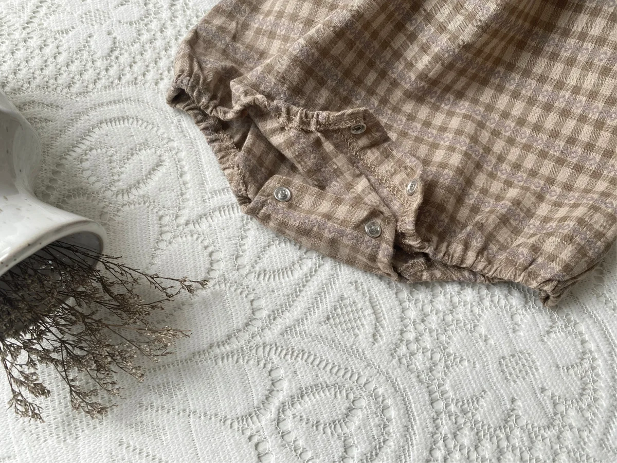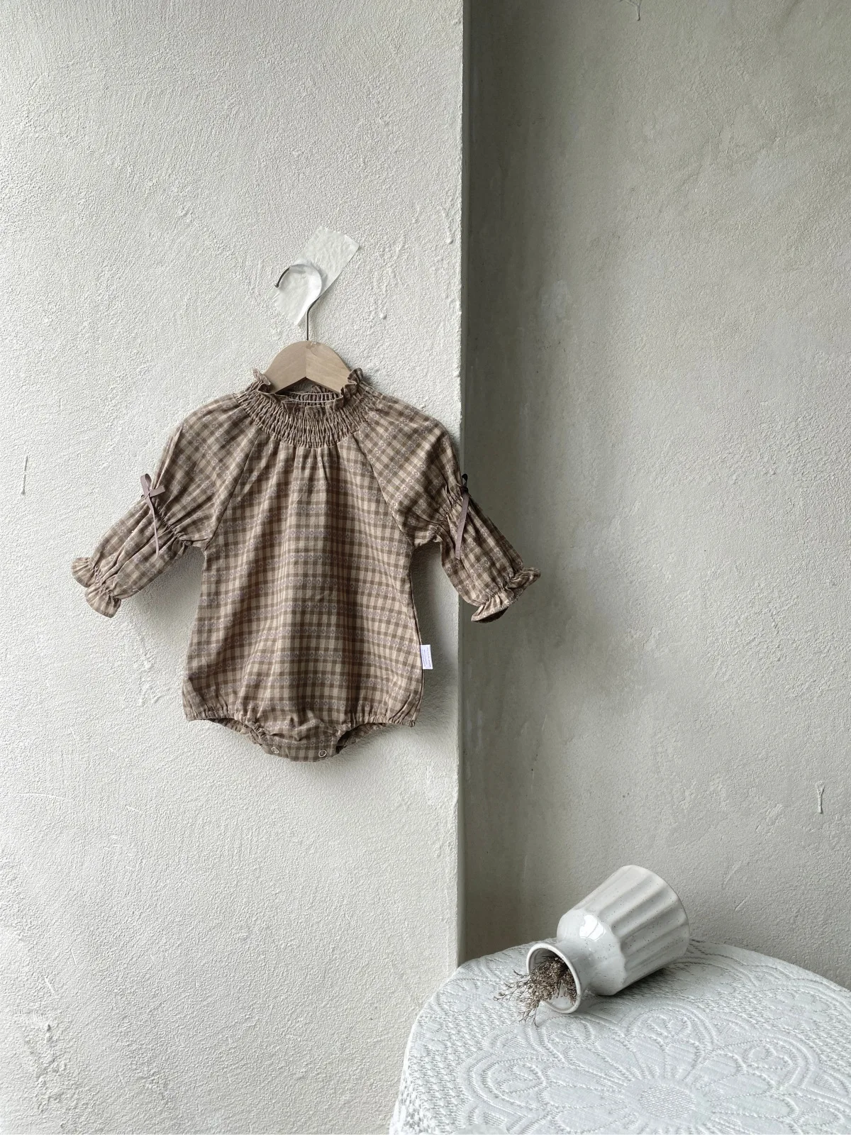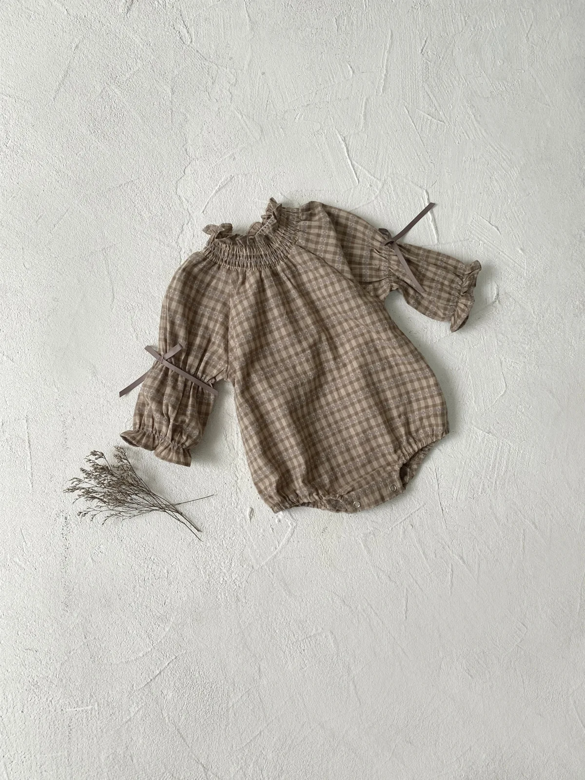 ベビーロンパース 長袖ボディスーツ リボン ベルスリーブ スタンドフリルカラー チェック【mh0006383】