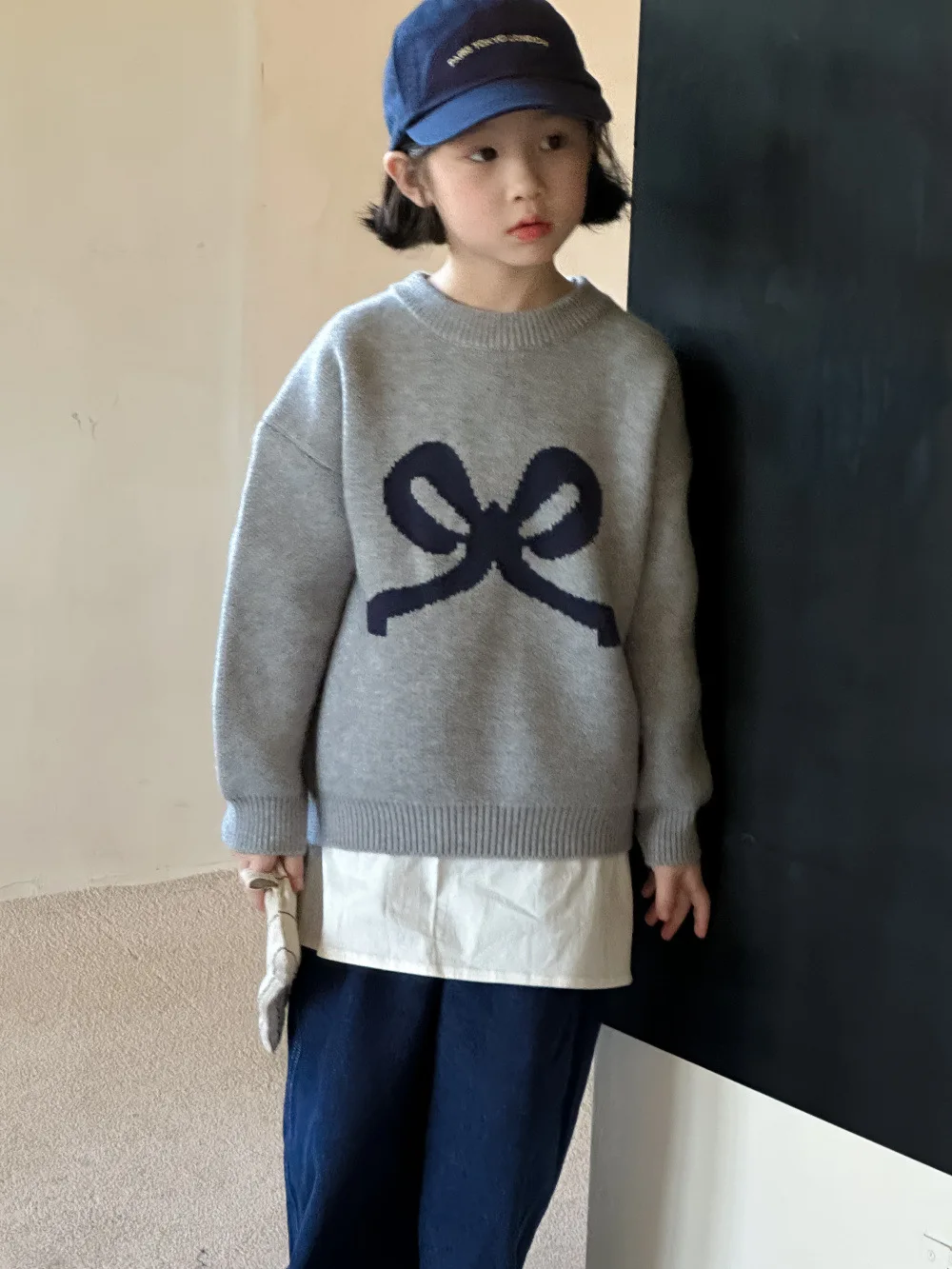 #キッズトップス #ビッグリボン #長袖ニット #グレーセーター #カジュアルファッション #子供服