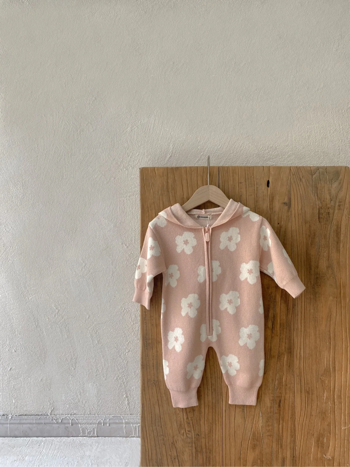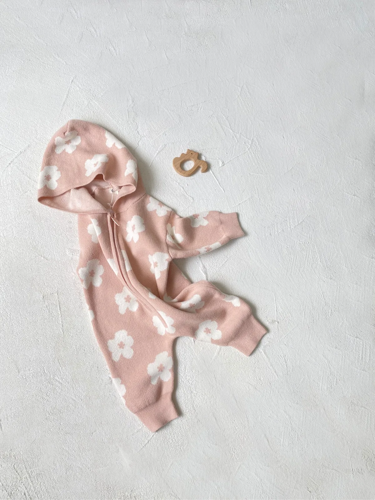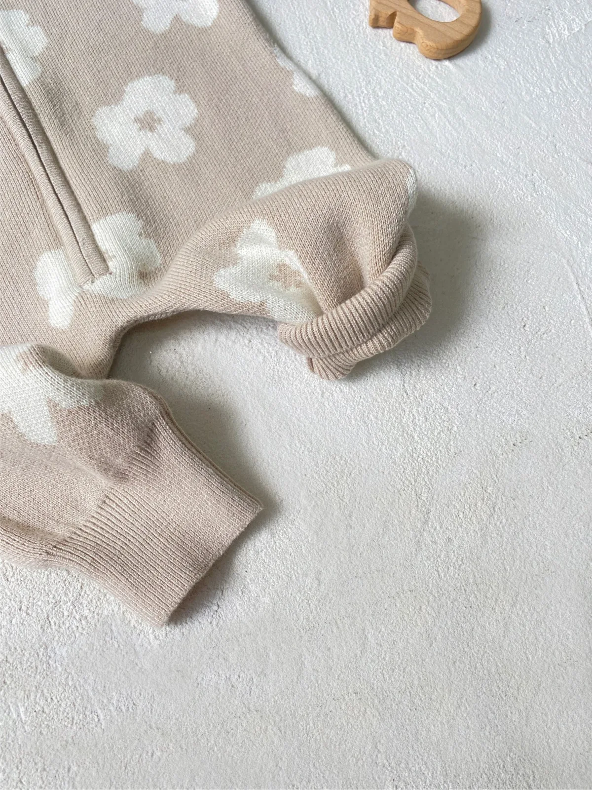 #ベビージャンプスーツ #ニットフーディ #フラワー柄 #長袖ロンパース #ジップアップ #赤ちゃん服