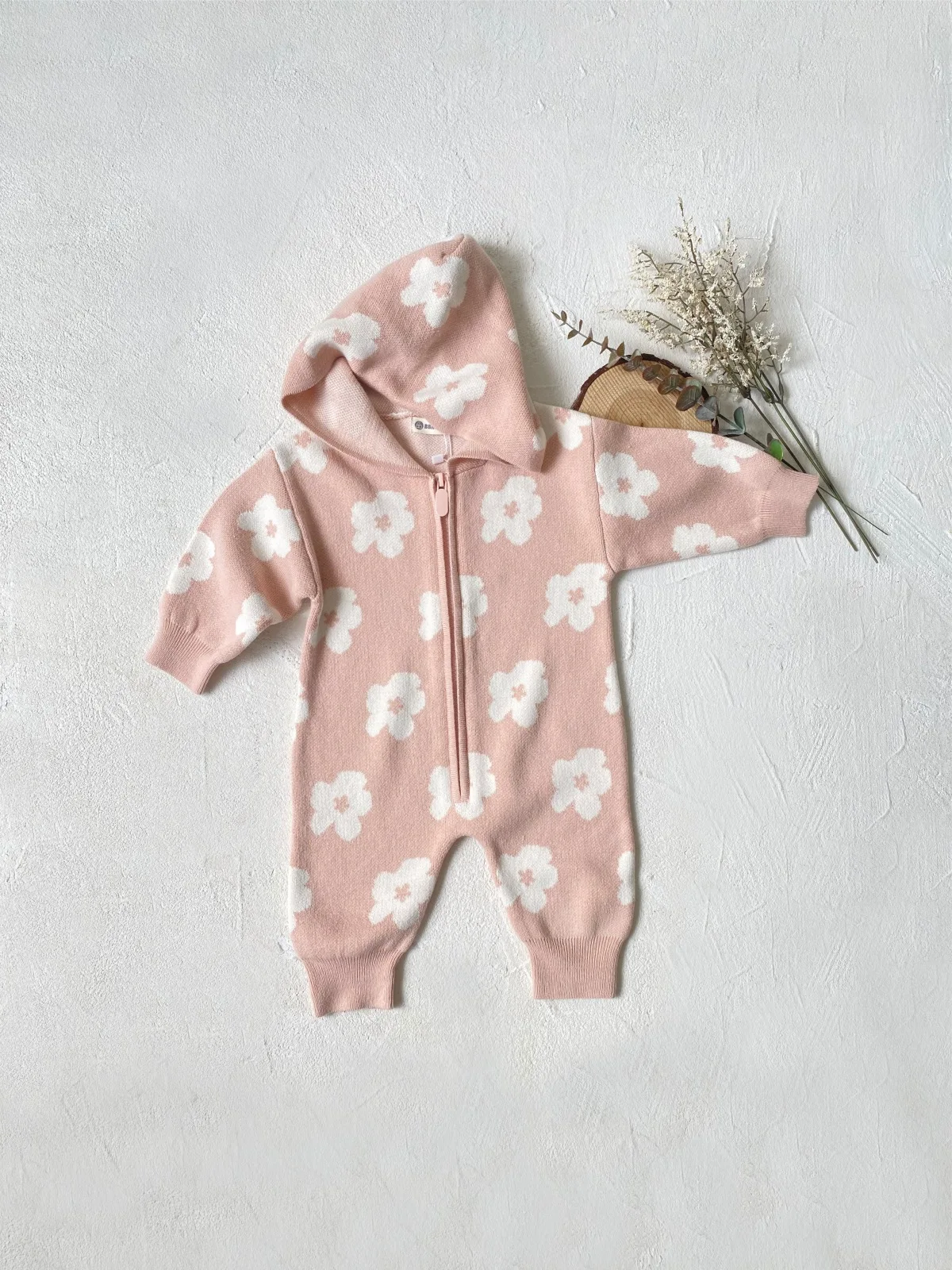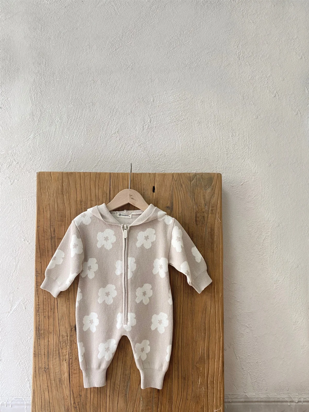 ベビージャンプスーツ レトロフラワーニットフーディ長袖ジップアップロンパース 2カラー【mh0006910】