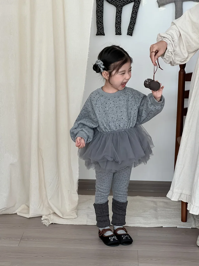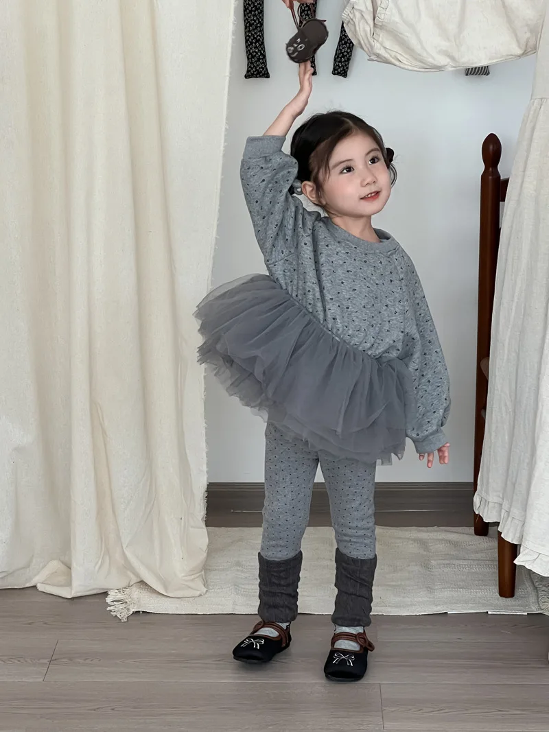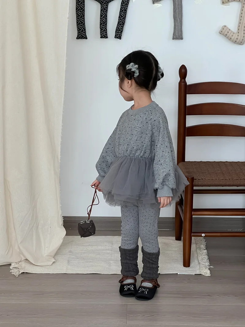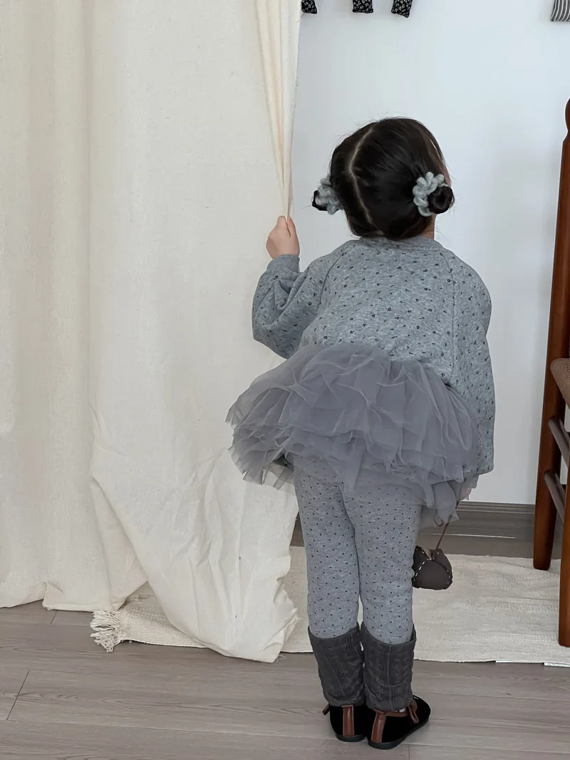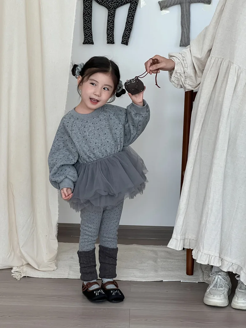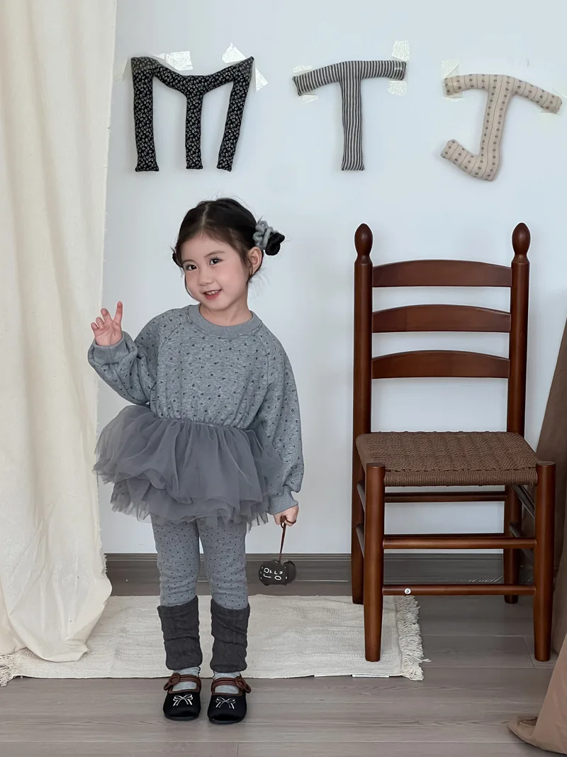 チュチュチュールのペプラムドッキング裏フリース長袖スウェットシャツとレッグウォーマードッキングレギンスパンツのセットは、冬の寒さにぴったりな可愛らしいアイテムです。スウェットシャツは、柔らかなフリース素材を使用しており、暖かさと快適さを提供します。ドットプリントが施されたチュール部分がアクセントとなり、特別感を演出します。また、レギンスパンツはレッグウォーマーが付いており、動きやすさを考慮したデザインです。重ね着にも便利で、カジュアルながらもおしゃれな印象を与えます。このセットを着て、冬のおしゃれを楽しんでください。