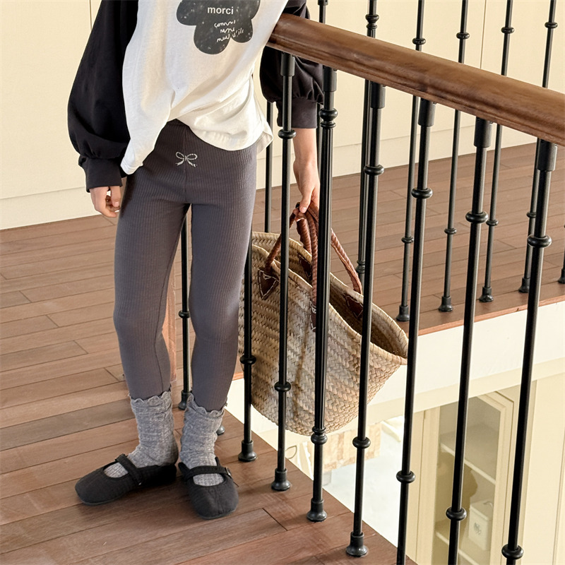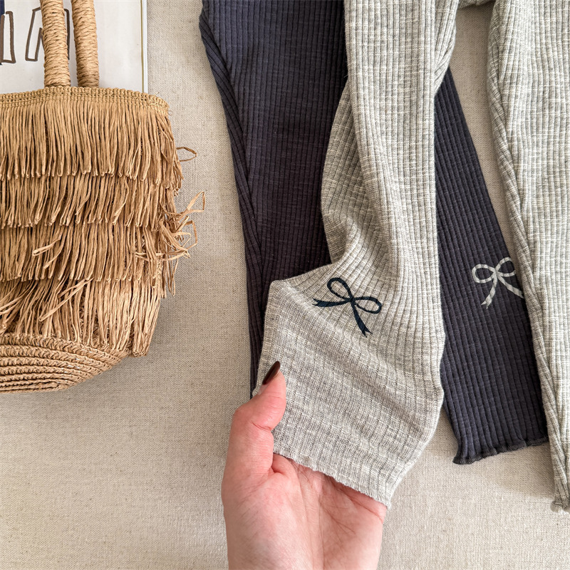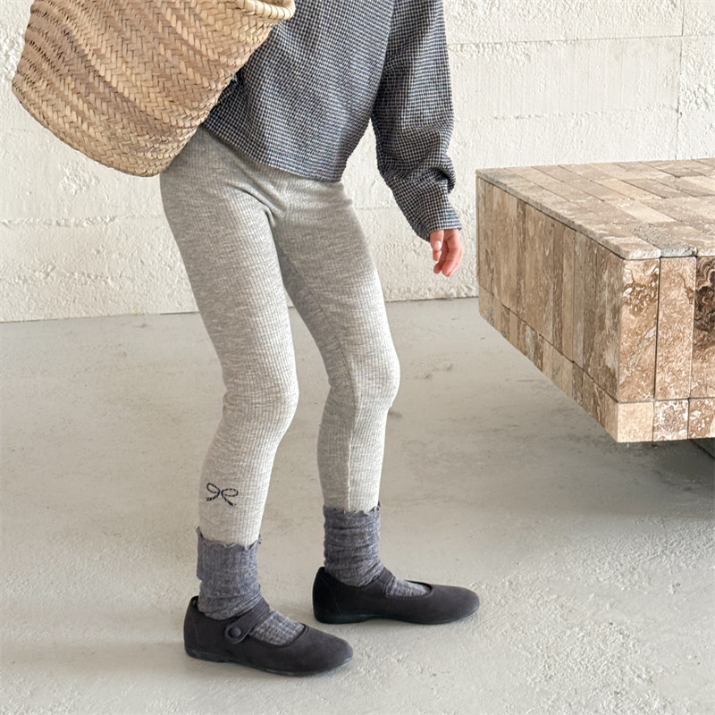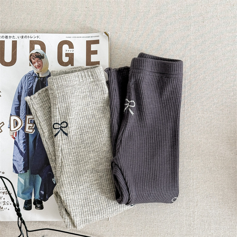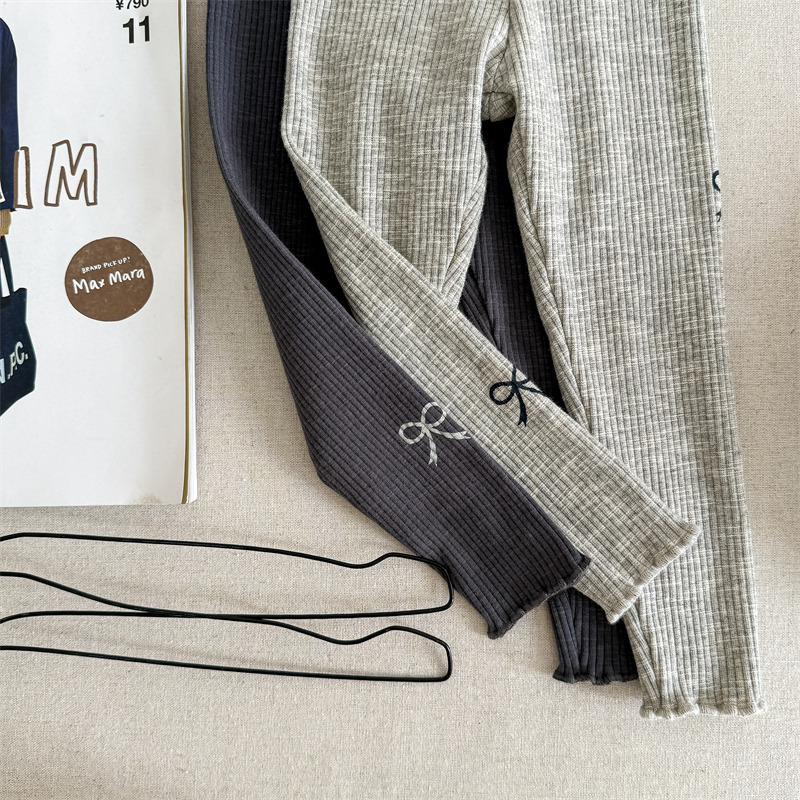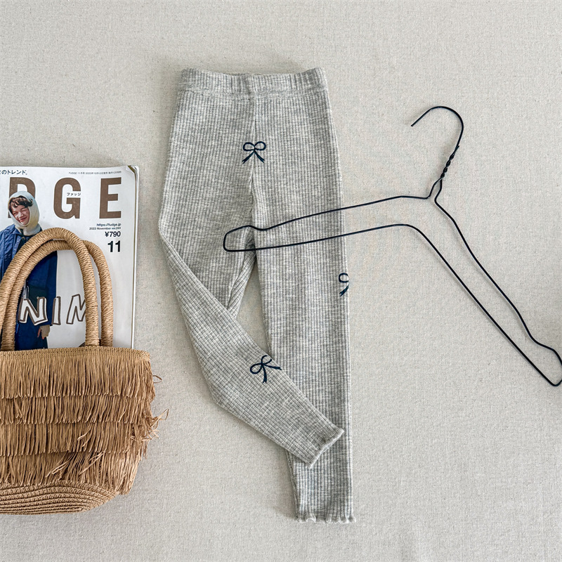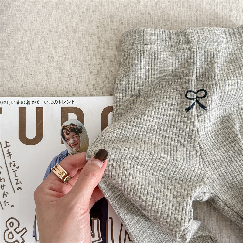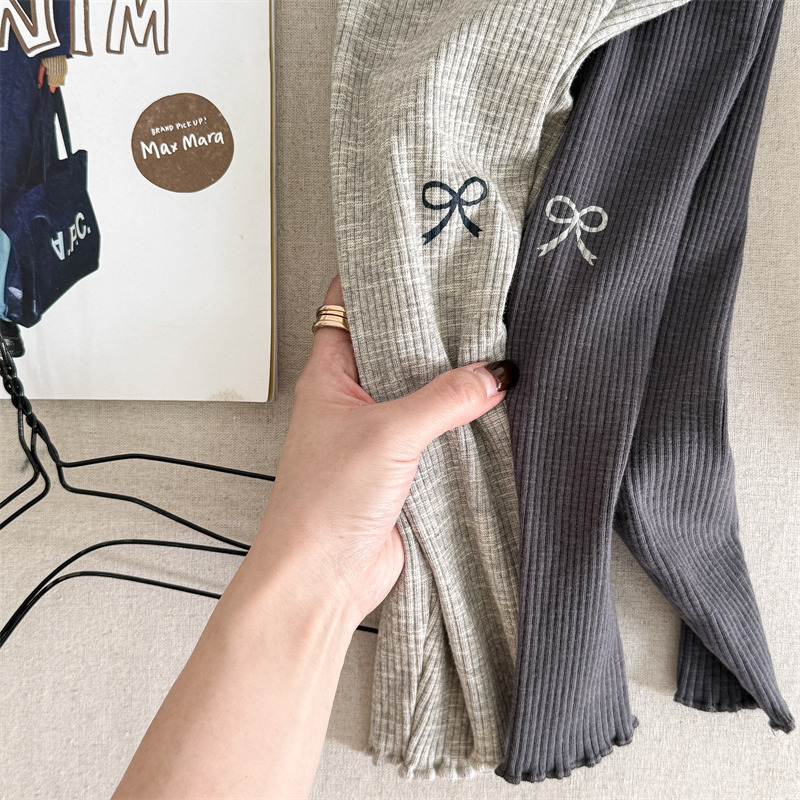 リボンプリントがアクセントになったリブレギンスパンツ。柔らかく伸縮性のあるリブ素材で、動きやすく快適な履き心地です。シンプルながらも可愛らしいデザインで、トップスやワンピースと合わせやすく、カジュアルにもガーリーにも着こなせます。デイリーコーデに取り入れやすいアイテムです。
