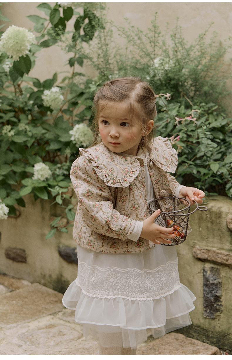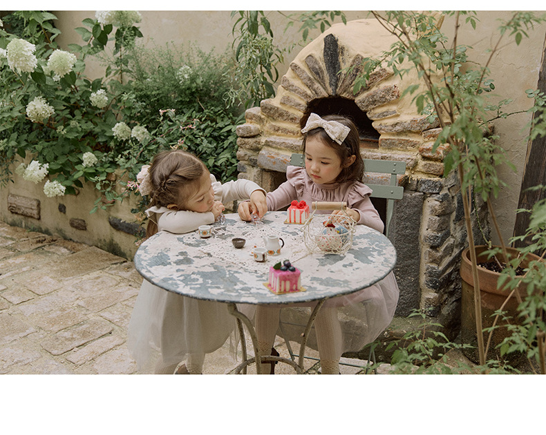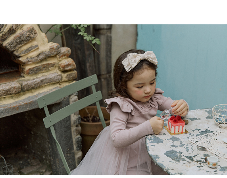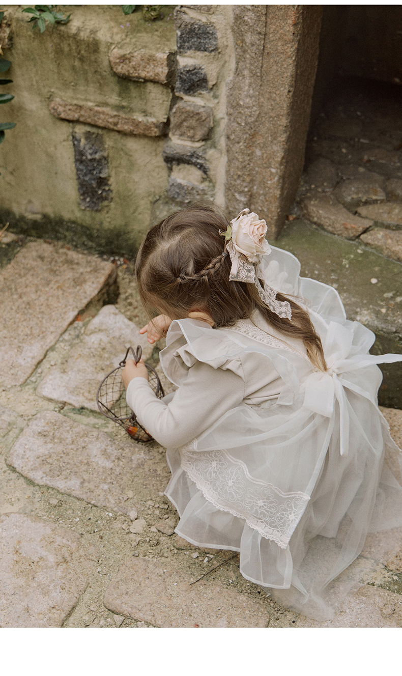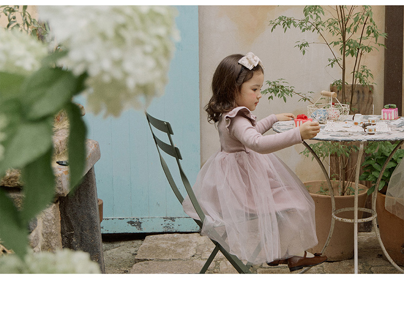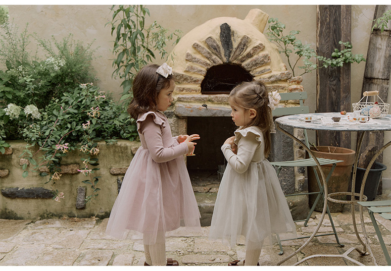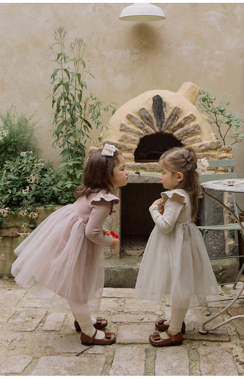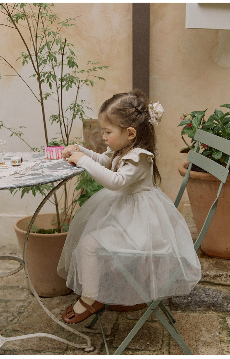 キッズワンピース ショルダーフリルカットソードッキングチュールスカート長袖ドレスワンピース【mh0009052】
