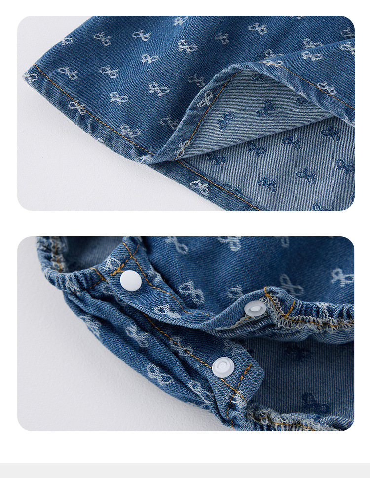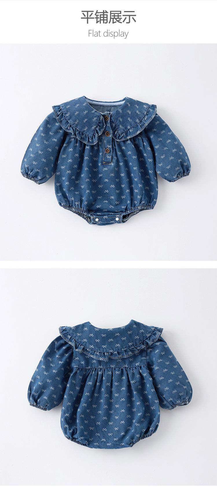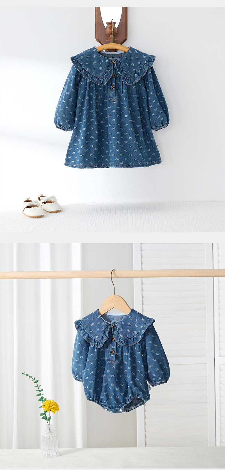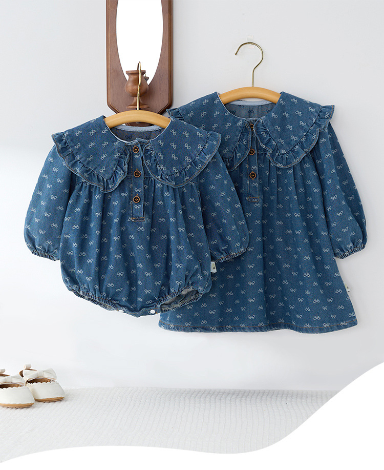 ベビーロンパース/ワンピース リボンプリントフリル襟デニム長袖ボディスーツ/ワンピース【mh0009183】