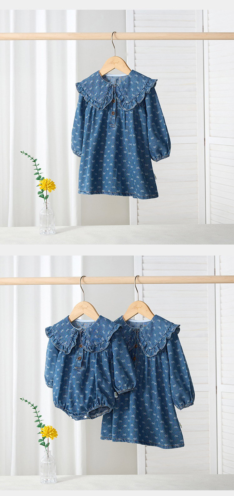 リボンプリントとフリル襟が特徴のデニム長袖ボディスーツまたはワンピースです。柔らかなデニム素材を使用しており、赤ちゃんの肌に優しく、快適な着心地を提供します。フリル襟が可愛らしさを引き立て、リボンプリントがポイントになっています。ボディスーツとしてはおむつ替えも簡単で、ワンピースとして着用することで特別な日のおしゃれにもぴったりです。動きやすいシルエットで、カジュアルなスタイルからフォーマルな装いまで幅広く活躍するアイテムです。