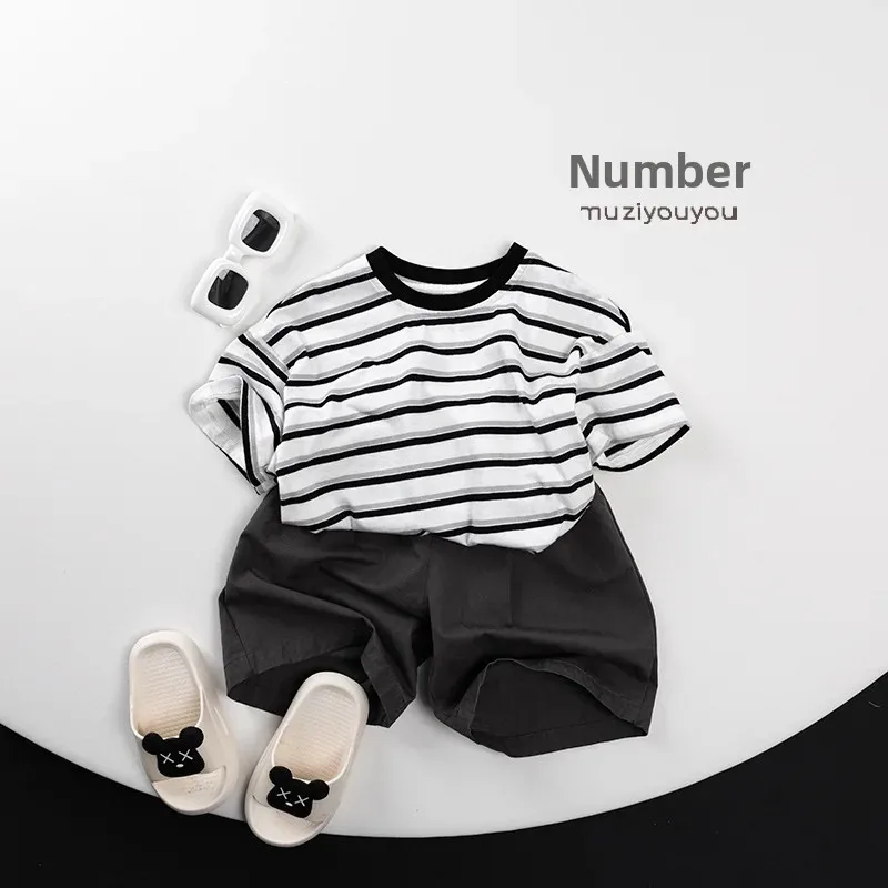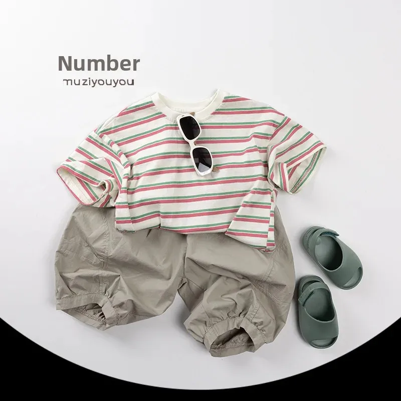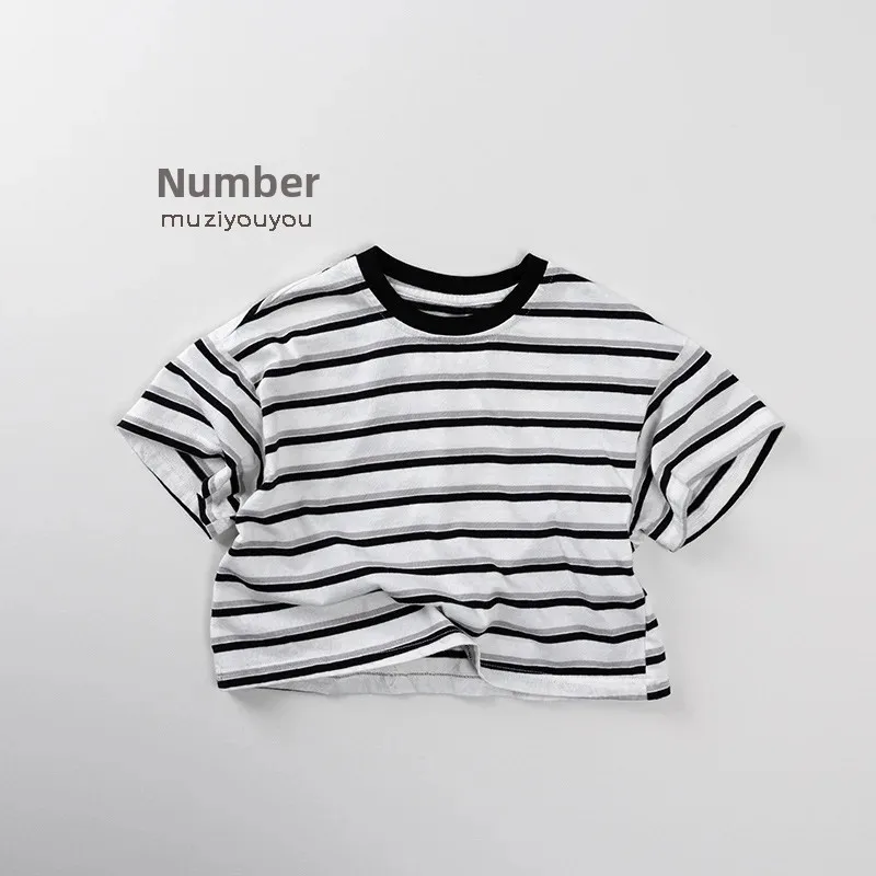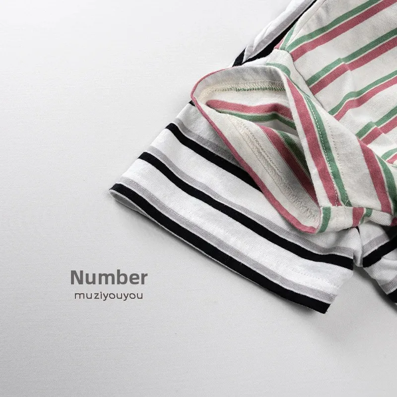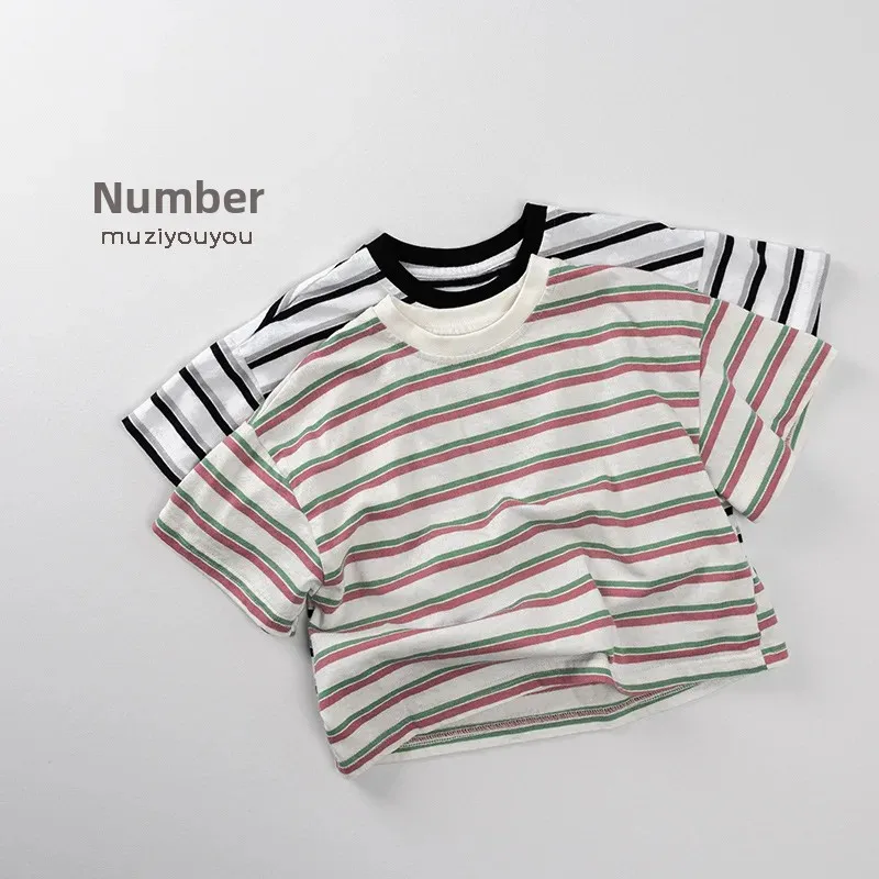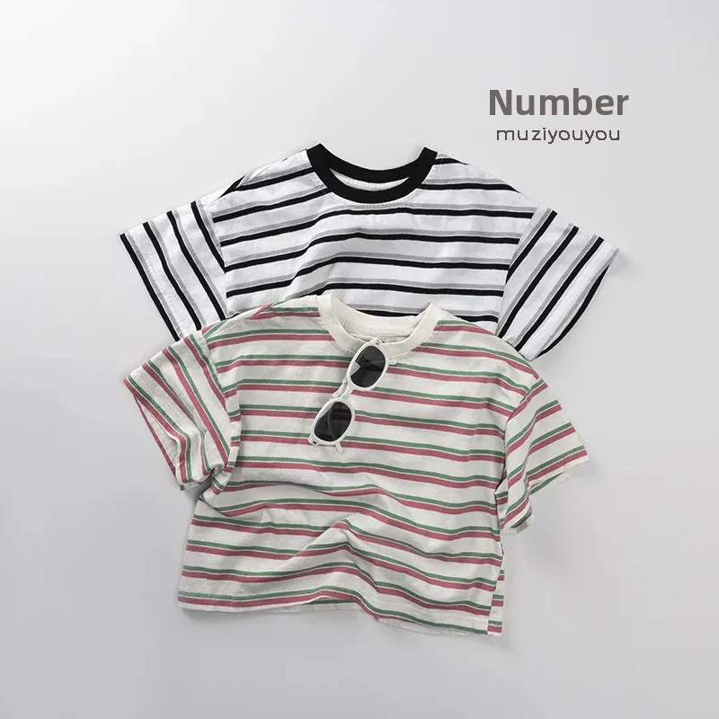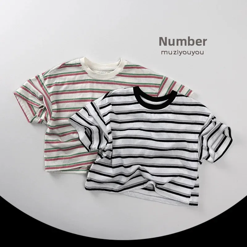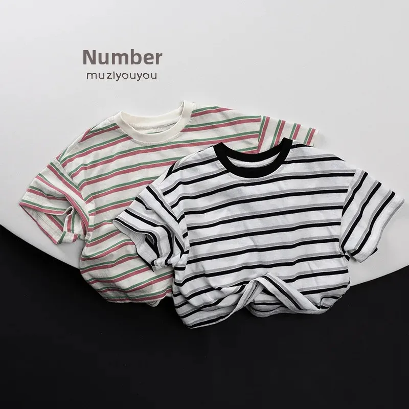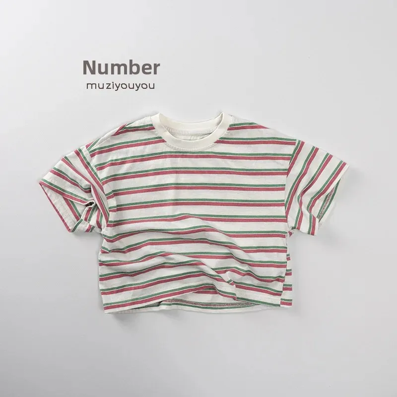 夏の装いにぴったりの、レトロな雰囲気のボーダー柄が目を引くキッズ用半袖Tシャツです。男の子にも女の子にも似合うユニセックスデザインで、様々なコーディネートに活躍します。ゆったりとしたルーズシルエットで、動きやすく快適な着心地。柔らかな素材を使用しており、普段使いはもちろん、ちょっとしたお出かけにもおすすめです。