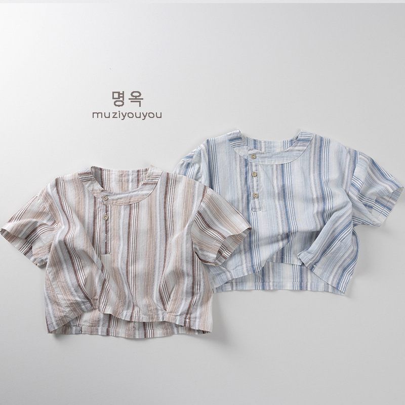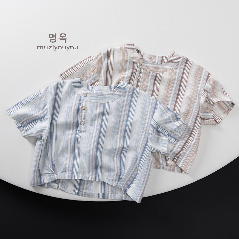 #キッズシャツ #子供服 #ユニセックス #ストライプ #ノーカラーシャツ #半袖シャツ #夏物子供服 #コットン #トレンドキッズ服