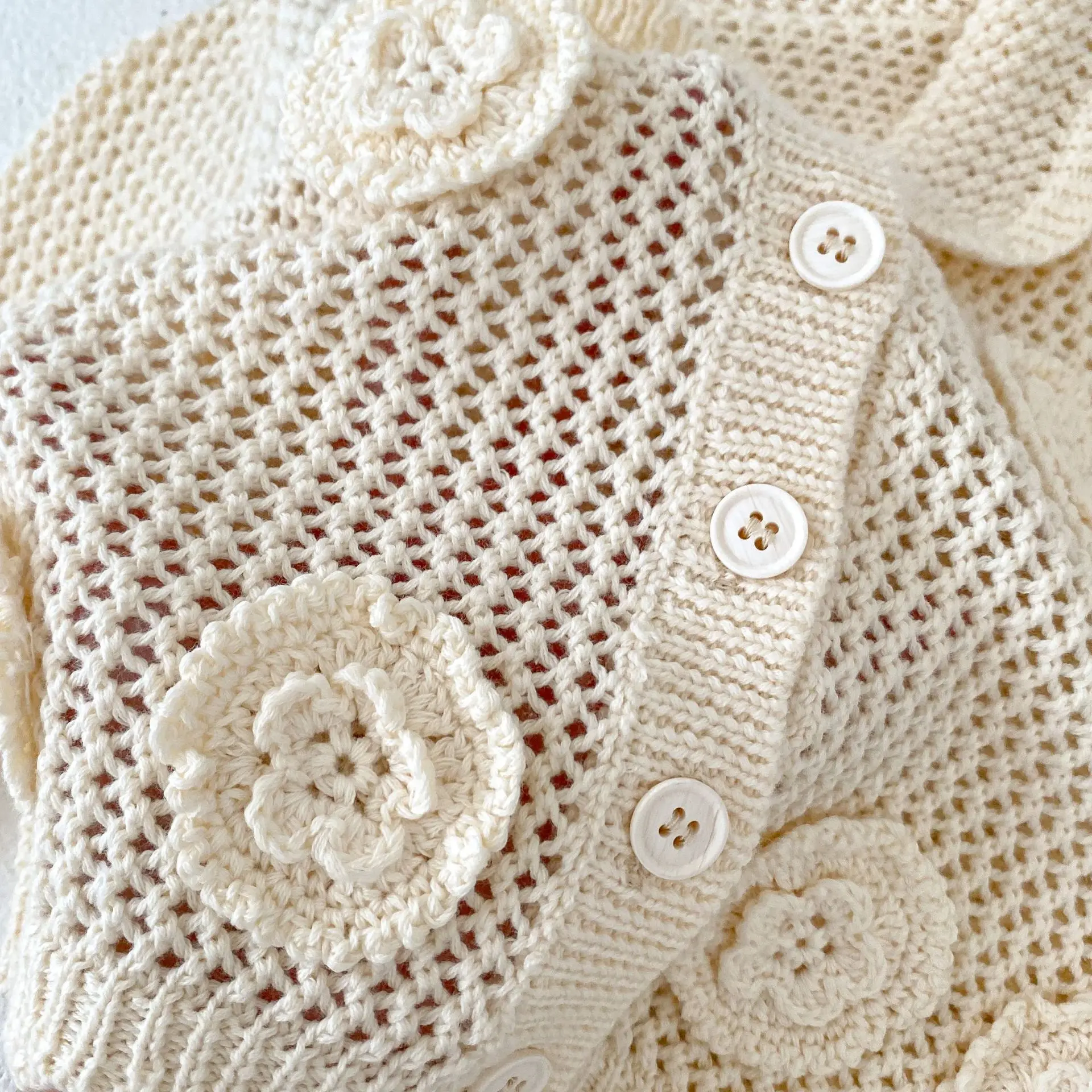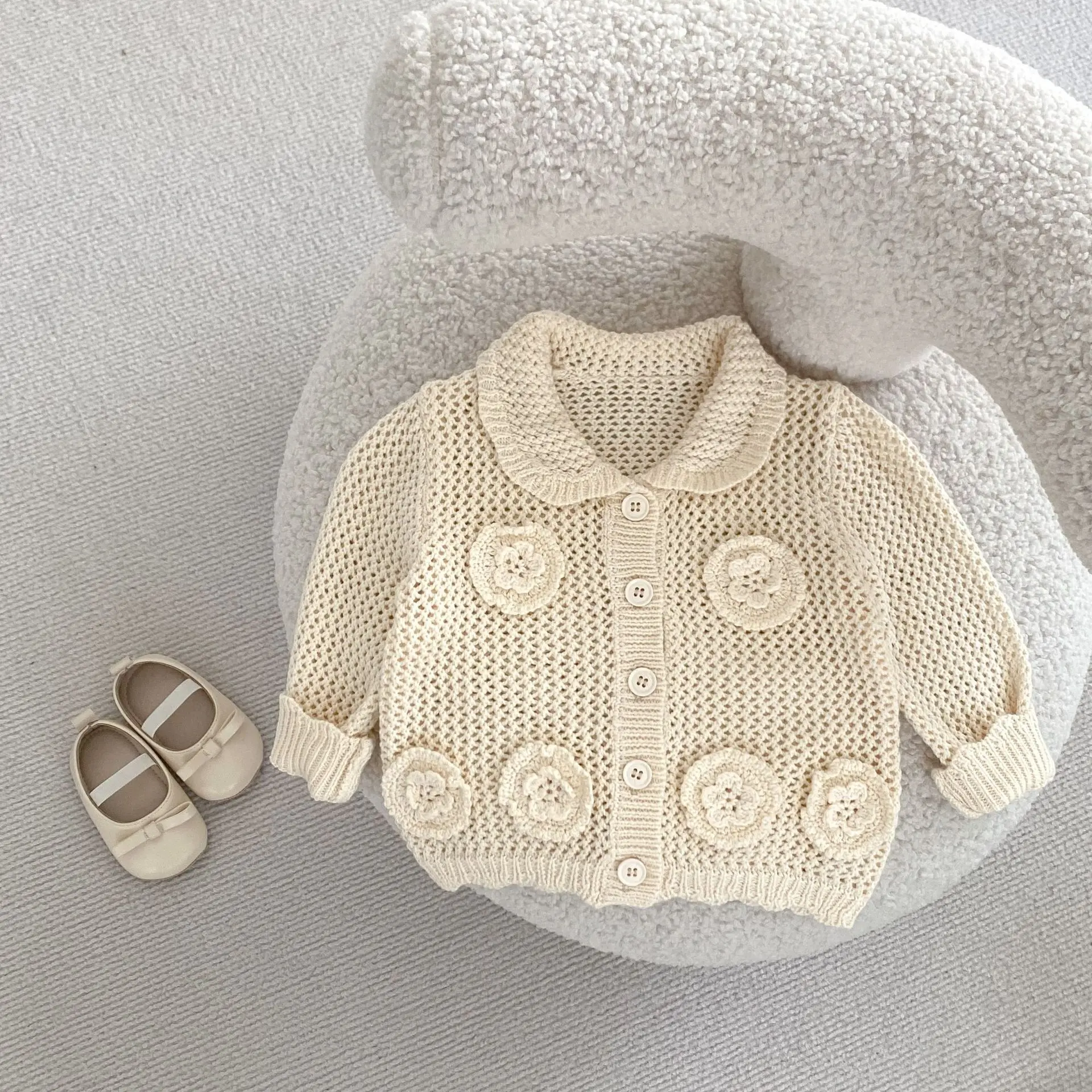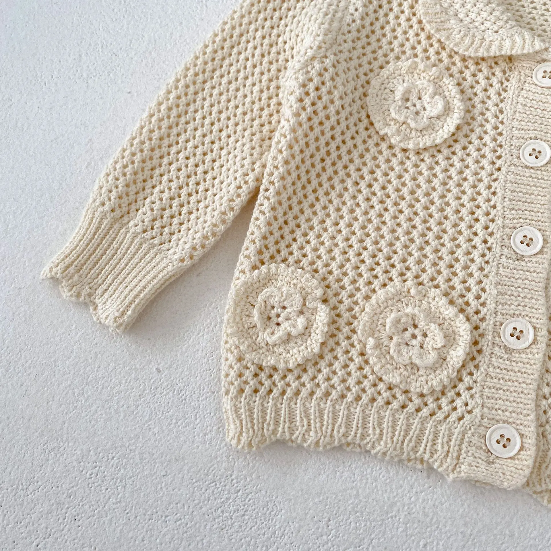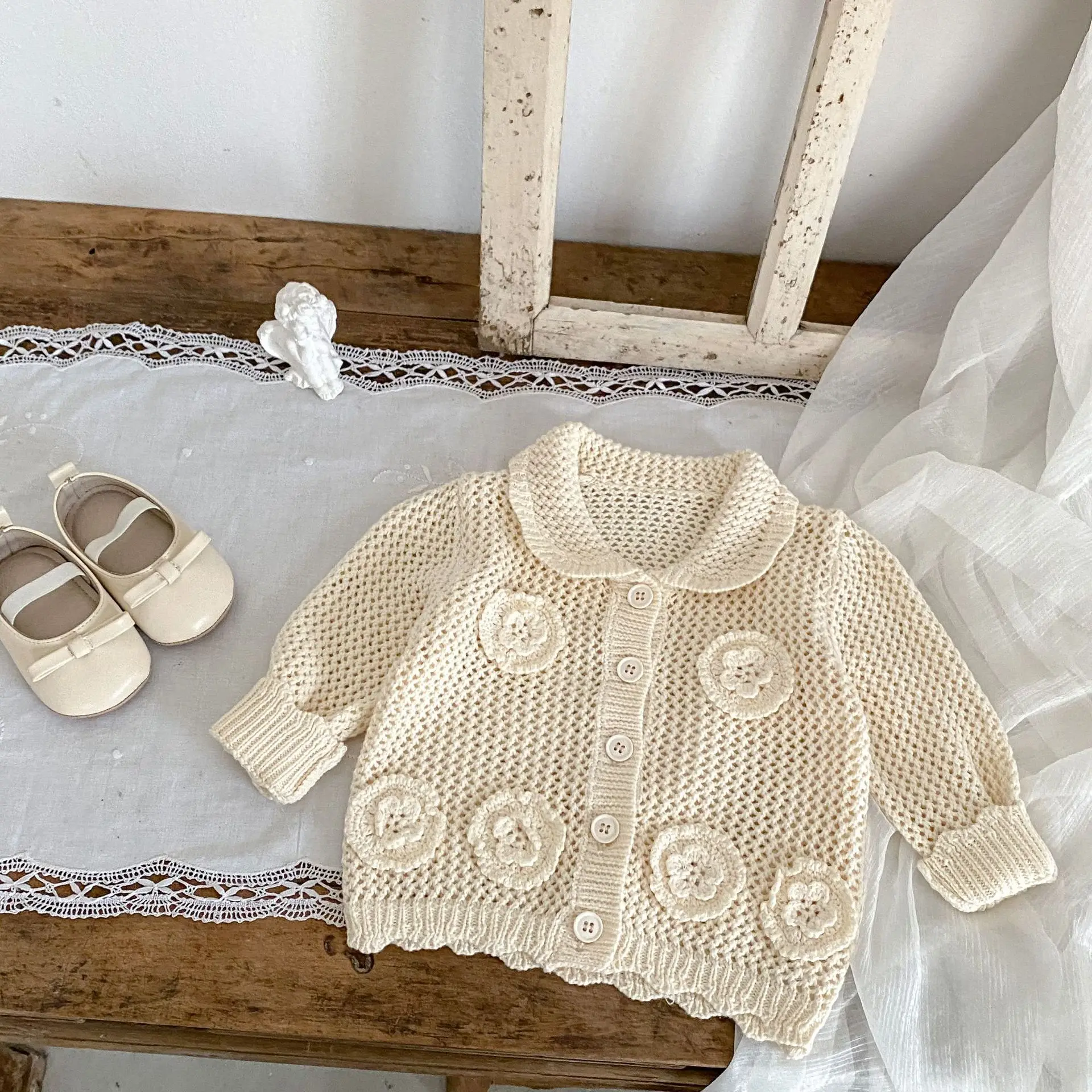 高級ベビーカーディガン。品のあるレースニットとフラワー刺繍が秋のファッションを演出します。アプリコットホワイトの色合いが子供の可愛らしさを引き立てます。襟付きのジャケットはオールマッチで、ガールズからインファントまで着用可能。子供らしいかわいさと上品さを兼ね備えた一着です。