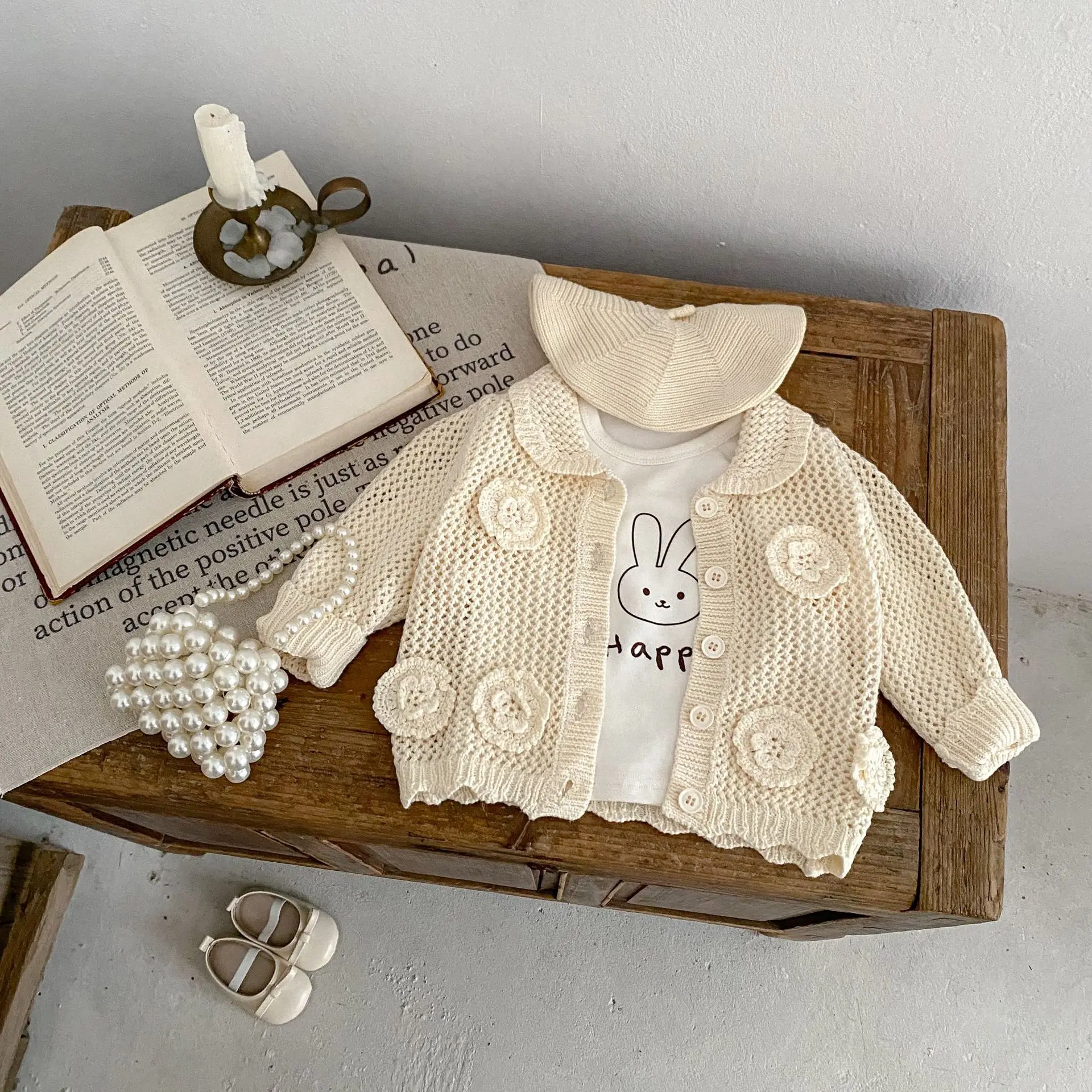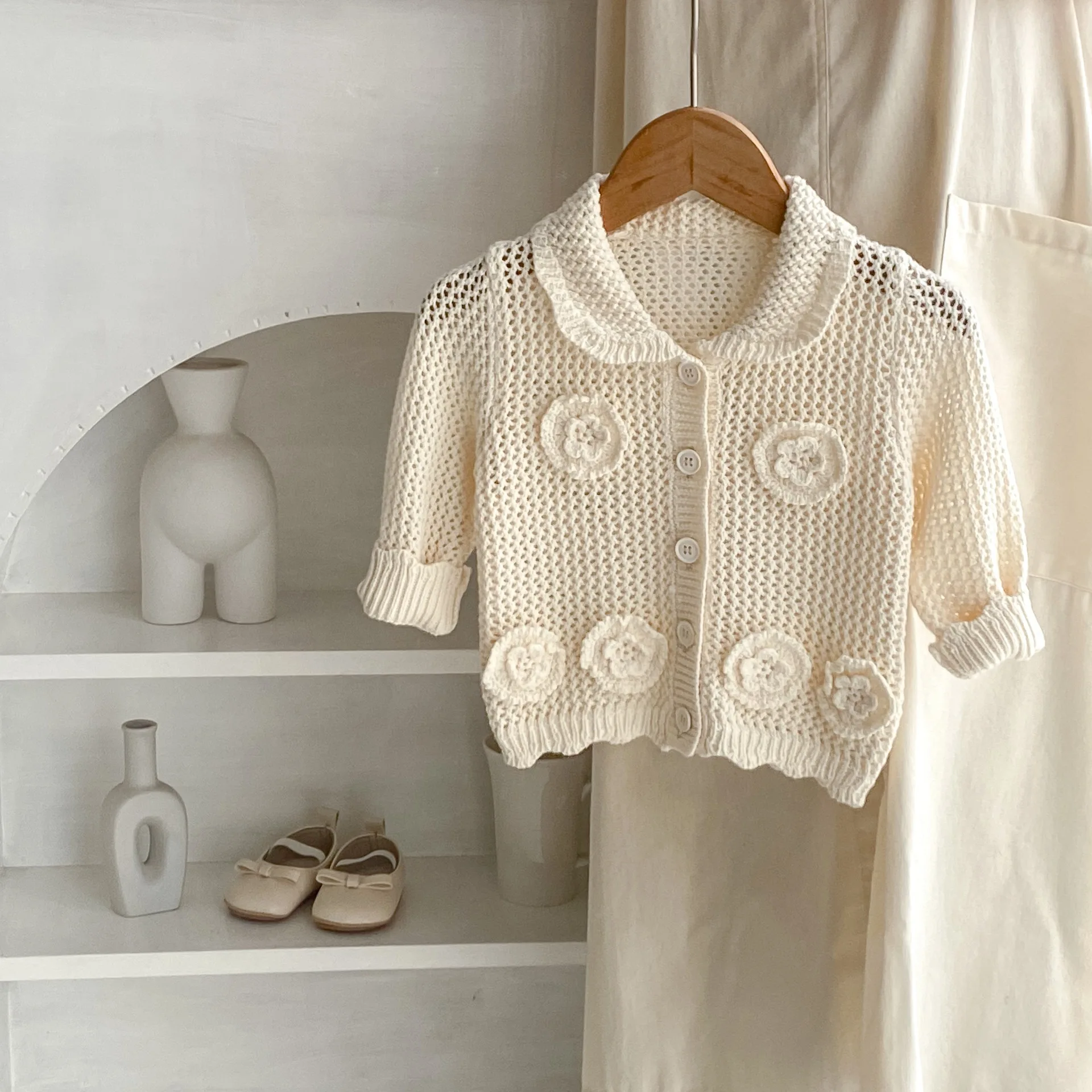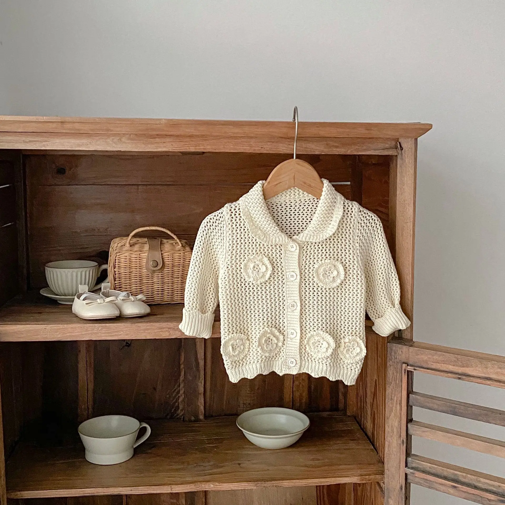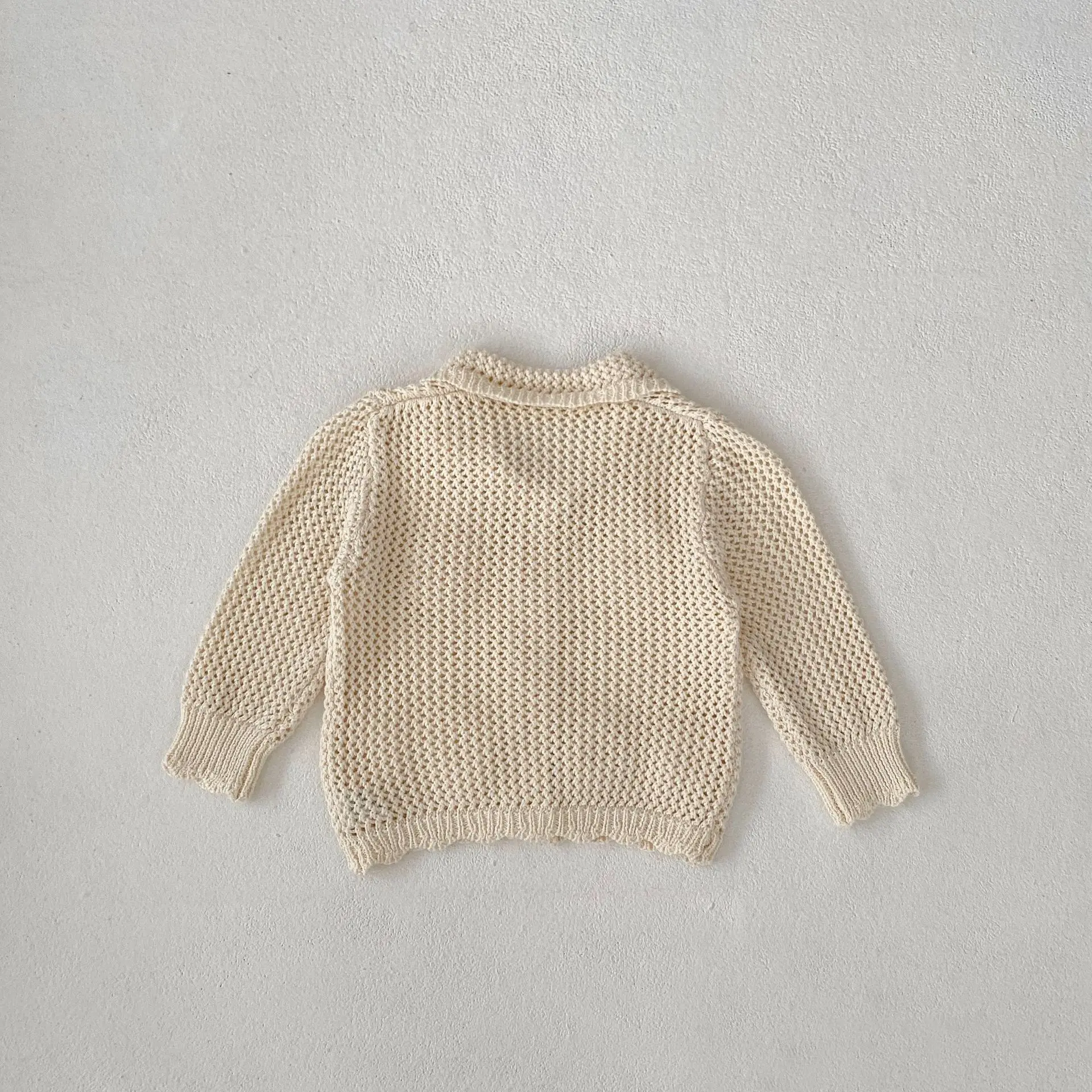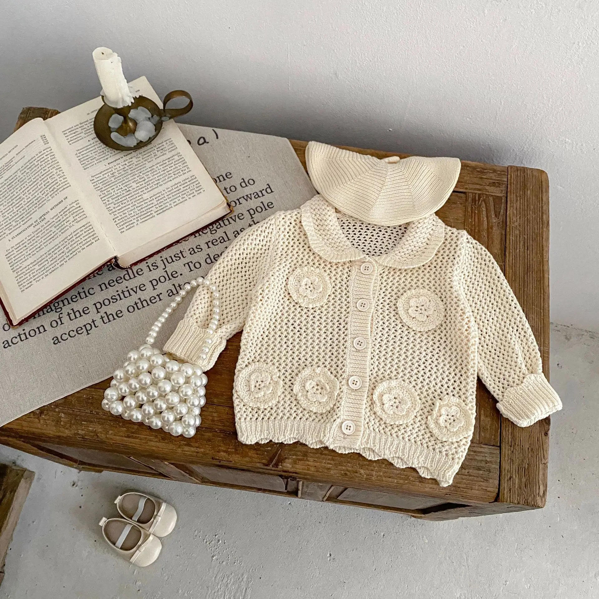 高級ベビーカーディガン。品のあるレースニットとフラワー刺繍が秋のファッションを演出します。アプリコットホワイトの色合いが子供の可愛らしさを引き立てます。襟付きのジャケットはオールマッチで、ガールズからインファントまで着用可能。子供らしいかわいさと上品さを兼ね備えた一着です。