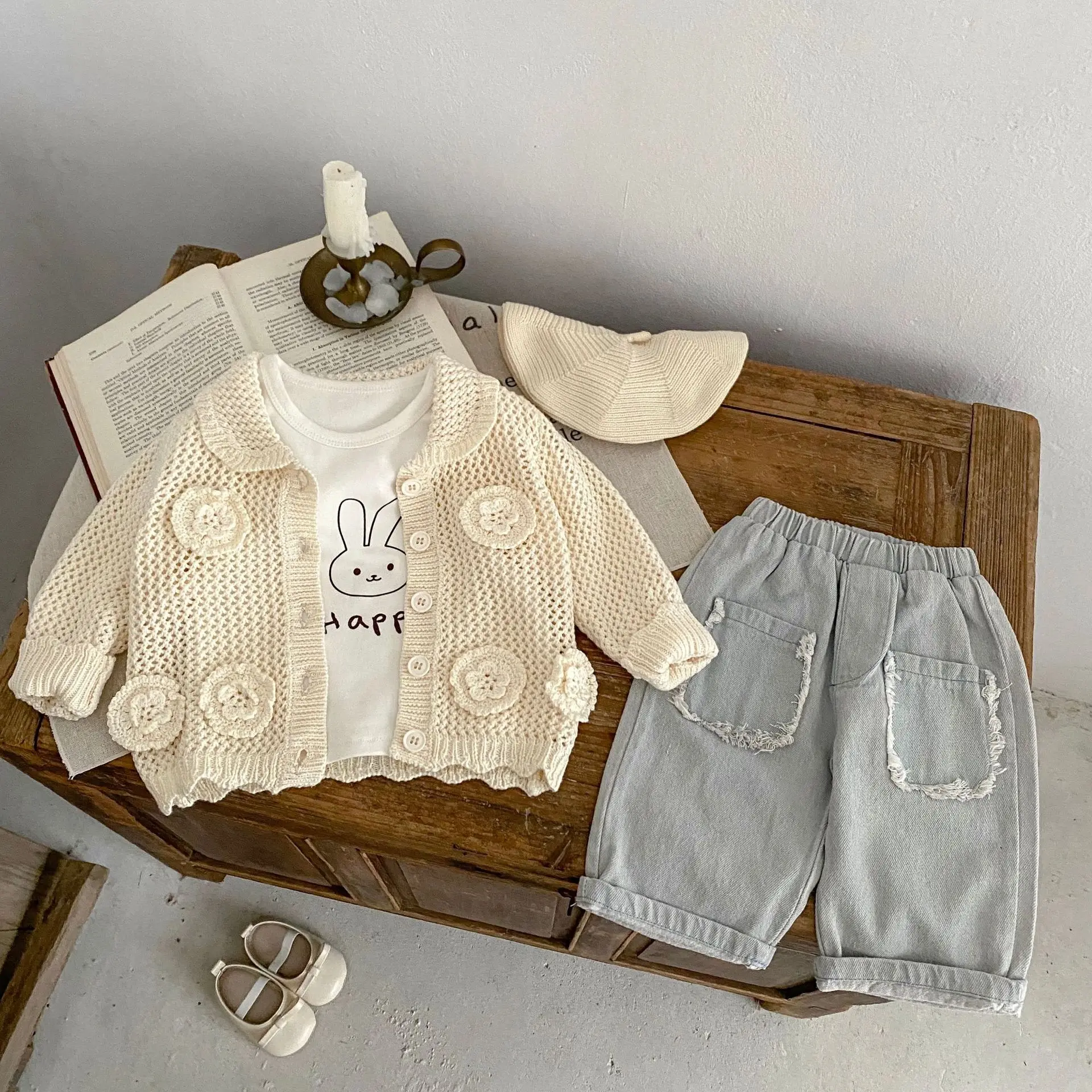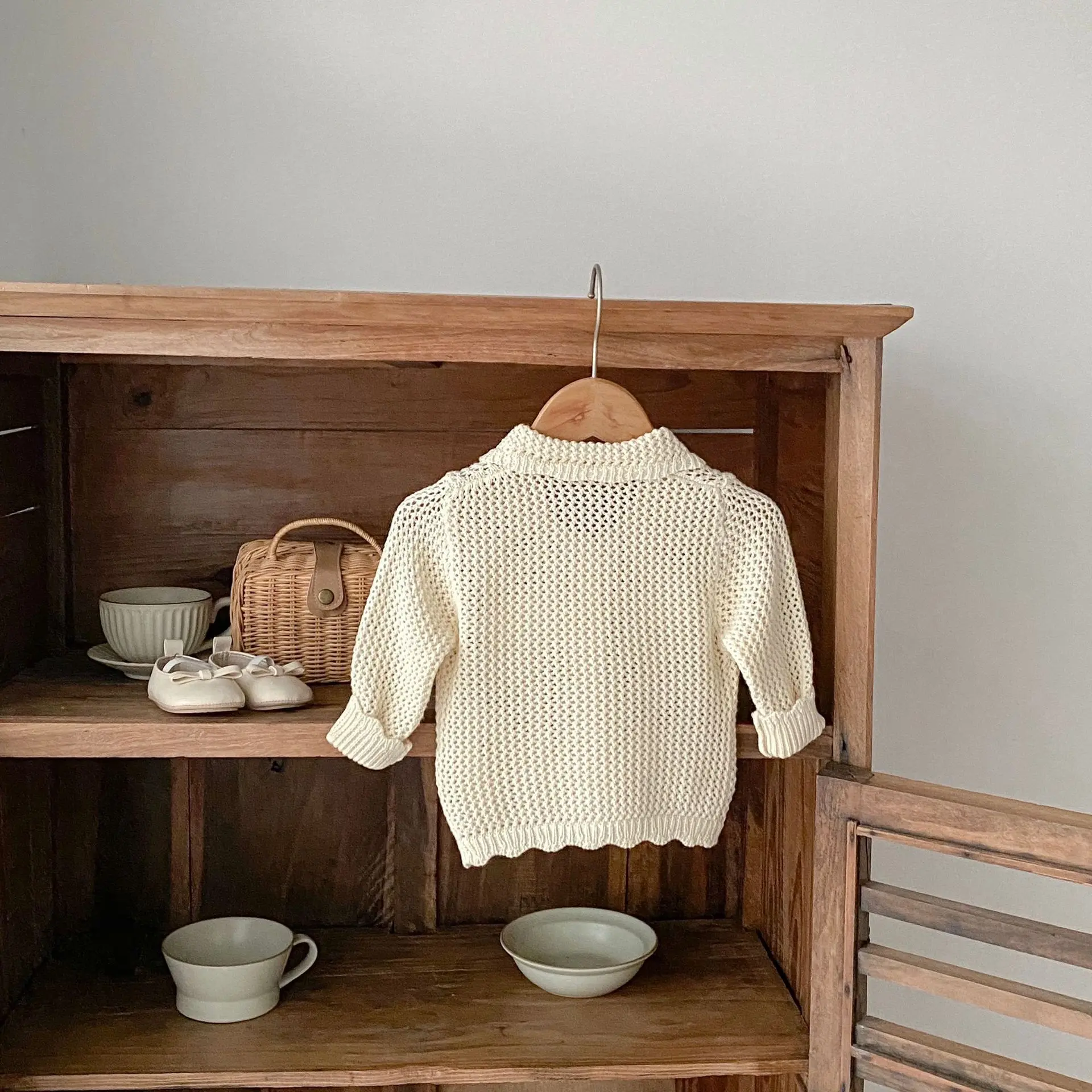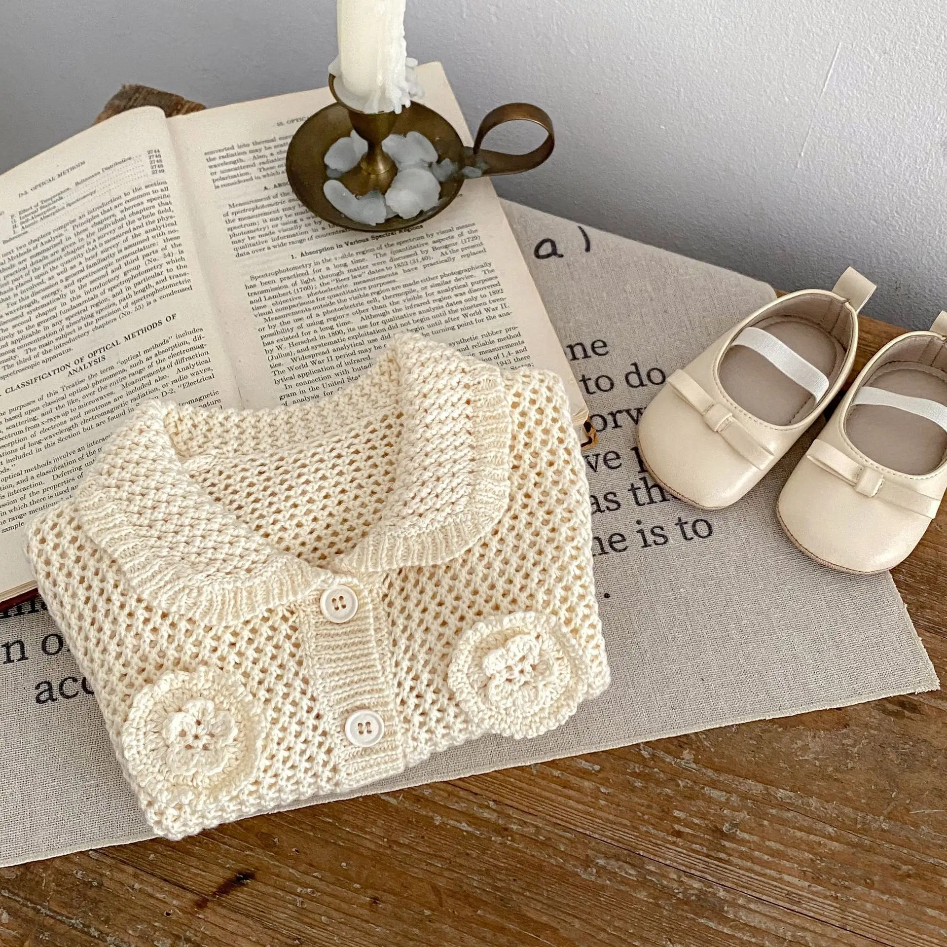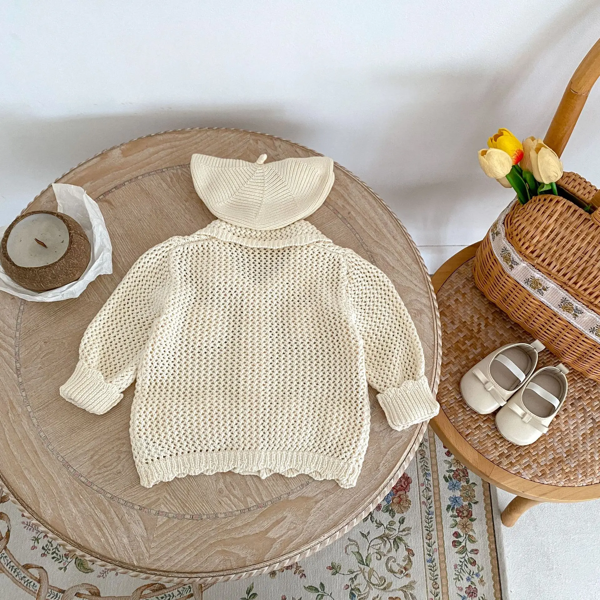 高級ベビーカーディガン。品のあるレースニットとフラワー刺繍が秋のファッションを演出します。アプリコットホワイトの色合いが子供の可愛らしさを引き立てます。襟付きのジャケットはオールマッチで、ガールズからインファントまで着用可能。子供らしいかわいさと上品さを兼ね備えた一着です。