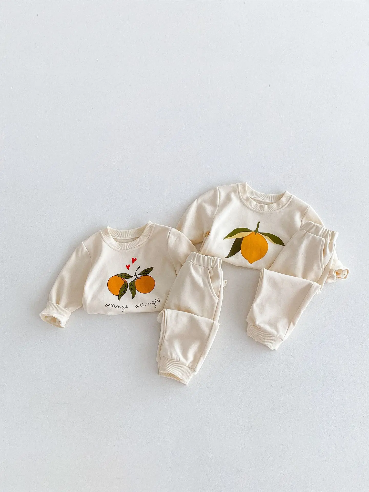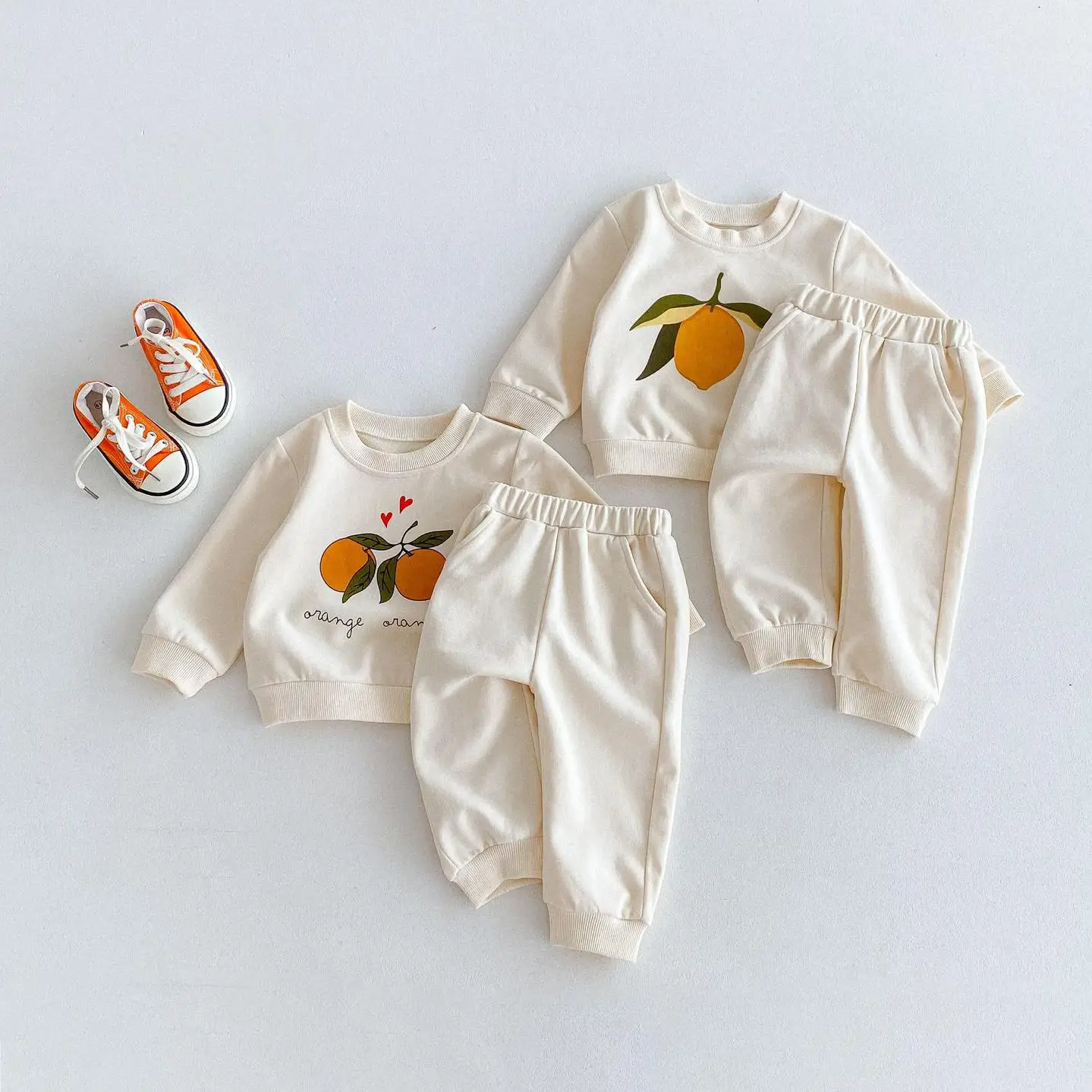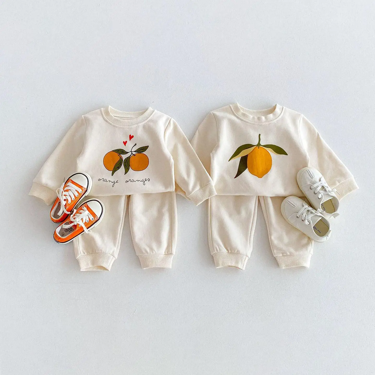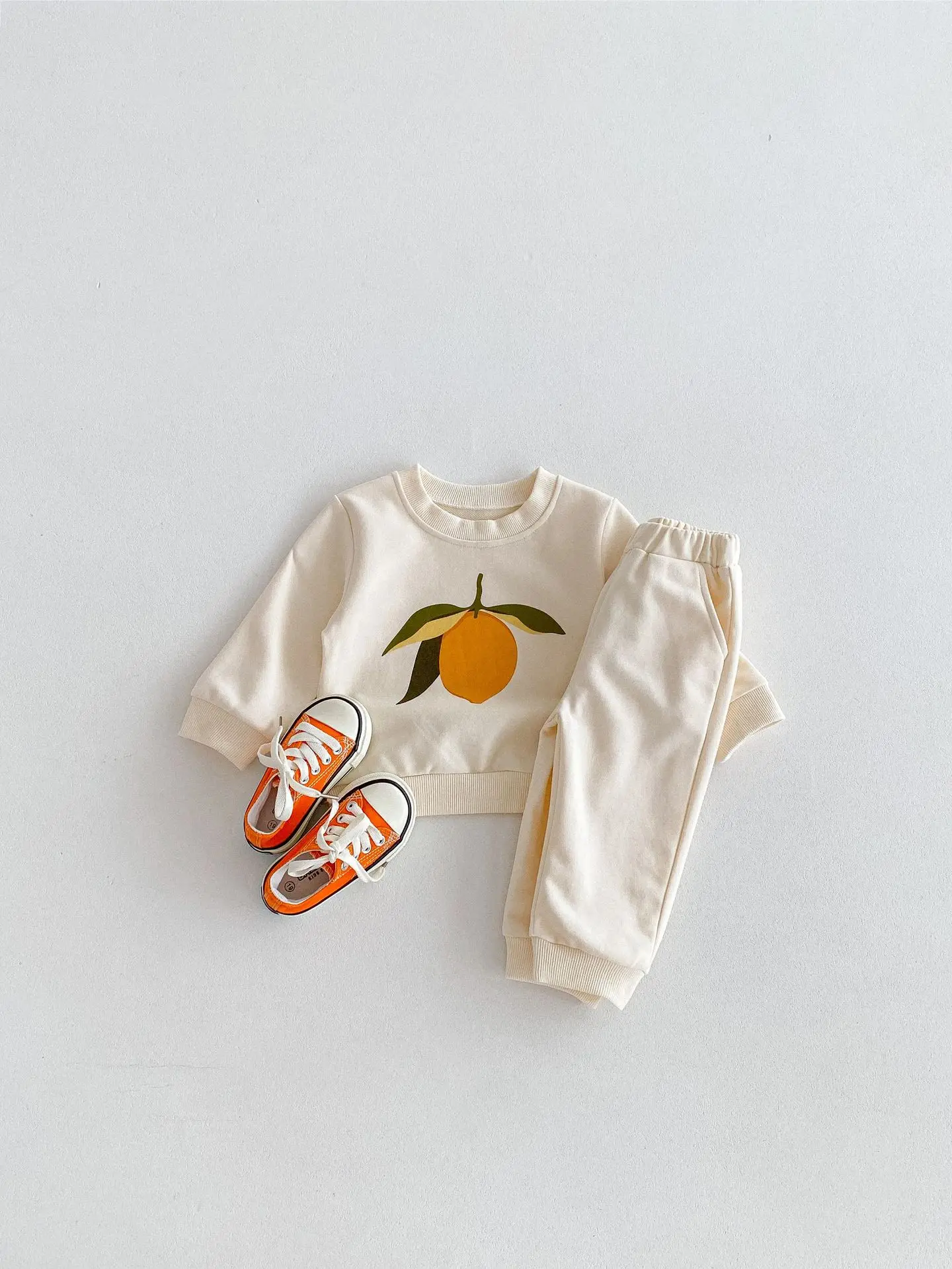 この2点セットは、赤ちゃんや子供に最適です。レモンとオレンジのフルーツプリントが可愛くてユニークです。長袖のトップスとパンツのセットで、カジュアルなスウェットシャツをおしゃれに演出します。 自然の風合いを感じるナチュラルテイストで、お子様に優しい着心地を提供します。