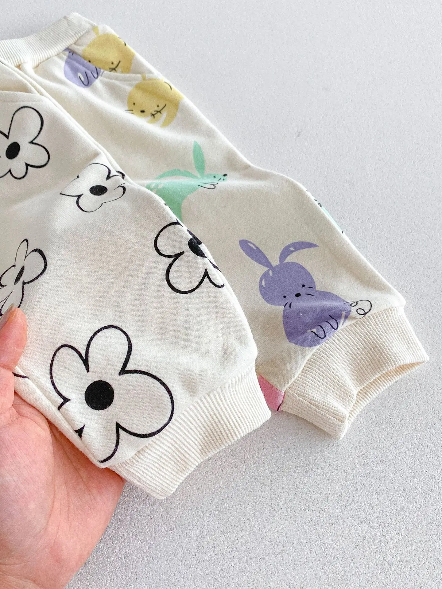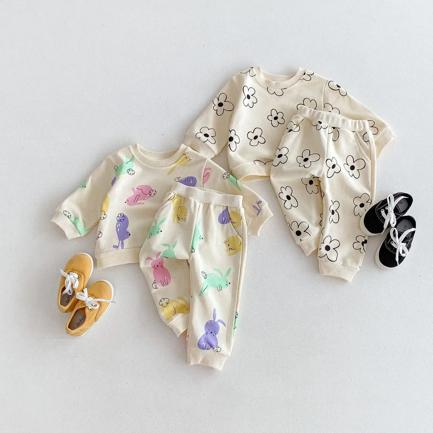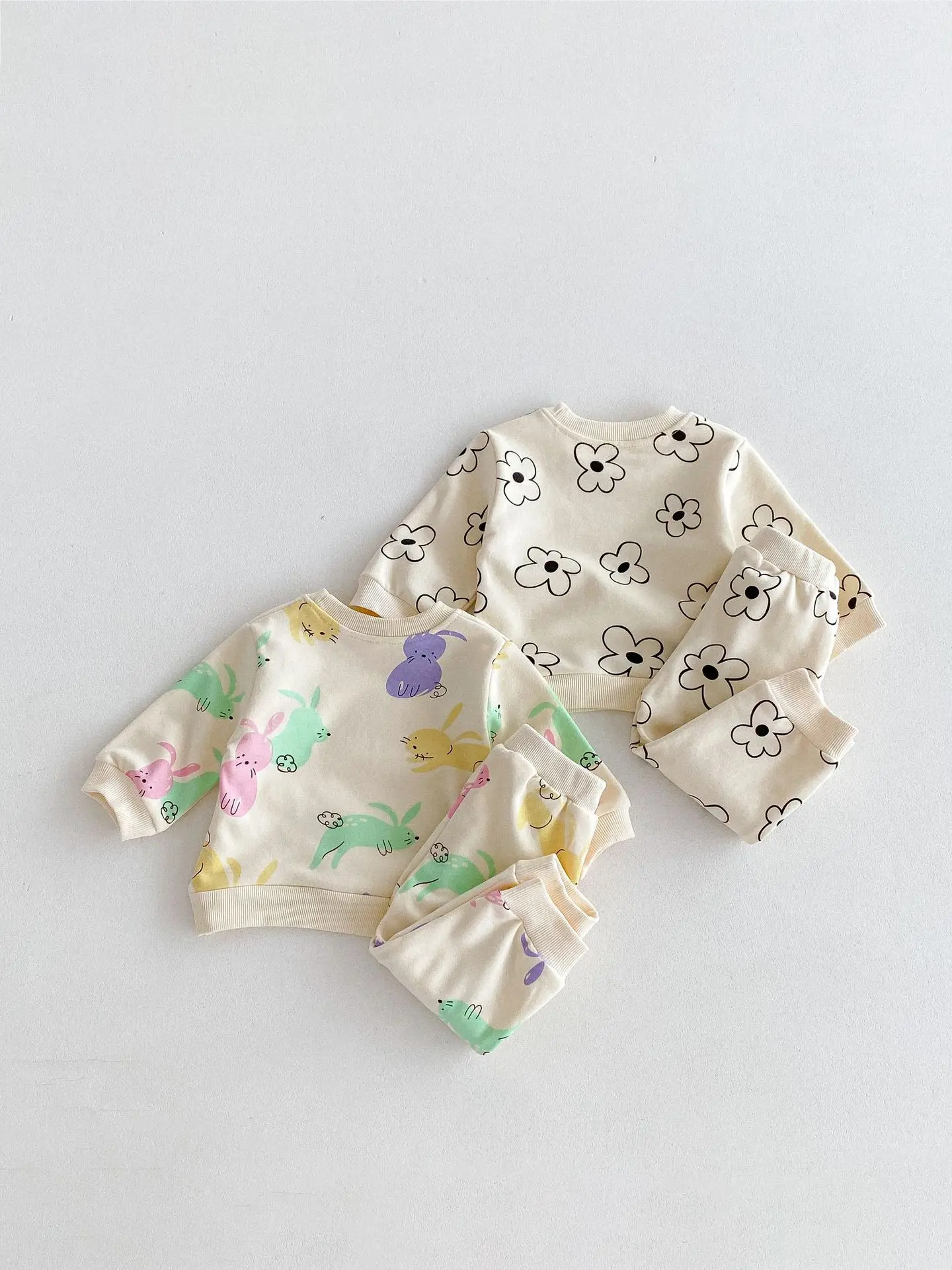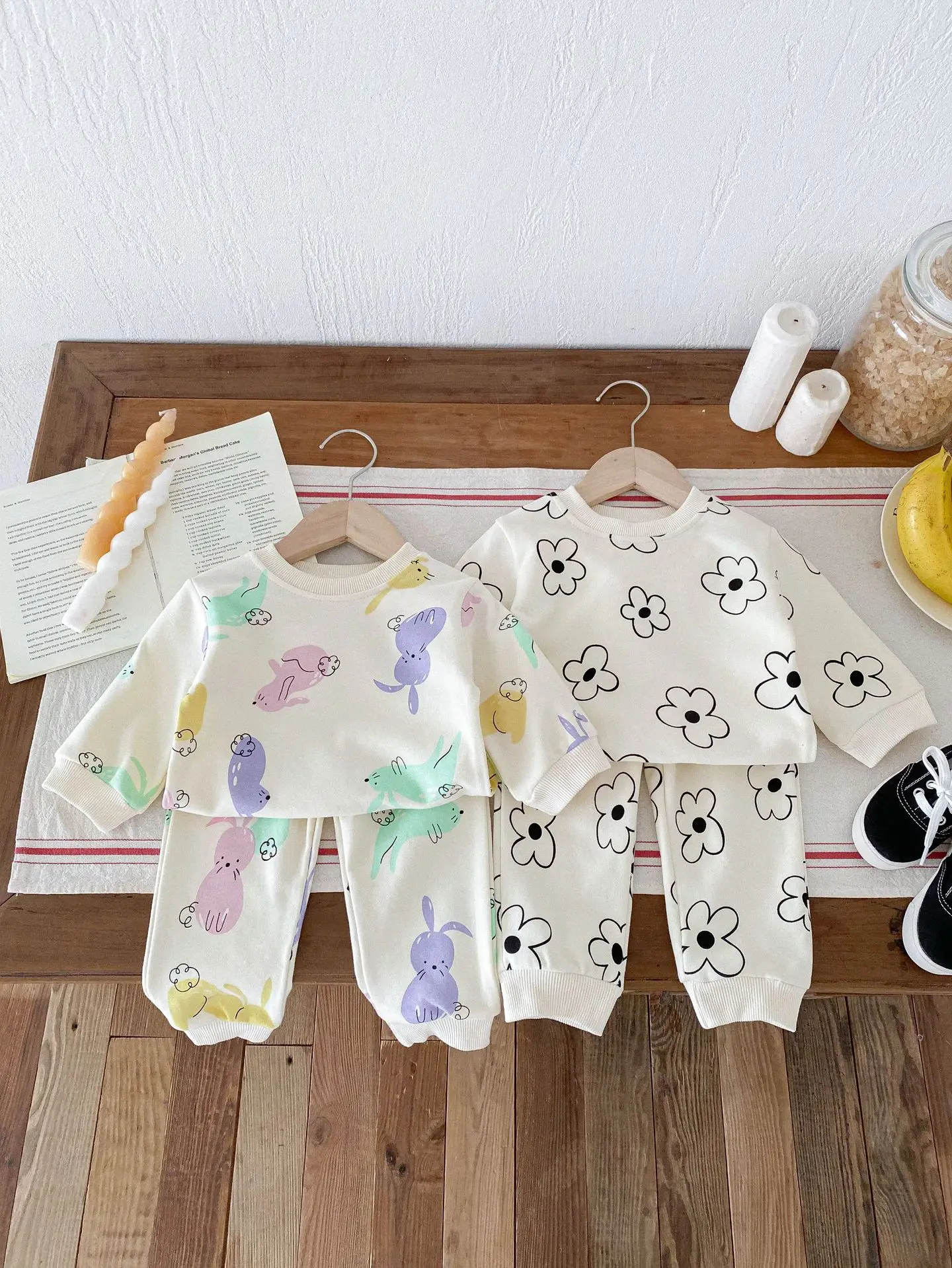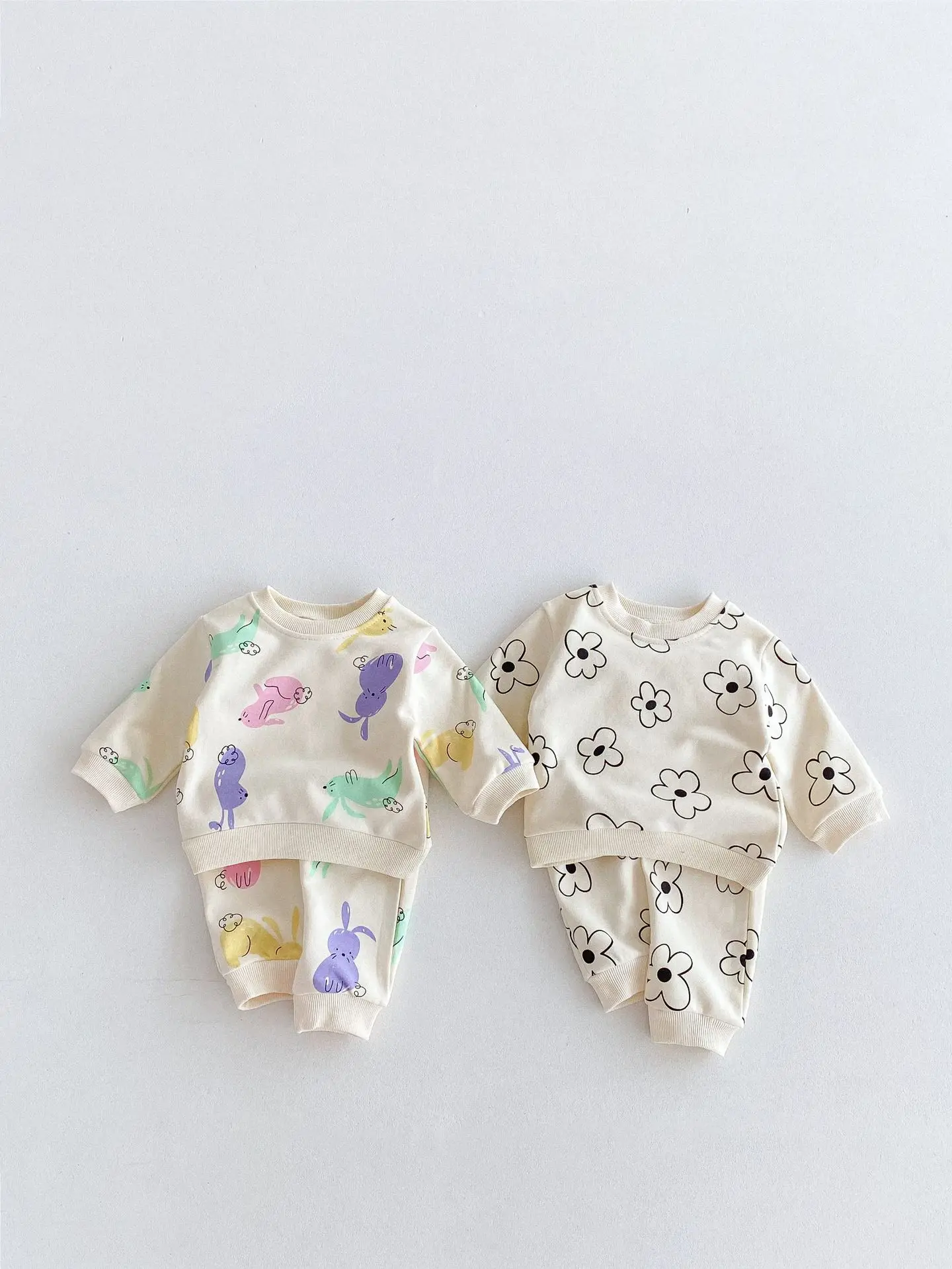 ベビーキッズセットアップ 2点セット スウェットシャツ+スウェットパンツ レトロフラワー/カラフルラビットプリント【mh0006445】
