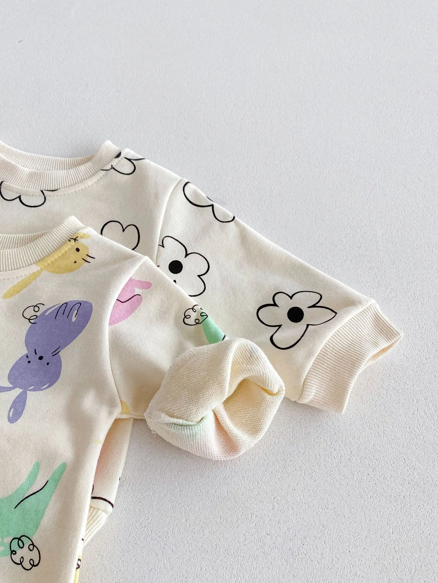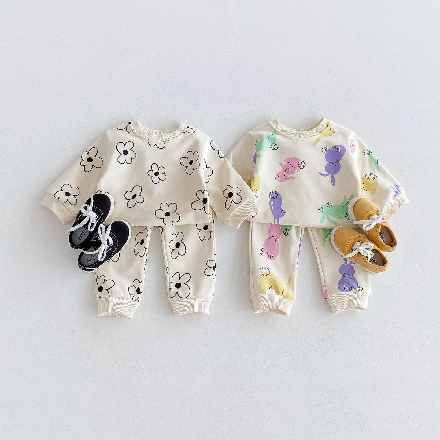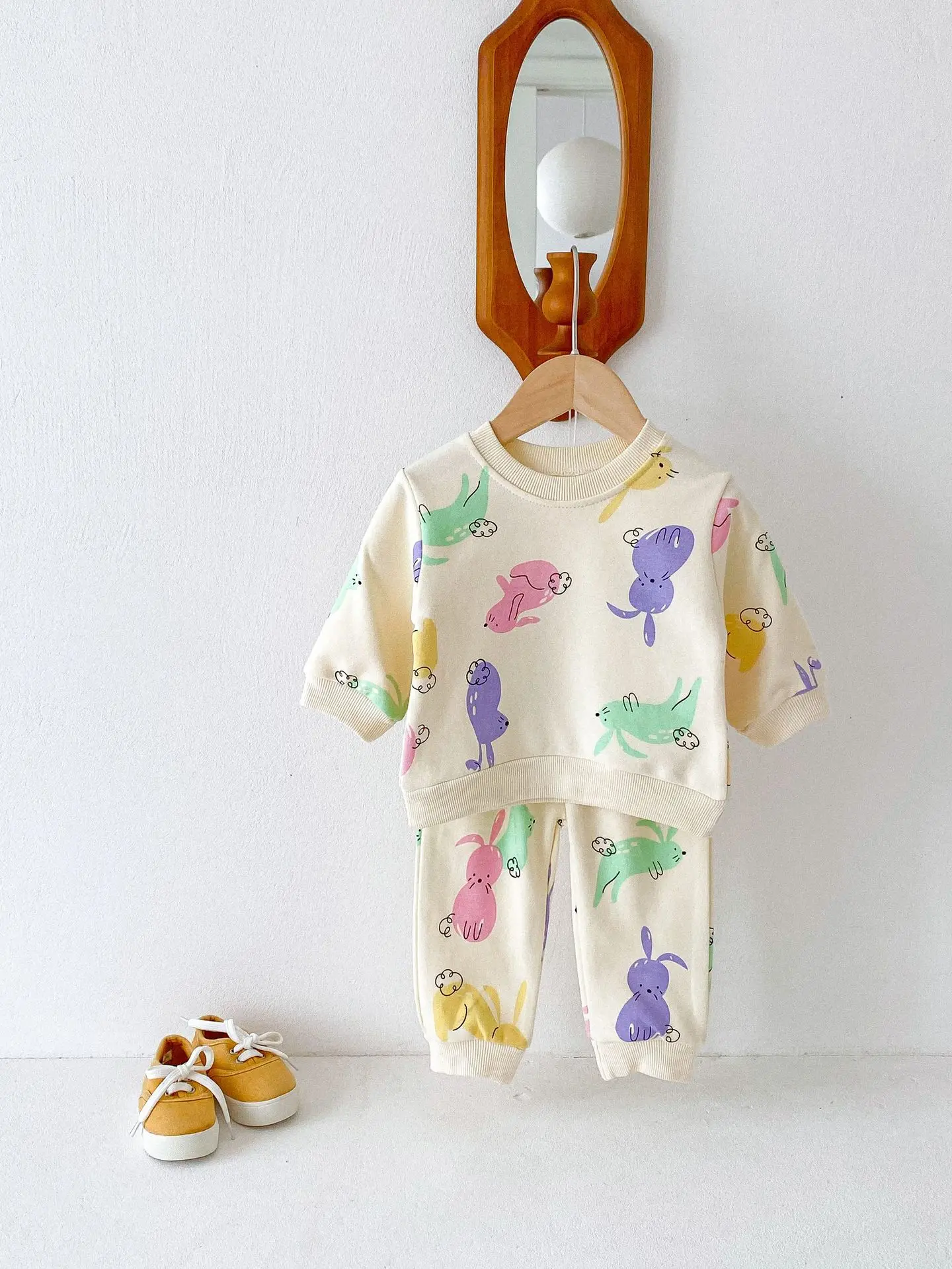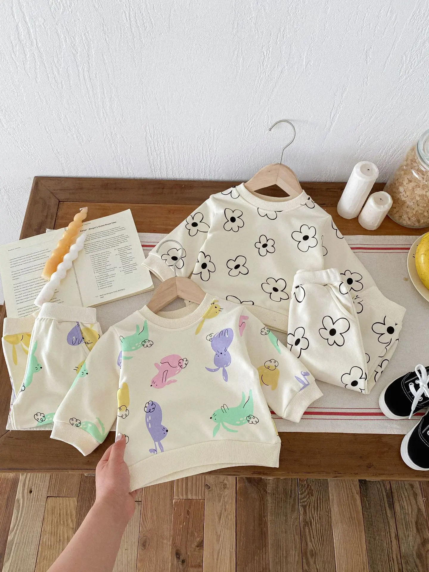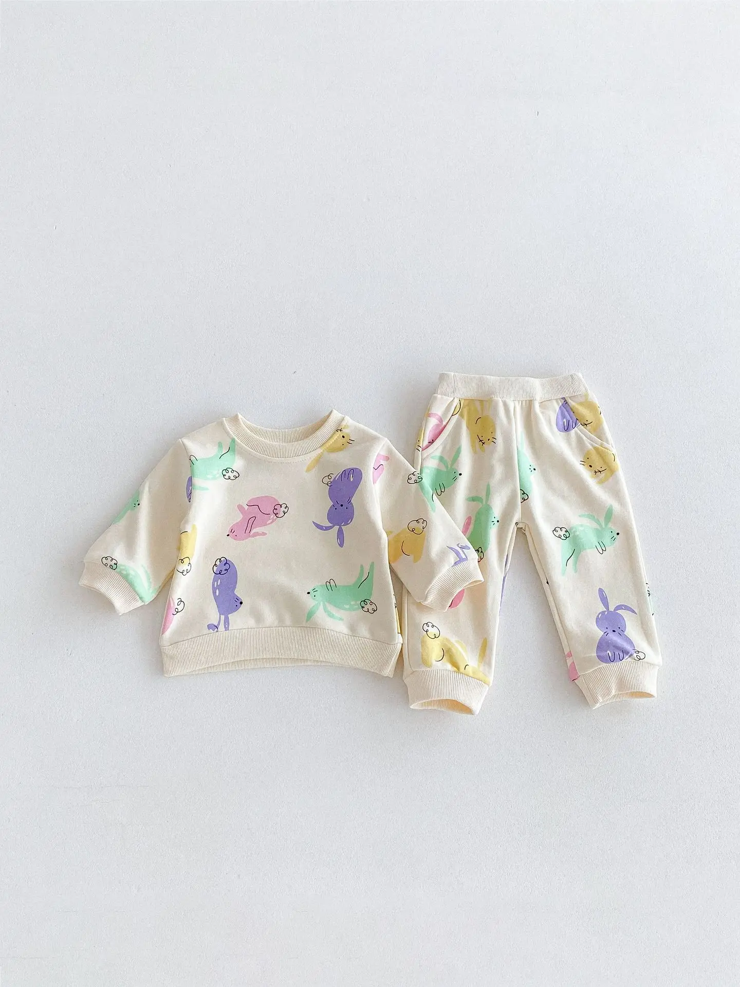 ベビーキッズセットアップ 2点セット スウェットシャツ+スウェットパンツ レトロフラワー/カラフルラビットプリント【mh0006445】