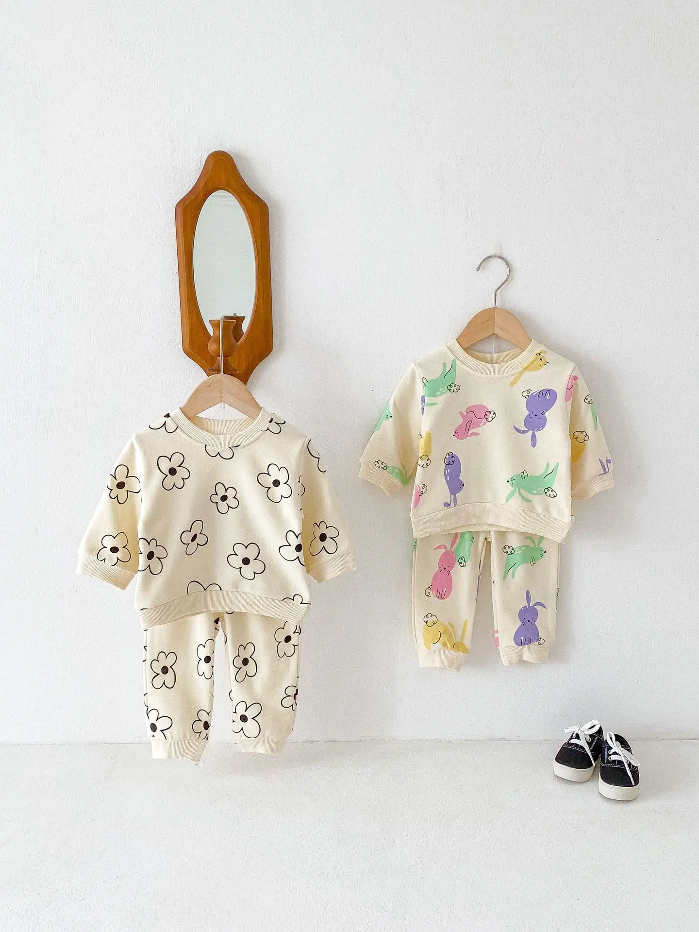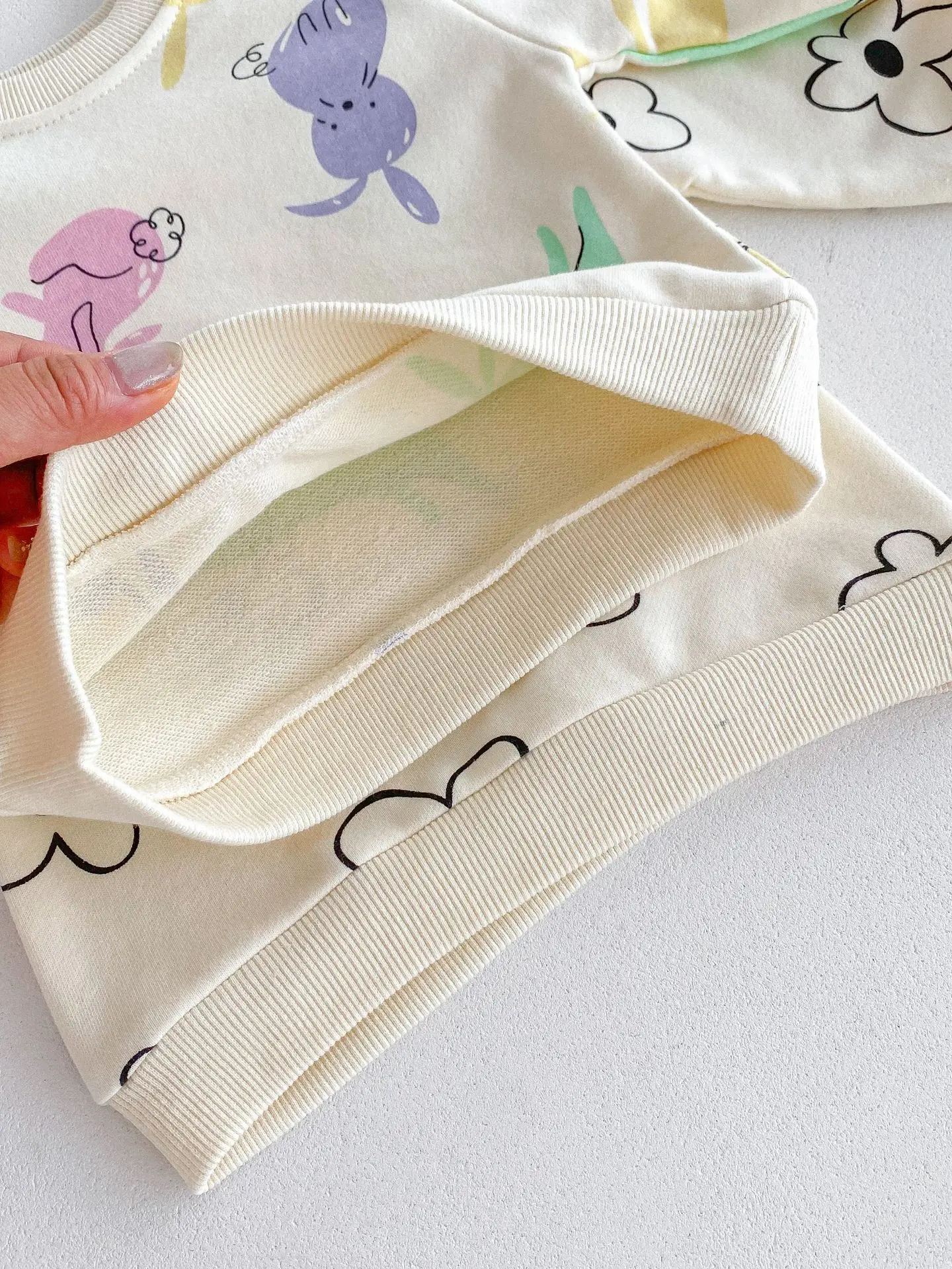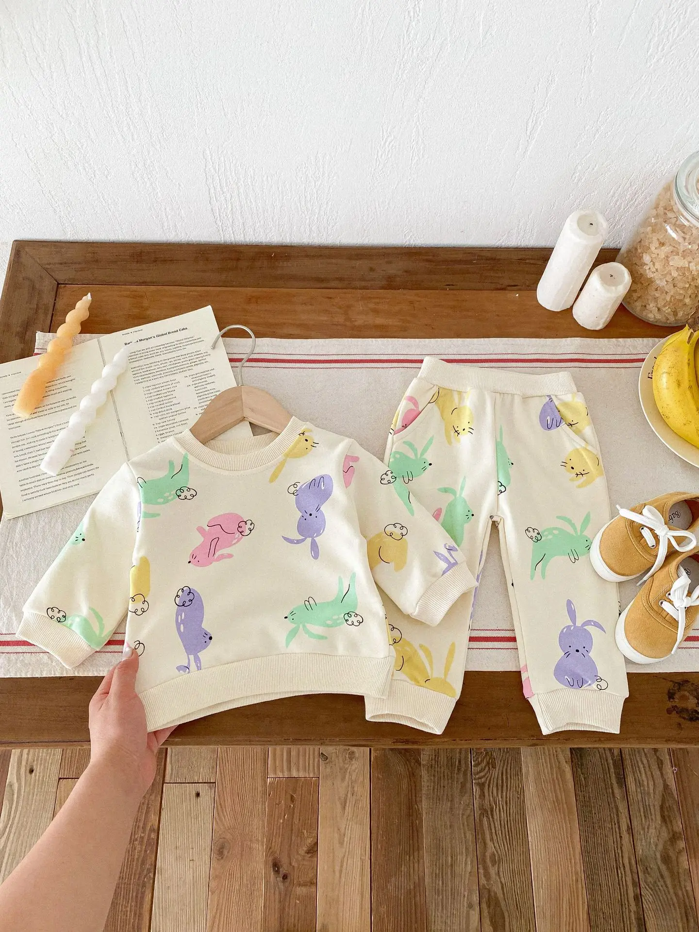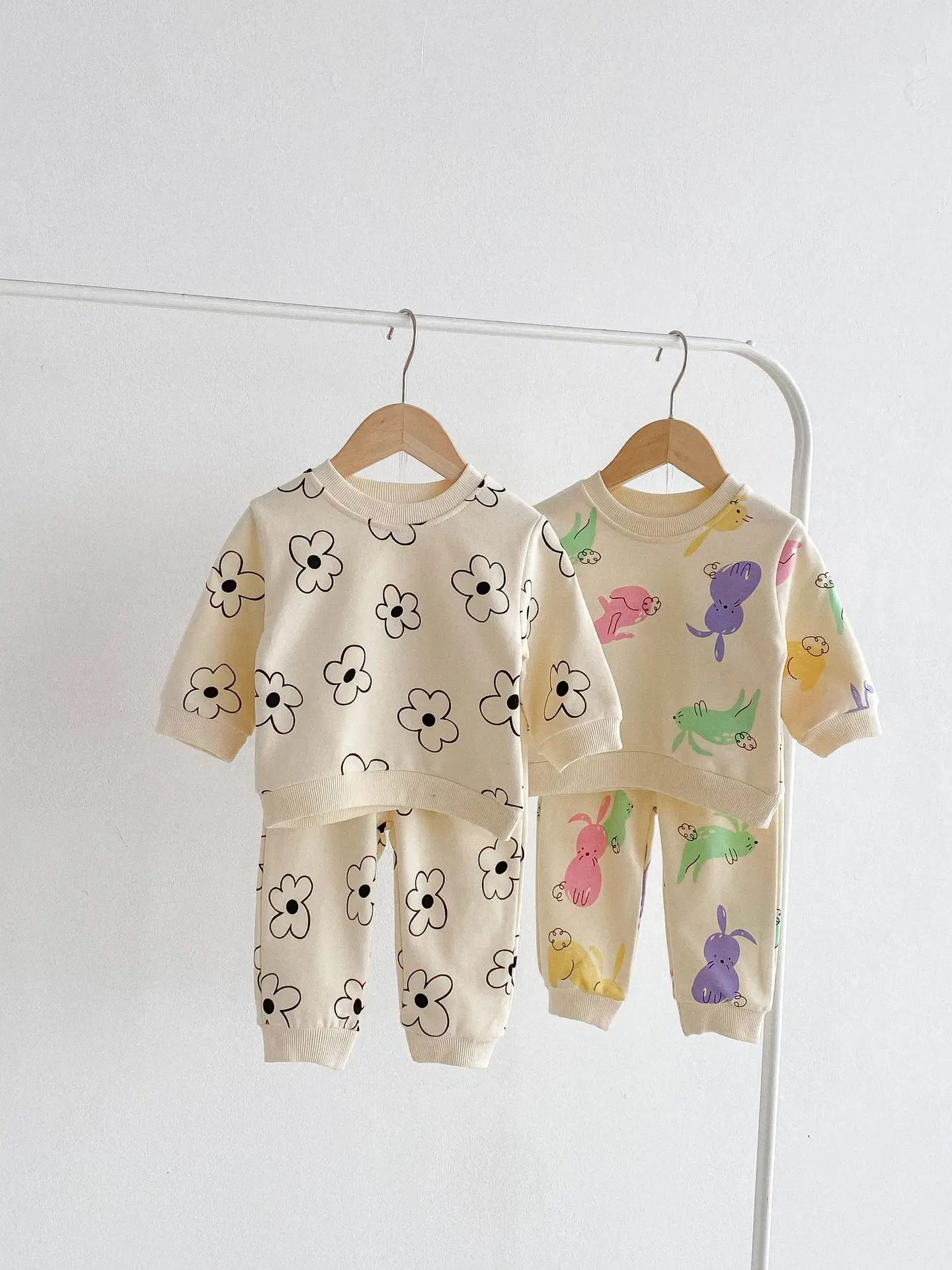 ベビーキッズセットアップ 2点セット スウェットシャツ+スウェットパンツ レトロフラワー/カラフルラビットプリント【mh0006445】