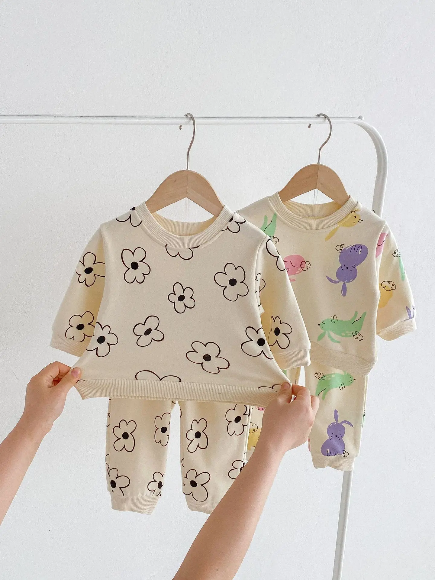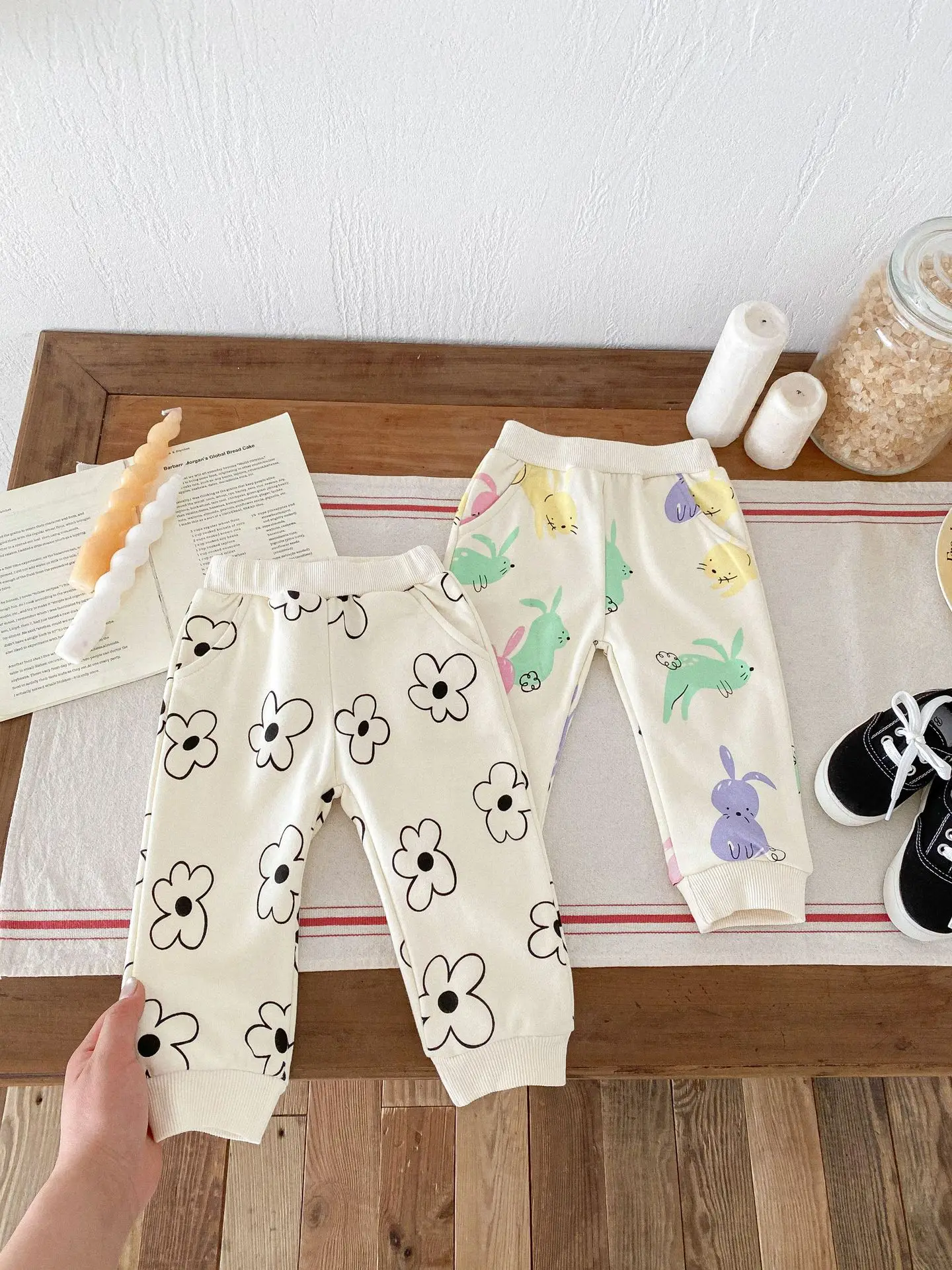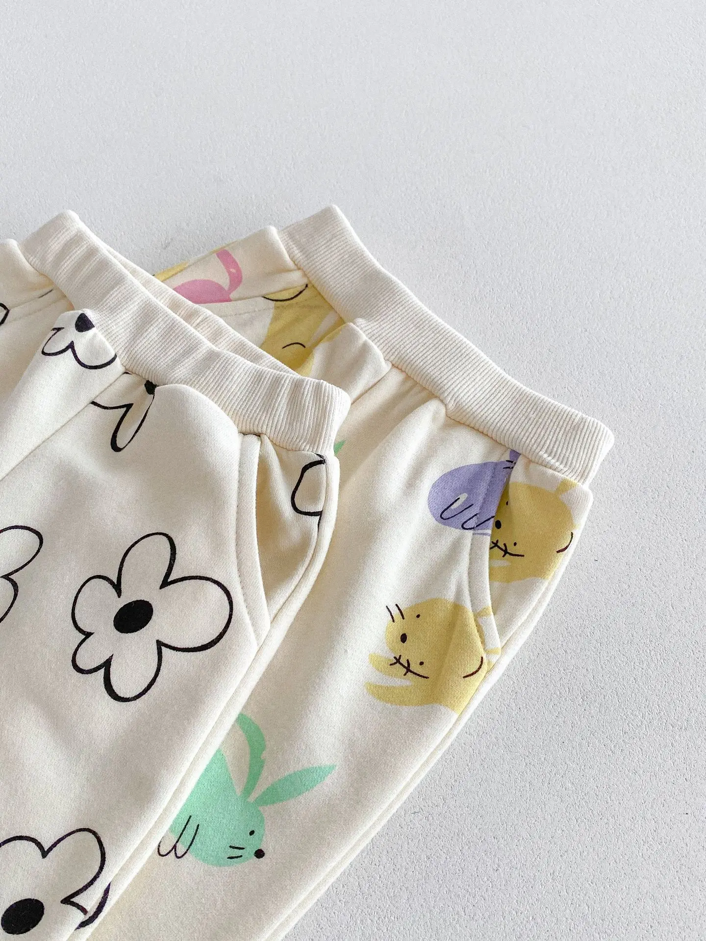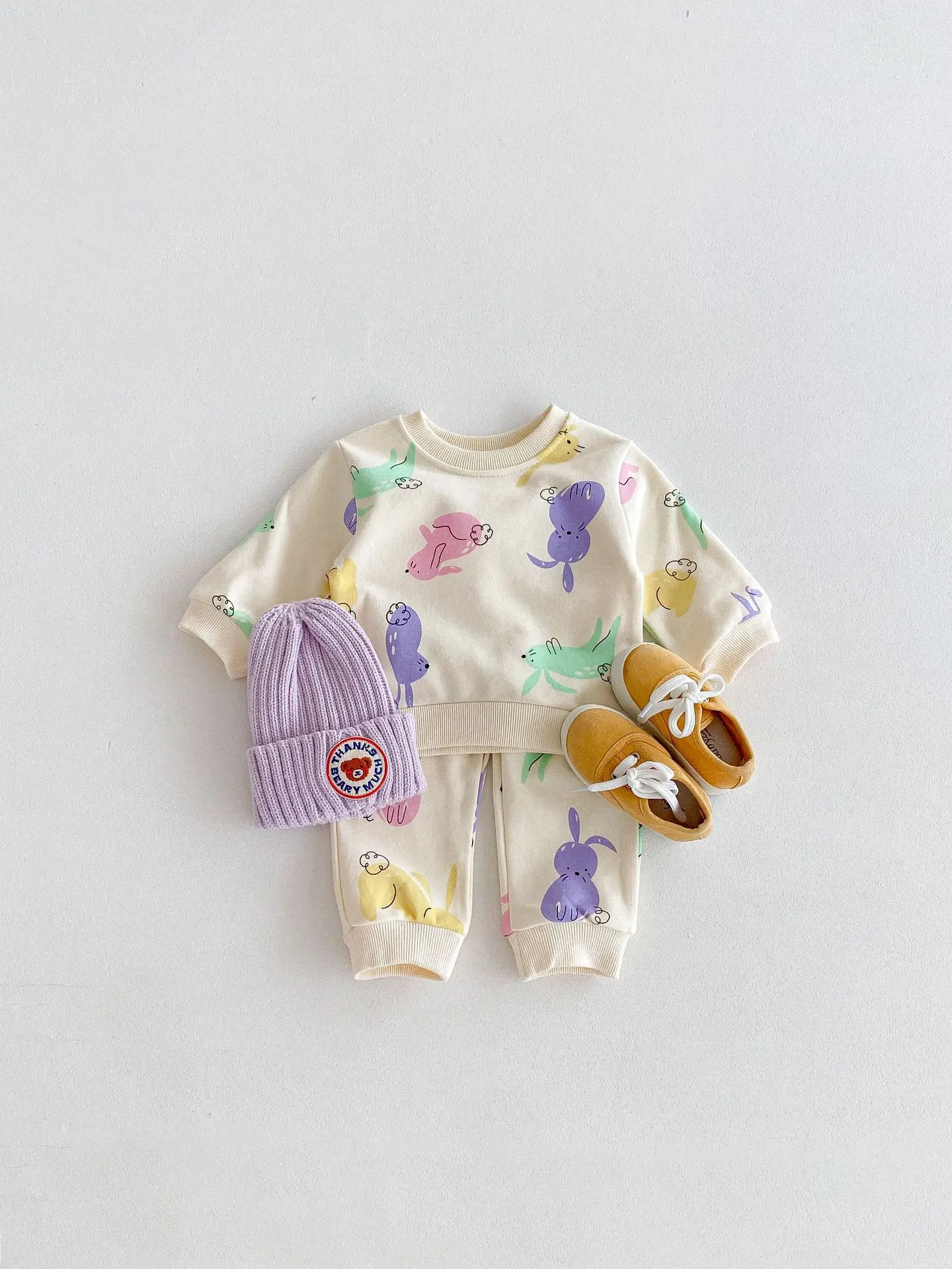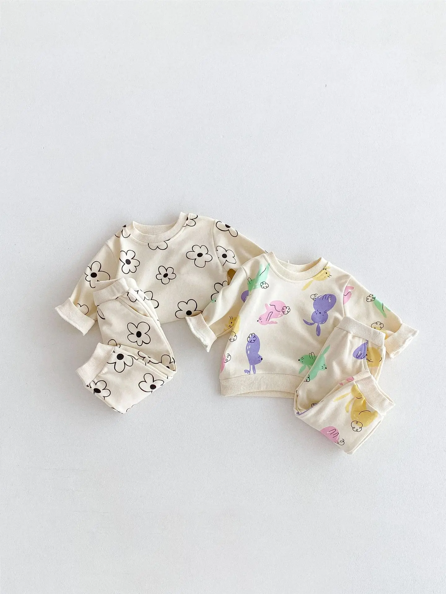 ベビーキッズセットアップ 2点セット スウェットシャツ+スウェットパンツ レトロフラワー/カラフルラビットプリント【mh0006445】