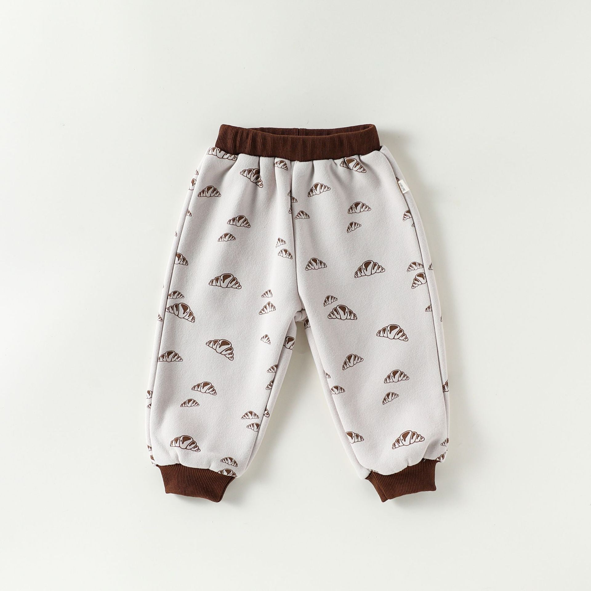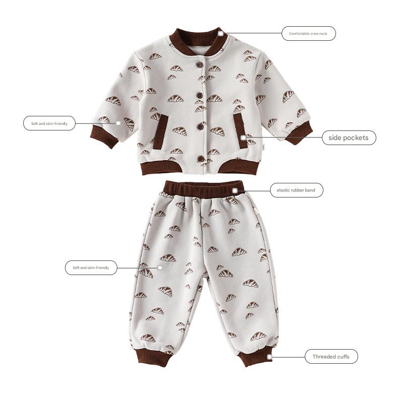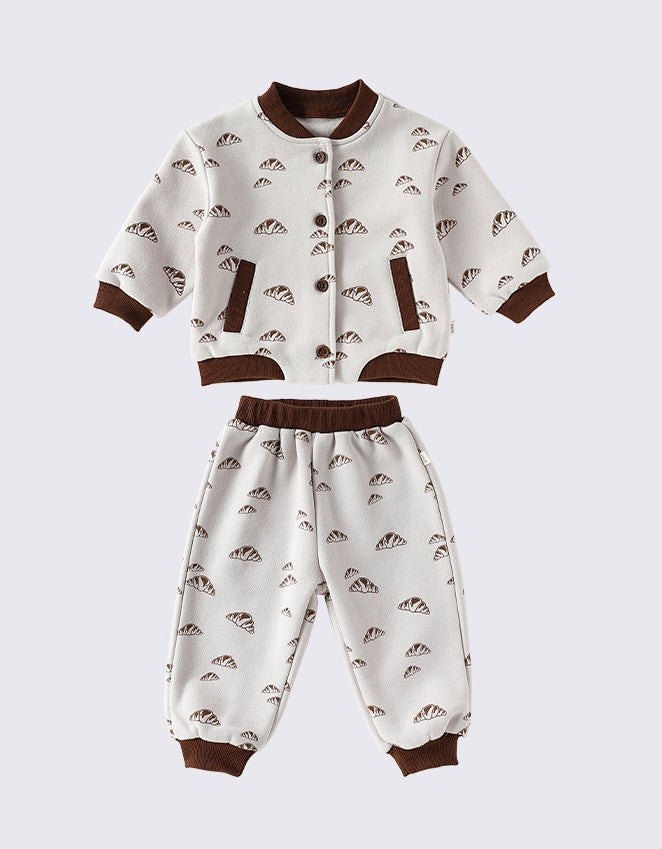 ふわふわの厚手裏起毛ジャージが優しく包み込む、ベビーの肌に心地よいぬくもりを提供するジャケットとパンツのセットアップです。愛らしいパンブレッドプリントがアクセントとなり、遊び心あふれる北欧インスパイアのスタイルが、お出かけシーンを一層おしゃれに彩ります。冬のおしゃれを楽しむ子ども服として、快適さとデザイン性を両立させたセットアップは、普段使いはもちろん、特別な日にも活躍するアイテムです。