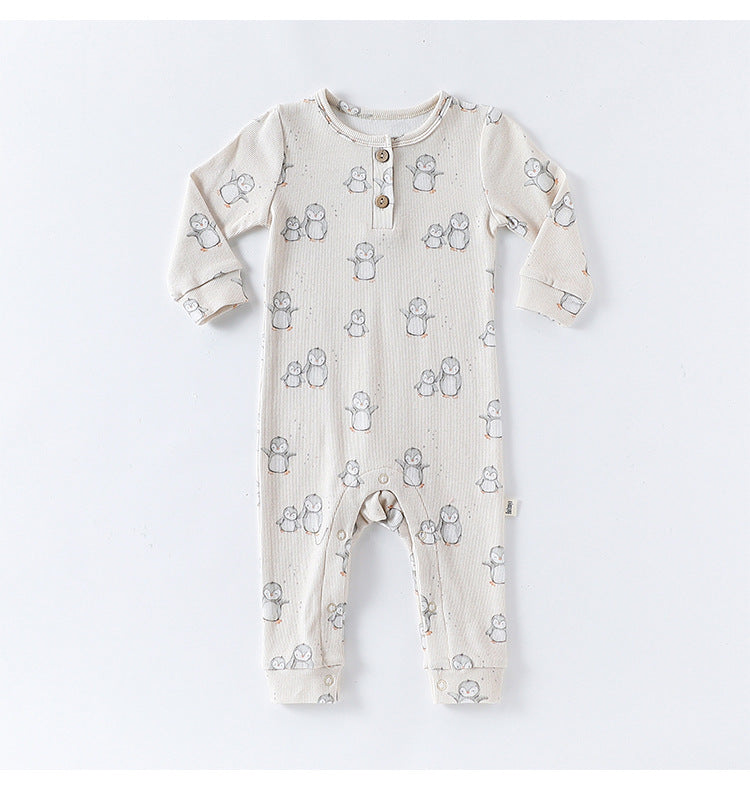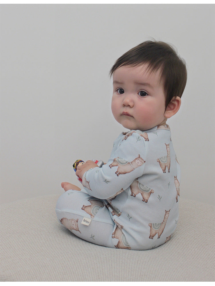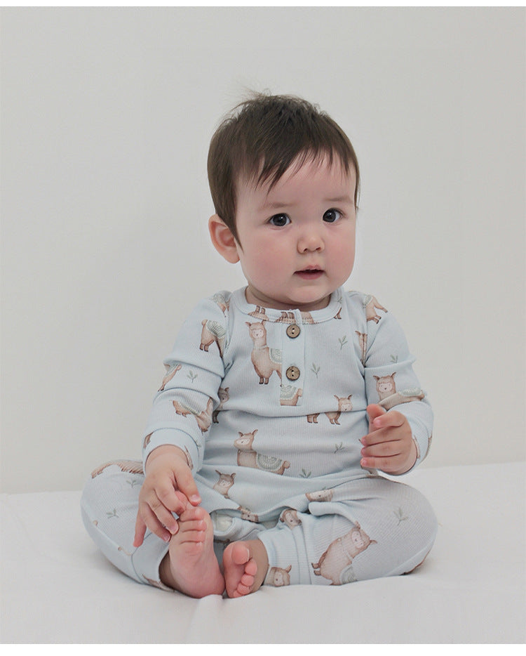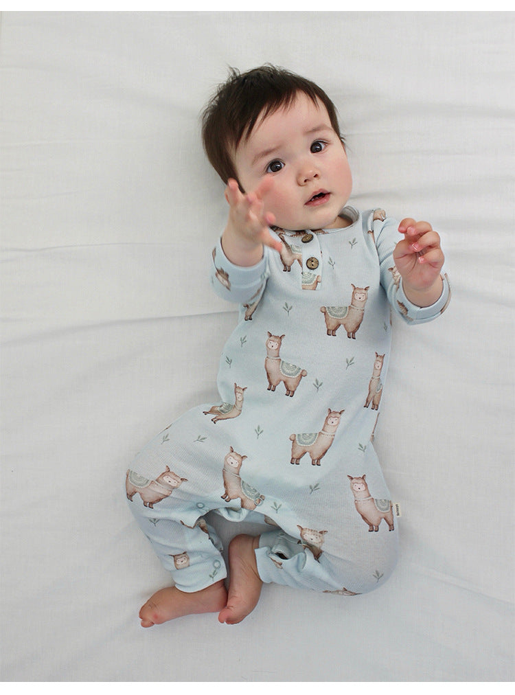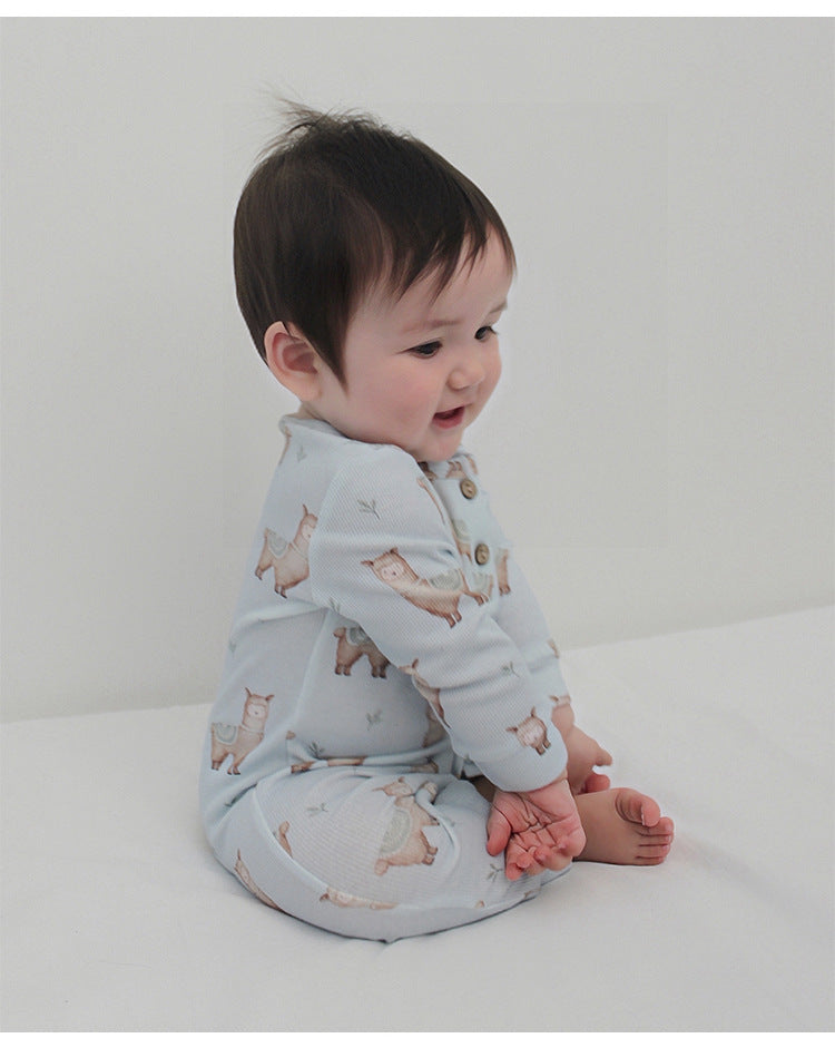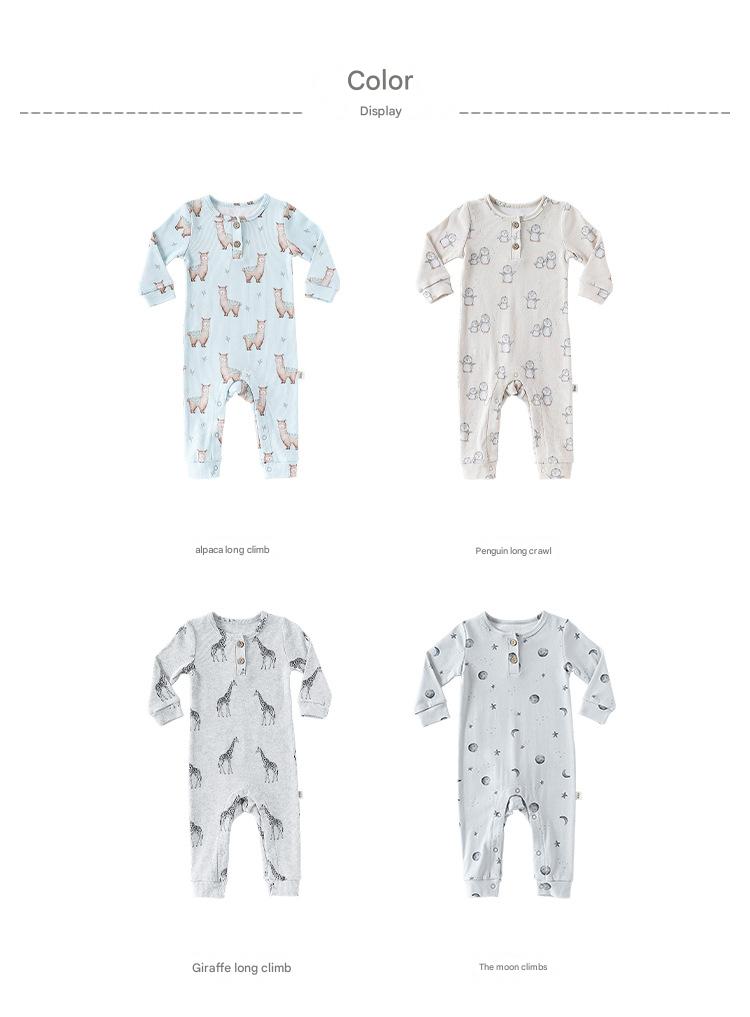 遊び心あふれるアニマルプリントが全面に施された、北欧テイストのベビー用長袖ジャンプスーツです。肌に優しい上質な素材を使用しており、ベビーの活発な動きを妨げない快適な着心地を提供します。お出かけ着としても活躍するこのロンパースは、一枚で洗練されたスタイルが完成するカバーオールとして、デイリーの装いに彩りを添えます。