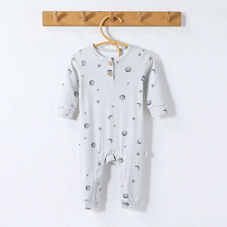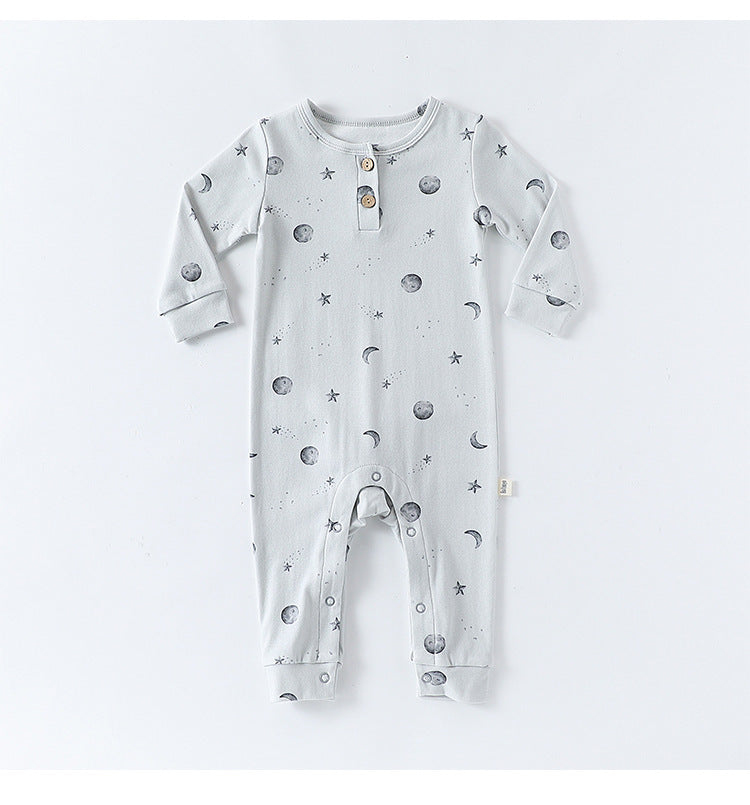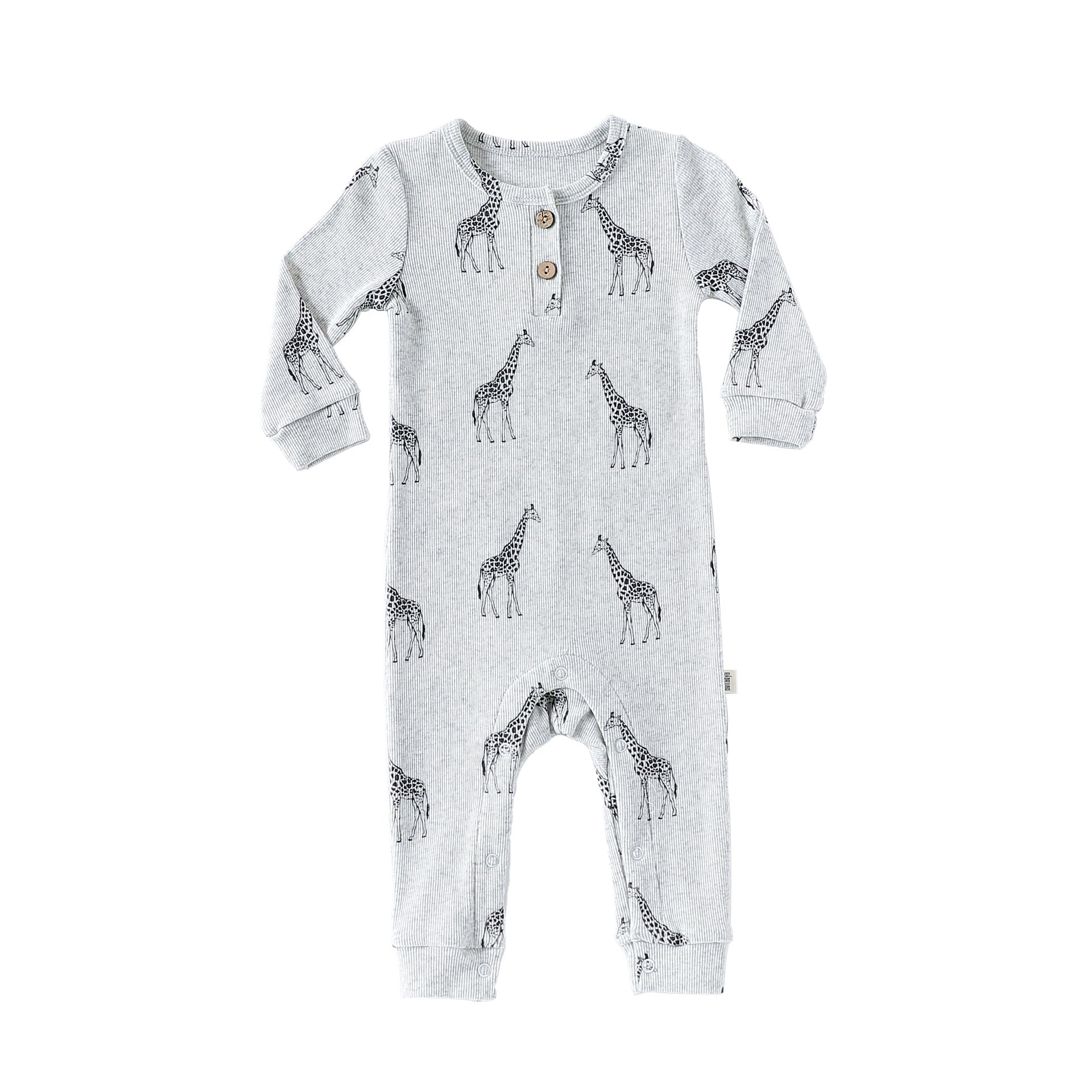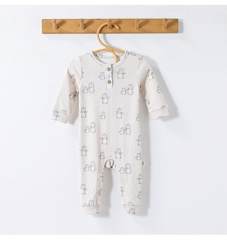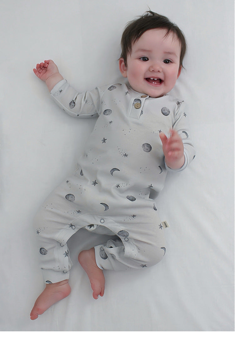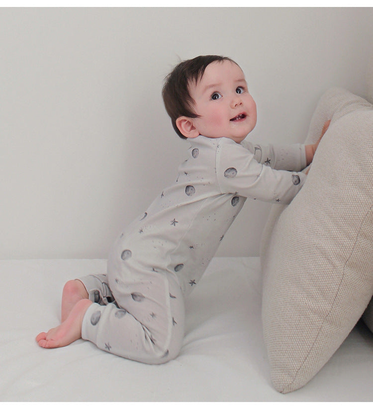 遊び心あふれるアニマルプリントが全面に施された、北欧テイストのベビー用長袖ジャンプスーツです。肌に優しい上質な素材を使用しており、ベビーの活発な動きを妨げない快適な着心地を提供します。お出かけ着としても活躍するこのロンパースは、一枚で洗練されたスタイルが完成するカバーオールとして、デイリーの装いに彩りを添えます。