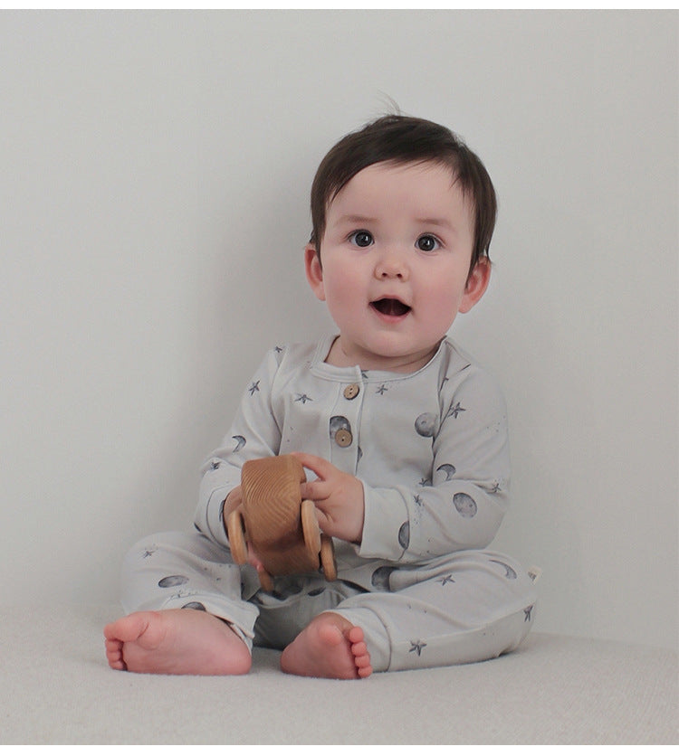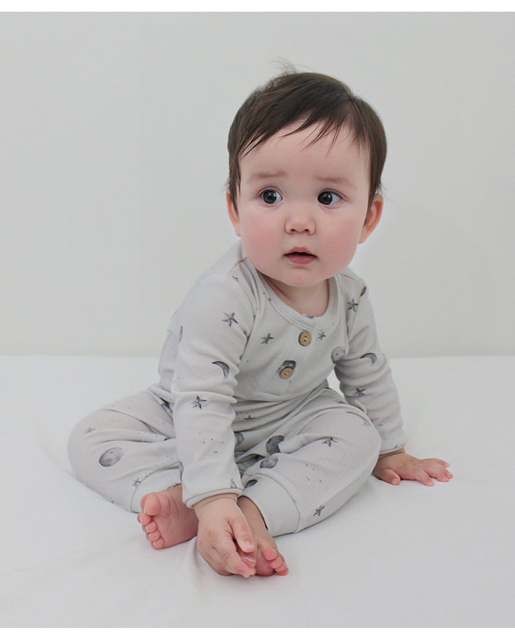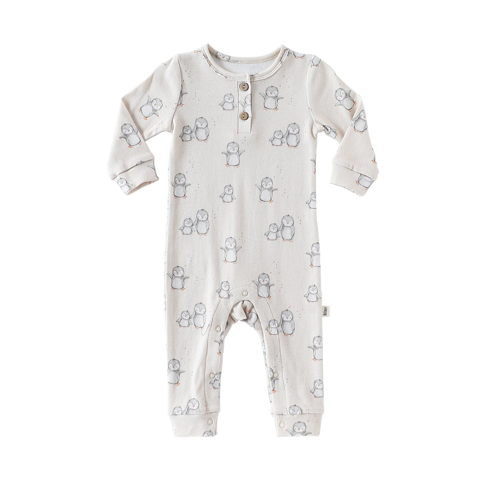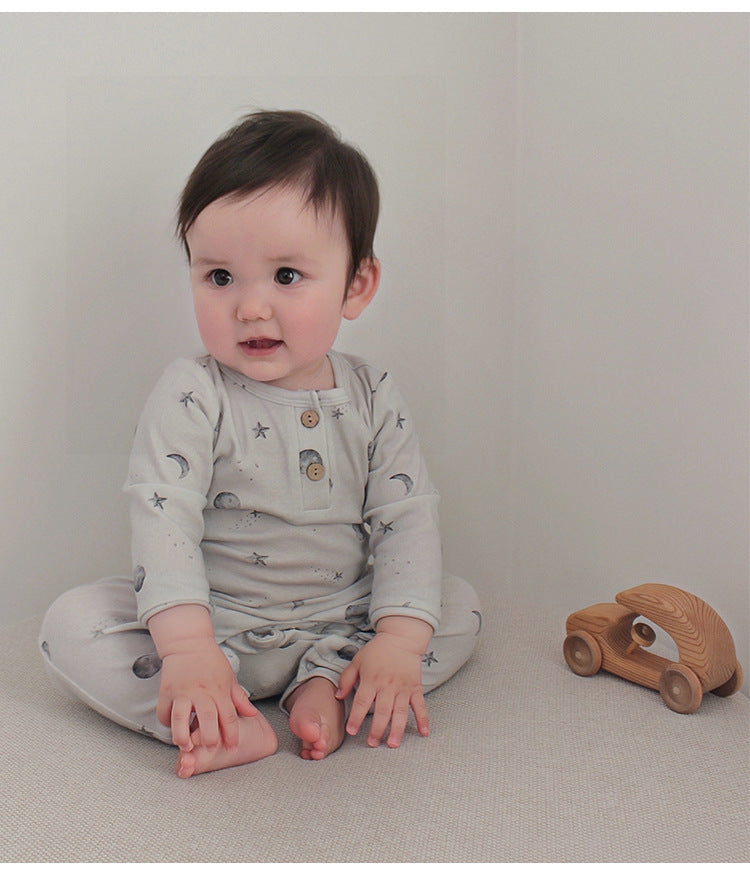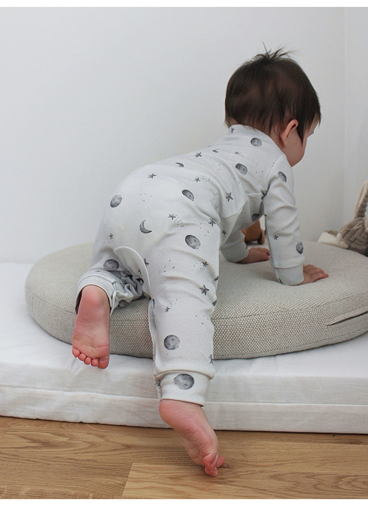 遊び心あふれるアニマルプリントが全面に施された、北欧テイストのベビー用長袖ジャンプスーツです。肌に優しい上質な素材を使用しており、ベビーの活発な動きを妨げない快適な着心地を提供します。お出かけ着としても活躍するこのロンパースは、一枚で洗練されたスタイルが完成するカバーオールとして、デイリーの装いに彩りを添えます。