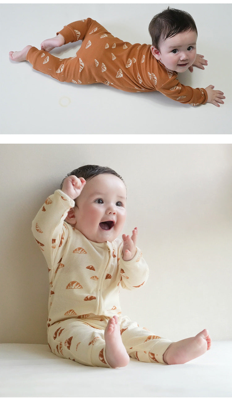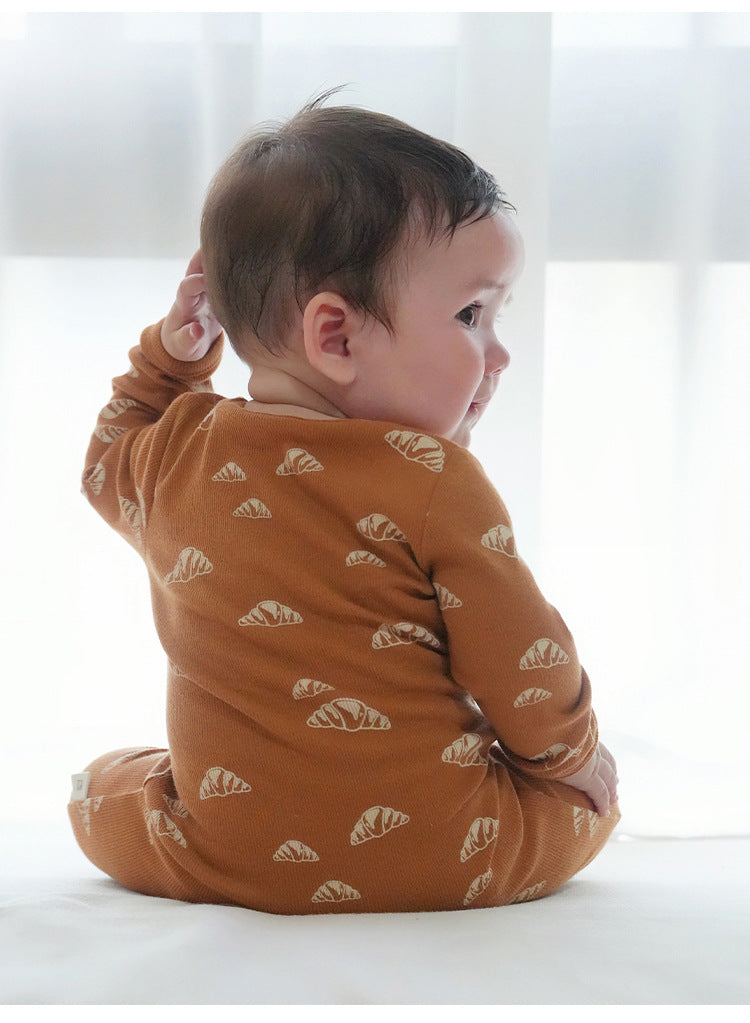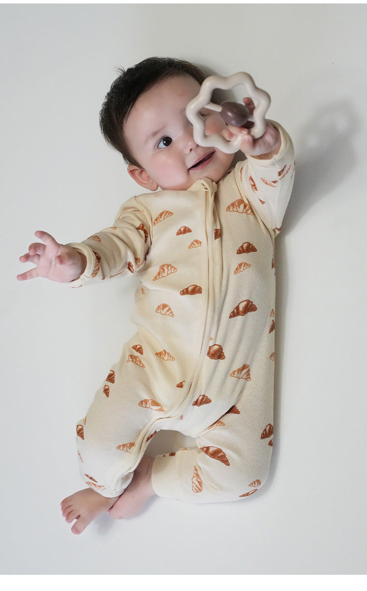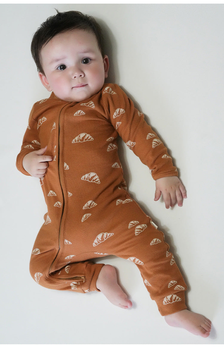 北欧インスパイアのデザインが魅力的な、ピュアコットン素材の長袖ジャンプスーツです。パンやクロワッサン、愛らしい鳥のモチーフを散りばめたプリントが、ベビーの装いに遊び心を加えます。便利なジップアップ仕様で着脱がしやすく、快適な着心地を提供するこのカバーオールは、男女問わず楽しめる洗練されたベビー服です。