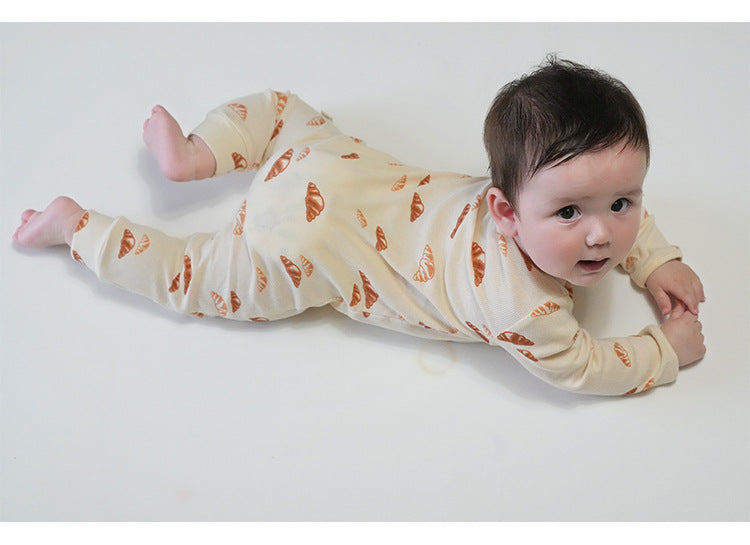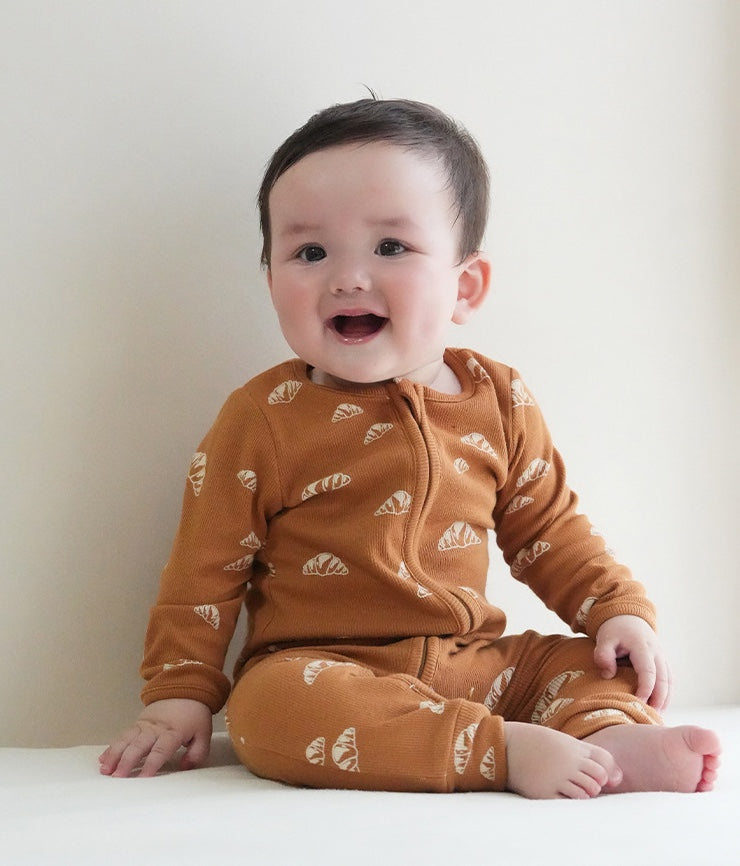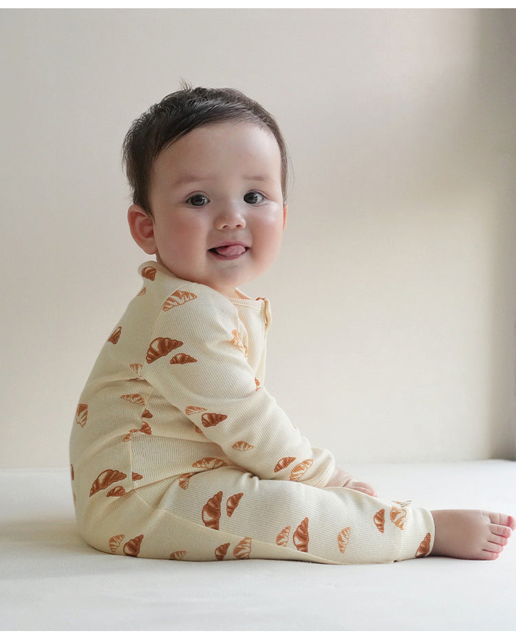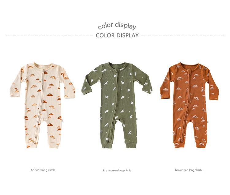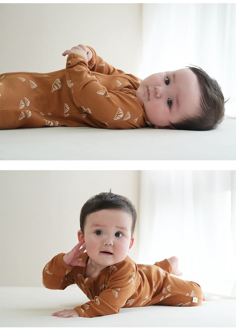 北欧インスパイアのデザインが魅力的な、ピュアコットン素材の長袖ジャンプスーツです。パンやクロワッサン、愛らしい鳥のモチーフを散りばめたプリントが、ベビーの装いに遊び心を加えます。便利なジップアップ仕様で着脱がしやすく、快適な着心地を提供するこのカバーオールは、男女問わず楽しめる洗練されたベビー服です。