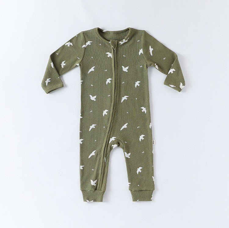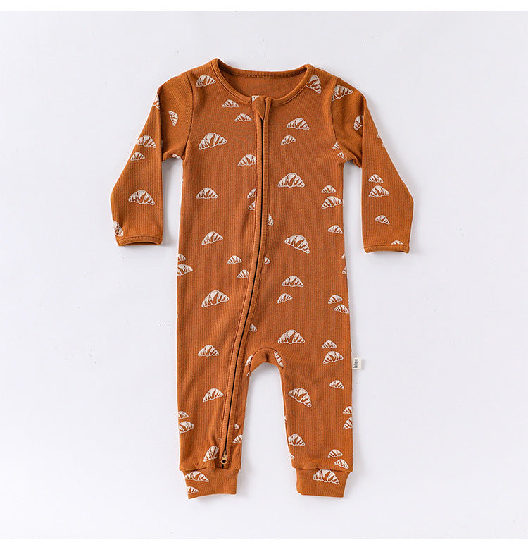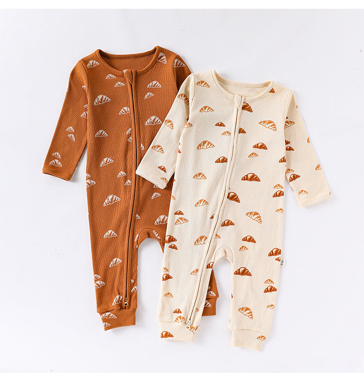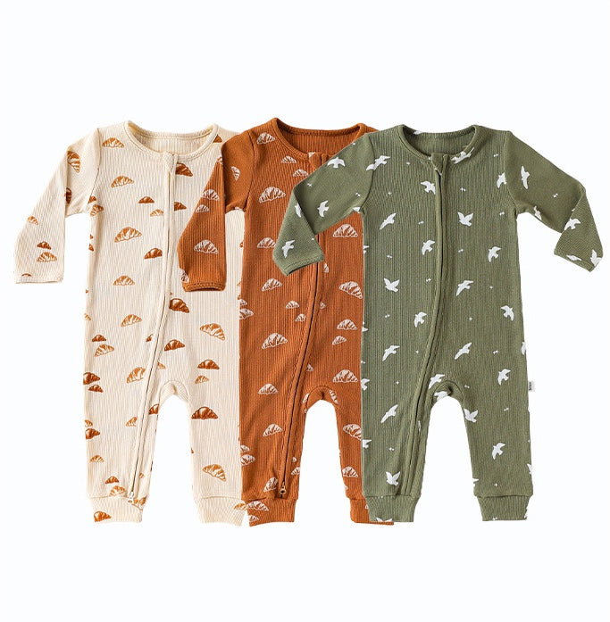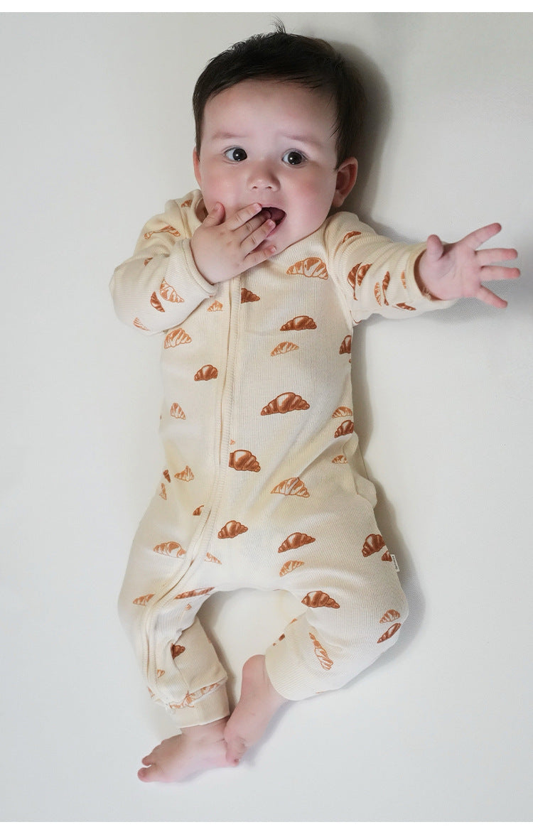 長袖ジャンプスーツ ジップアップ ブレッド クロワッサン 鳥 バード プリント カバーオール【mh0011730】