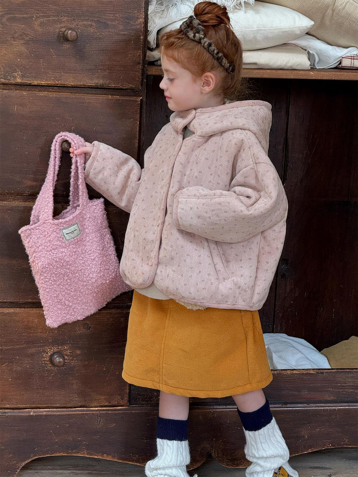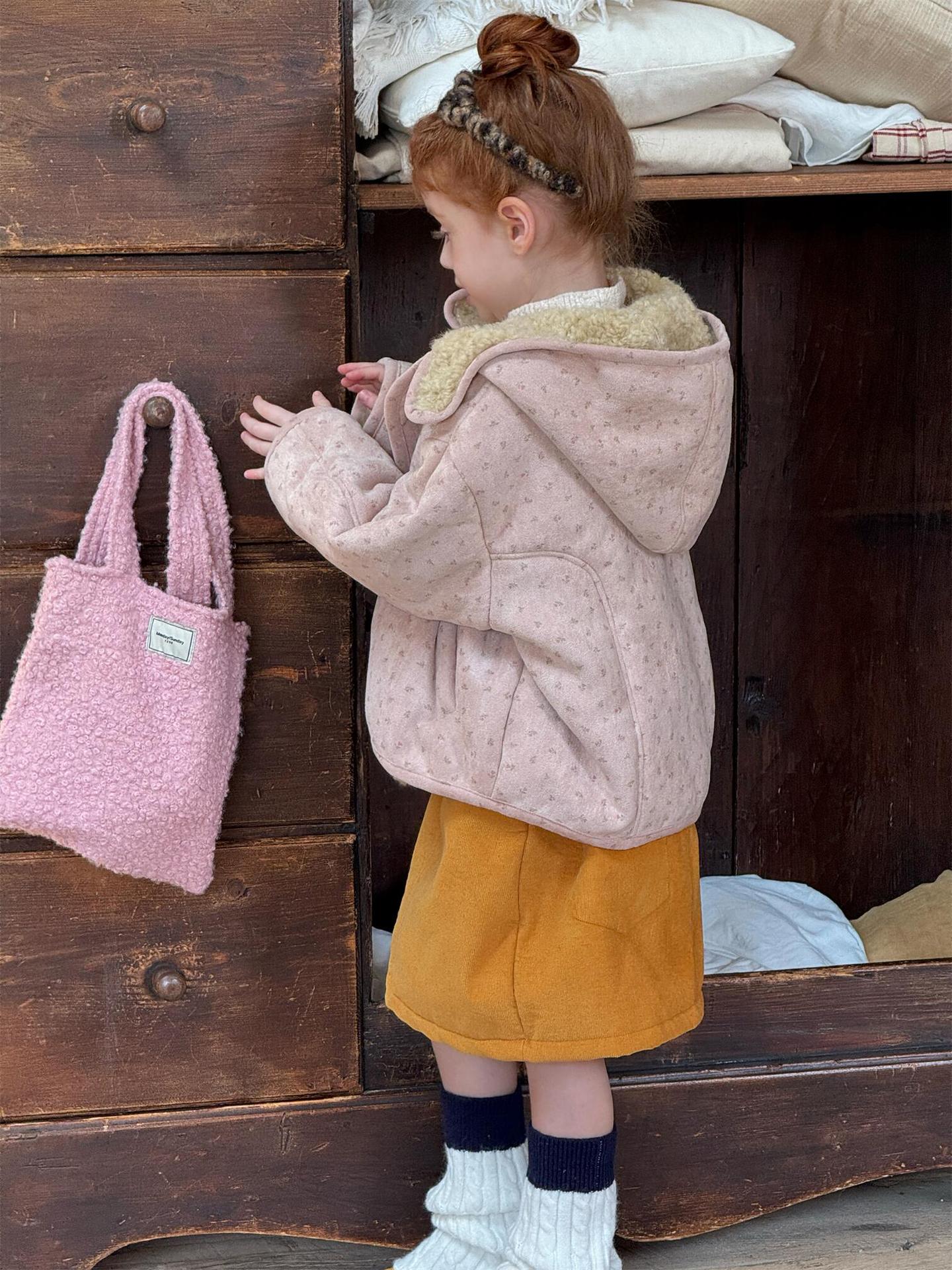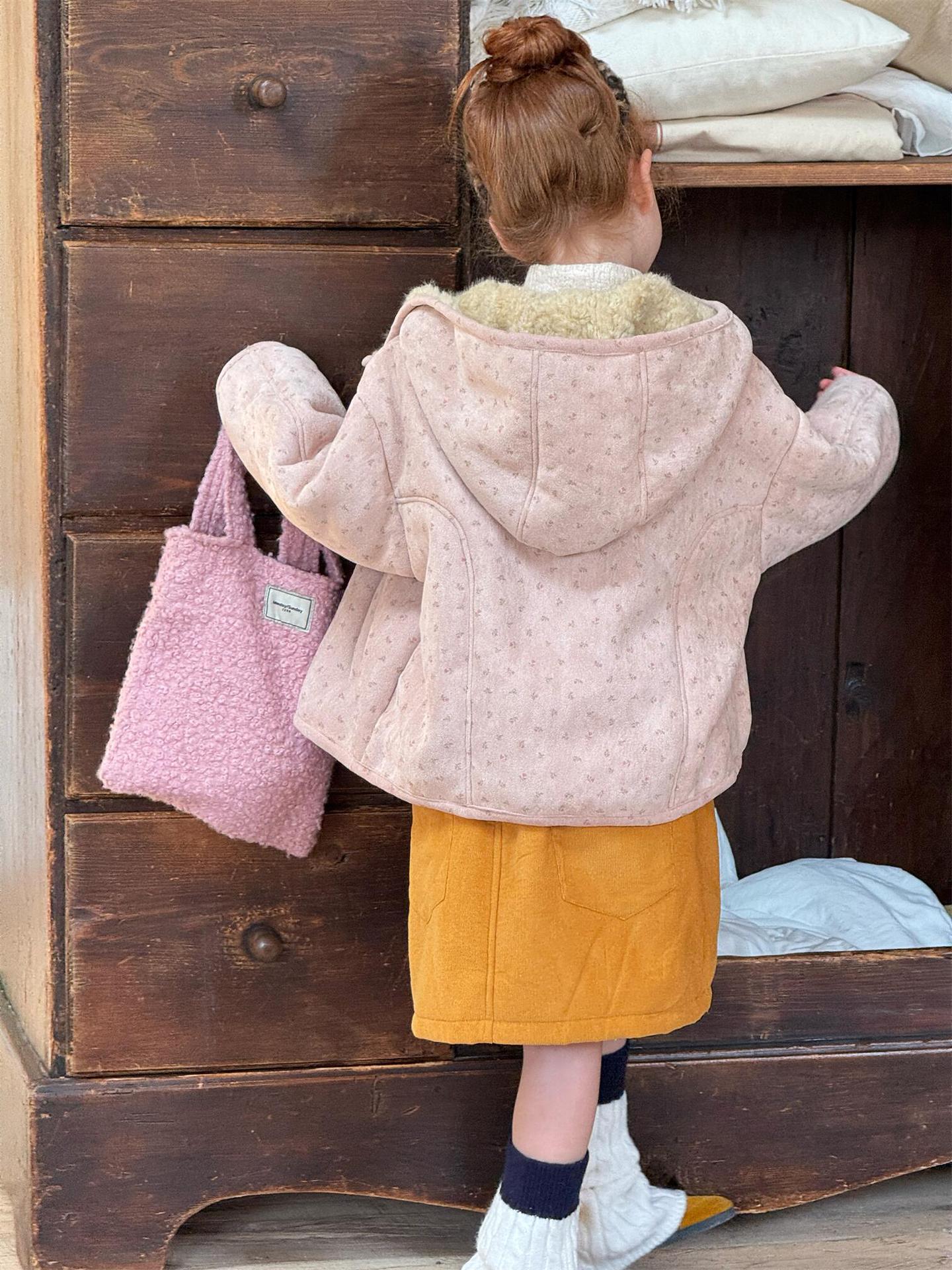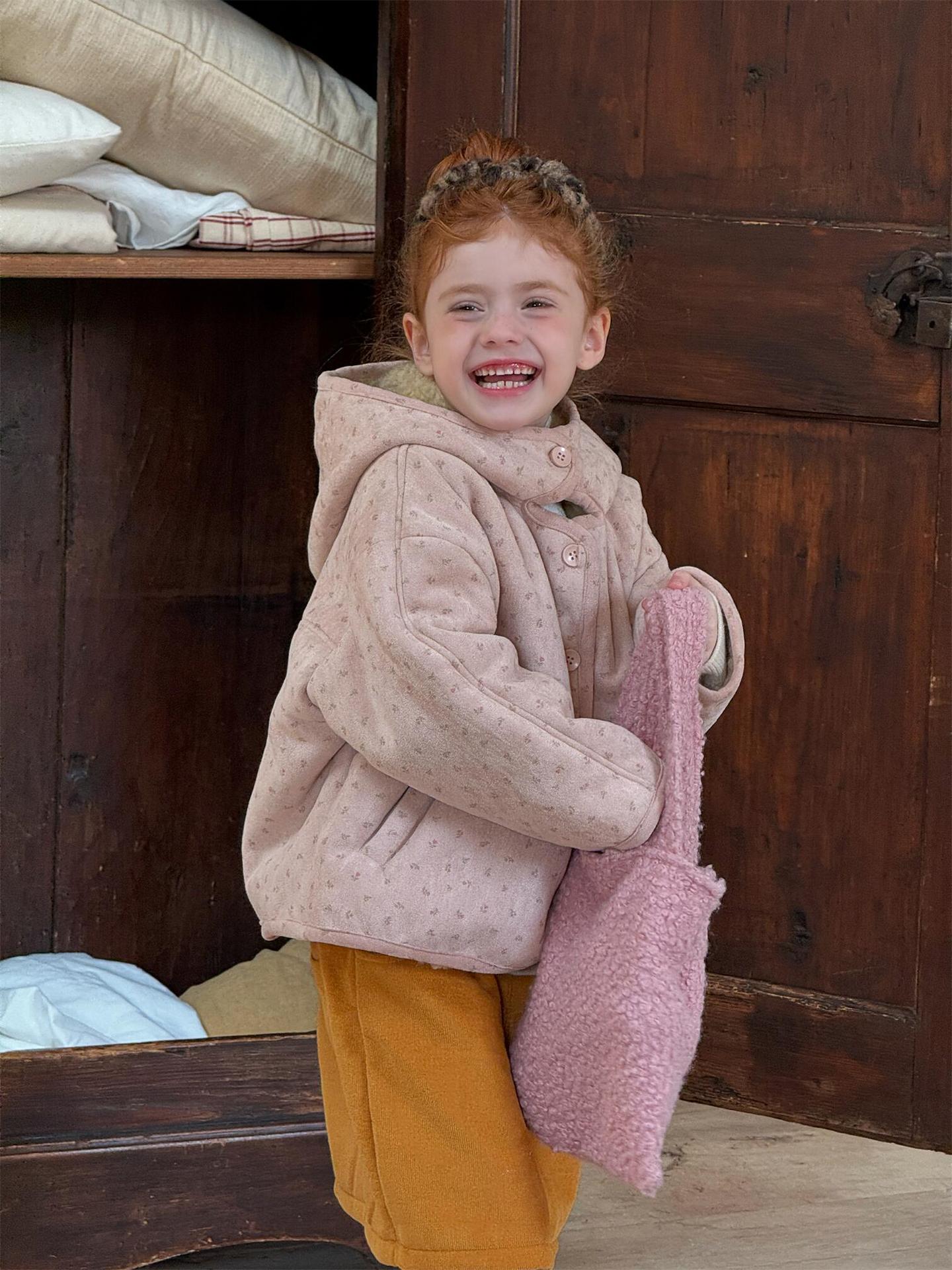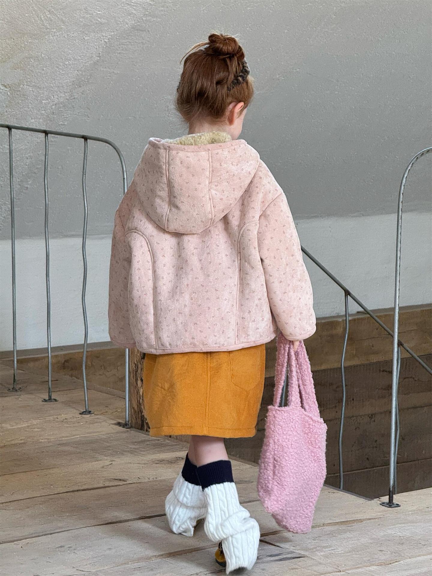 愛らしいフラワープリントが散りばめられた、フーディジャケットです。表面はスエード調の滑らかな素材感で、裏地には暖かいボアフリースを使用しているため、真冬でも快適な着心地を提供します。フード付きのデザインがカジュアルな印象を与え、ピンクの華やかな色合いがコーディネートの主役になります。暖かさと可愛らしさを兼ね備えた、冬のおしゃれに欠かせない子ども服のアウターです。